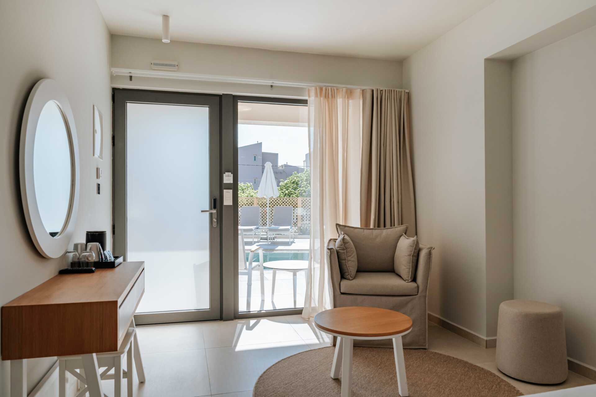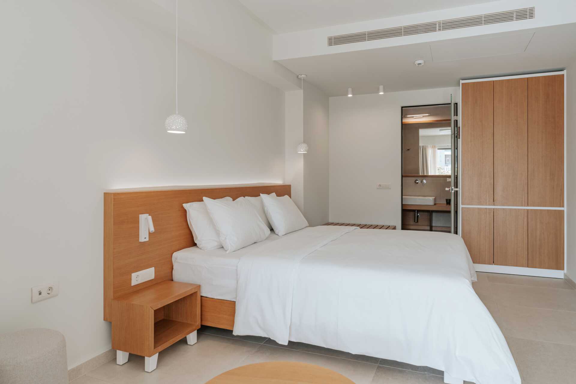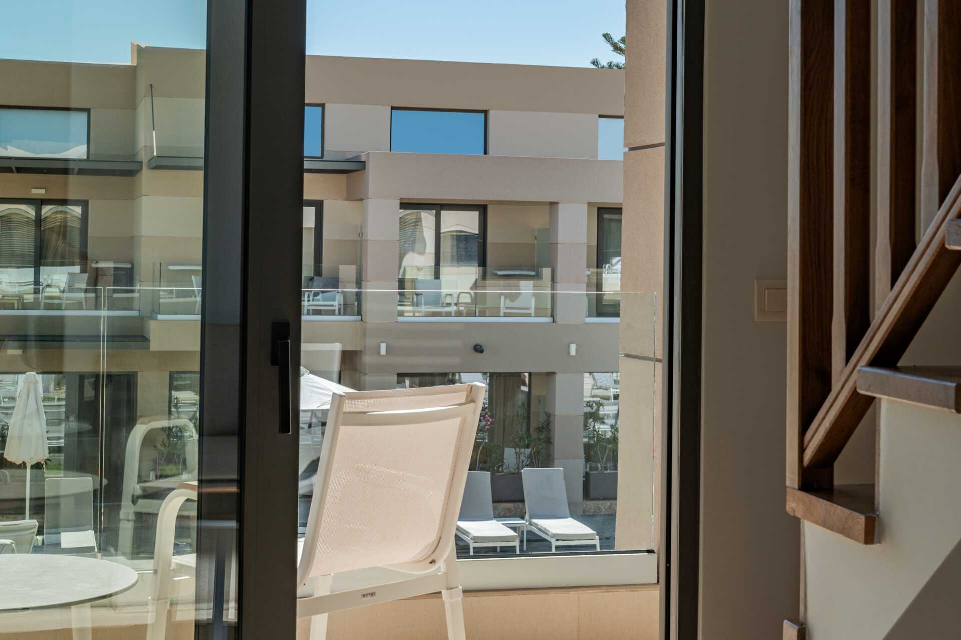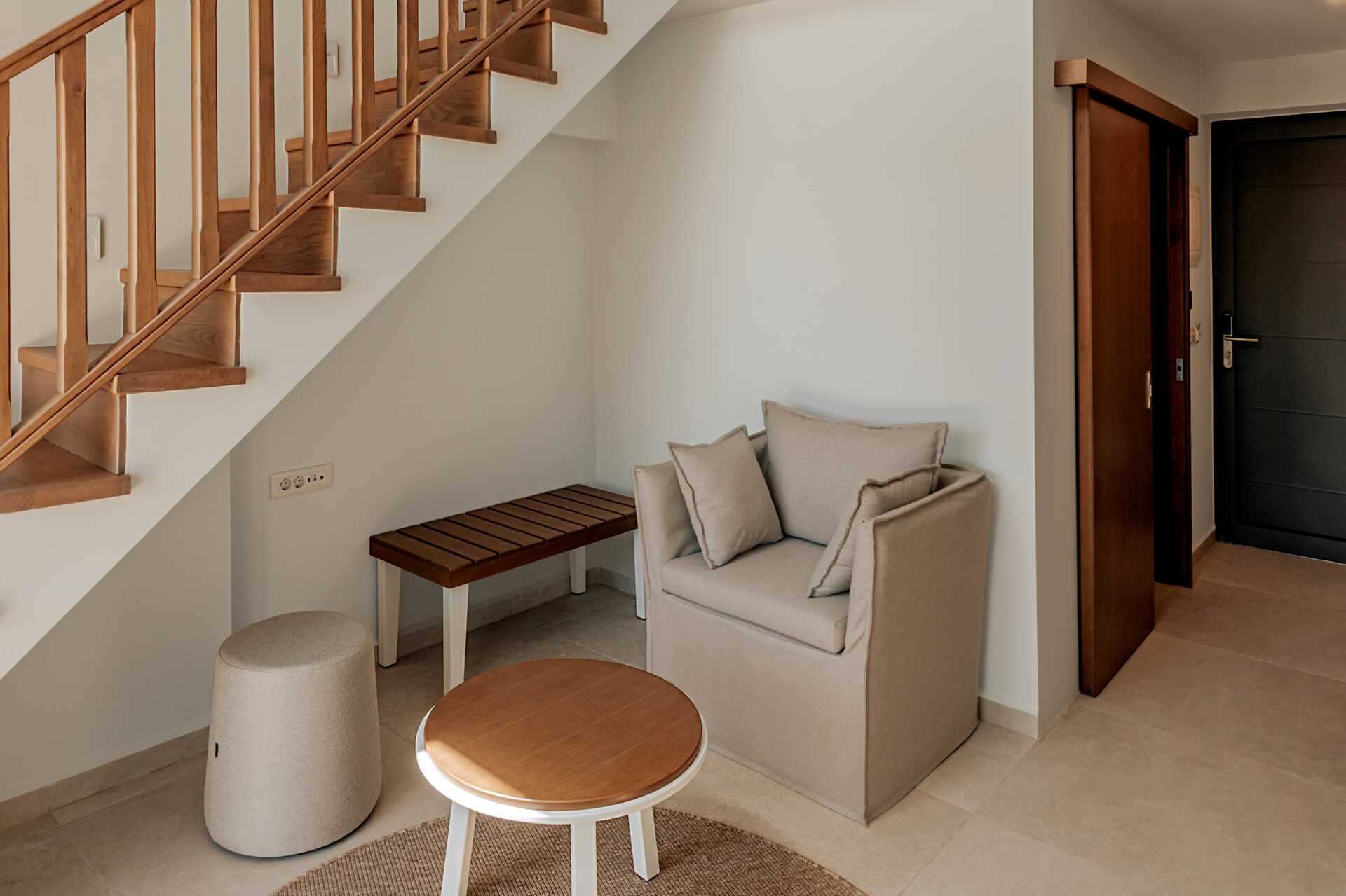Dobbeltværelse i etage med balkon, nogle med havudsigt eller pooludsigt eller med stor balkon. Værelset har en åben planløsning. I stueetagen er der et badeværelse og et lille opholdsrum. Ovenpå er der hems med dobbeltseng eller to enkeltsenge. Gratis wifi, aircondition og deponering. Køleskab, der kan fyldes som minibar og er så mod betaling. El-kedel. Tv med internationale kanaler. Badeværelse med bruser og separat toilet. Rengøring 6 gange om ugen.