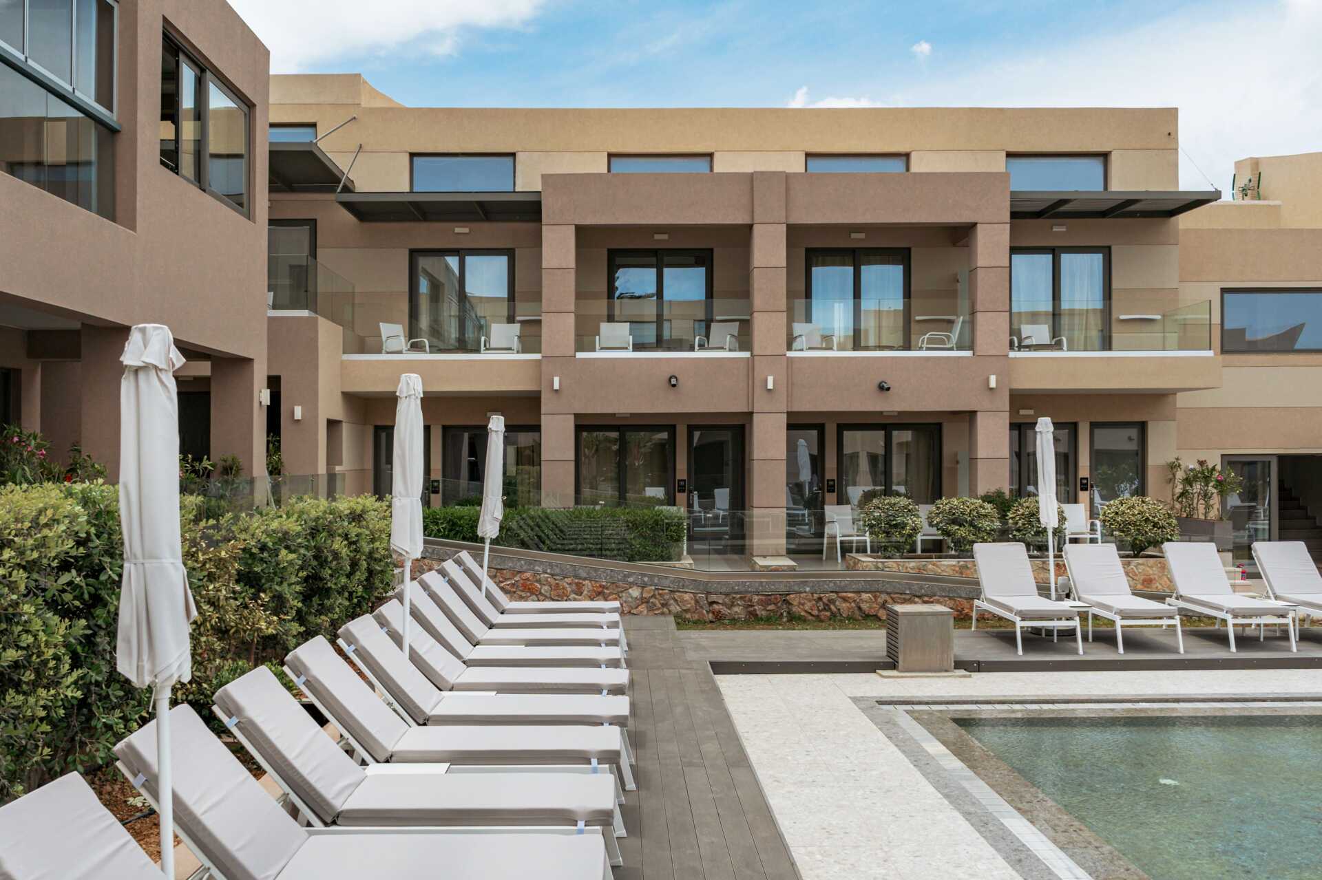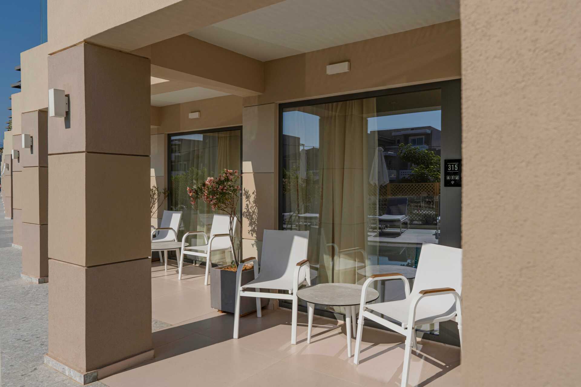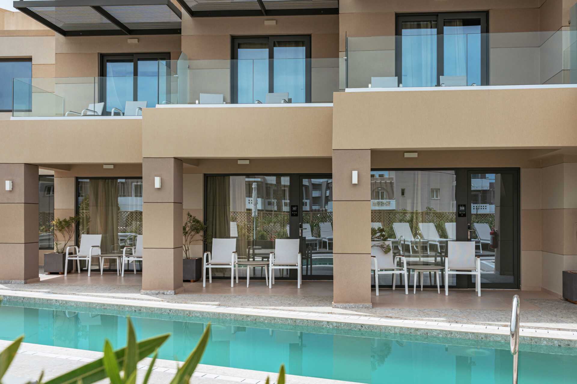 Dobbeltværelse i etage med balkon, nogle med havudsigt eller pooludsigt eller med stor balkon. Værelset har en åben planløsning. I stueetagen er der et badeværelse og et lille opholdsrum. Ovenpå er der hems med dobbeltseng eller to enkeltsenge. Gratis wifi, aircondition og deponering. Køleskab, der kan fyldes som minibar og er så mod betaling. El-kedel. Tv med internationale kanaler. Badeværelse med bruser og separat toilet. Rengøring 6 gange om ugen.