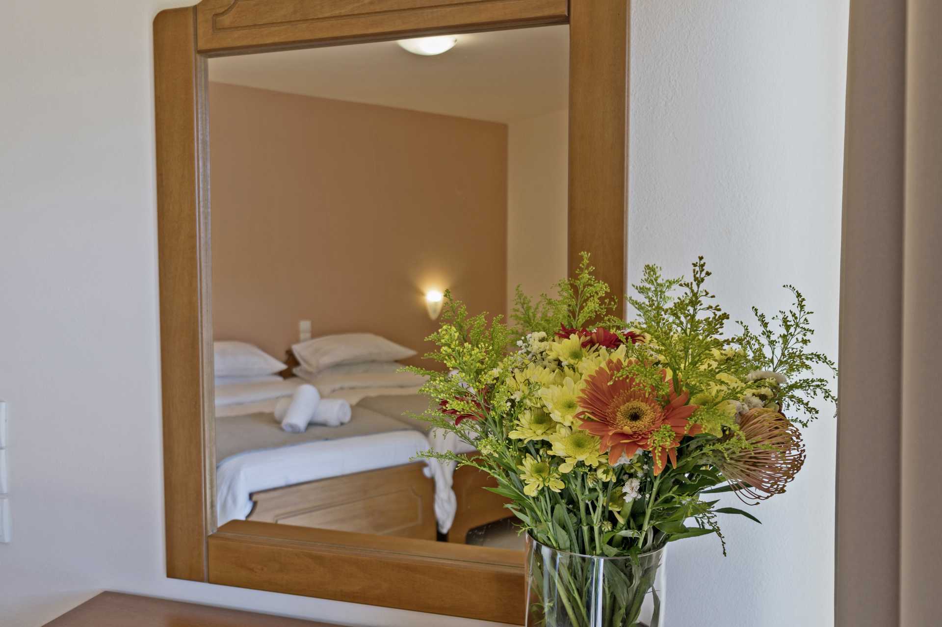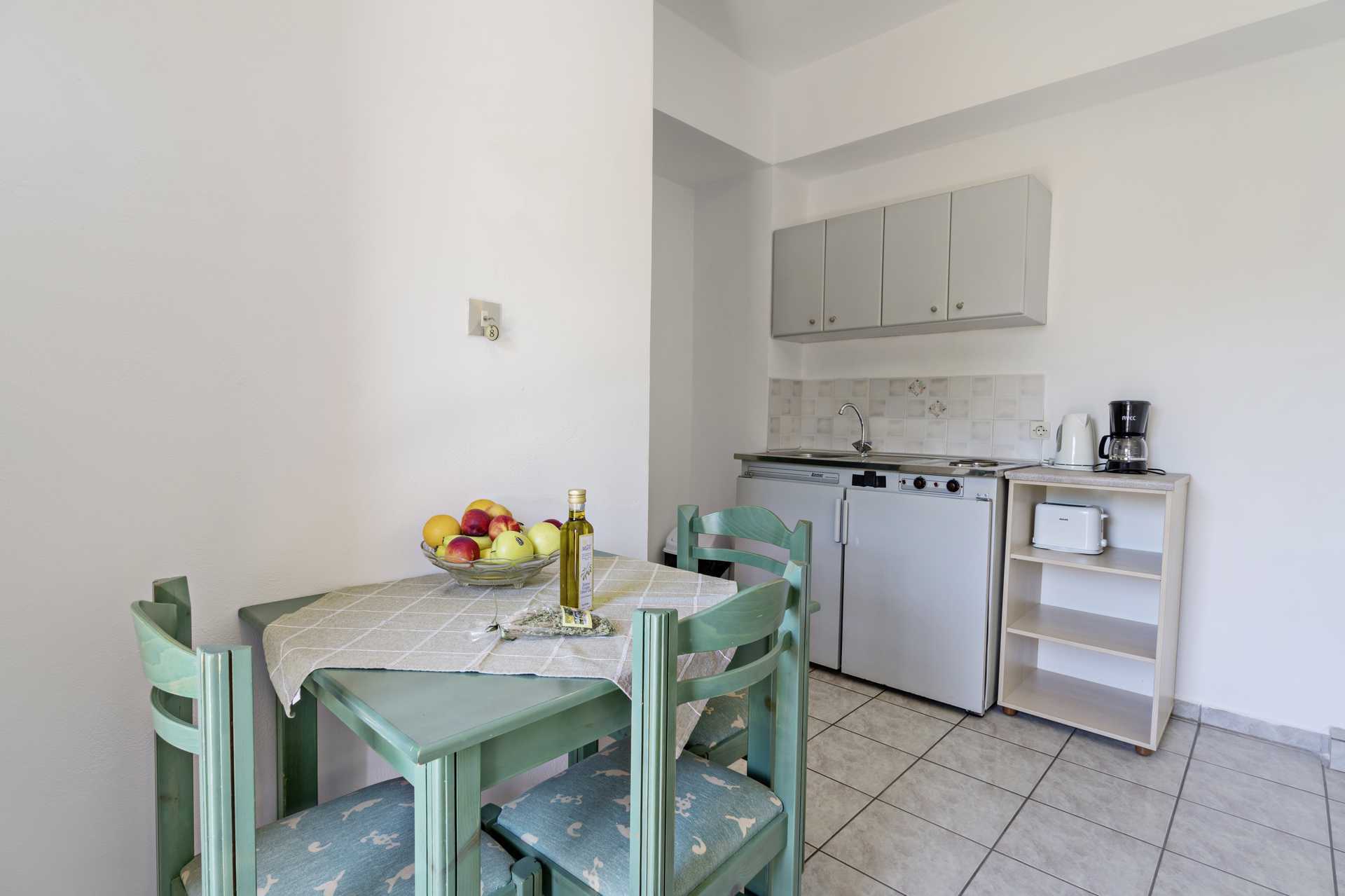 Mindre 2-værelses lejlighed med to balkoner, hvoraf den ene har havudsigt. Soveværelse og kombineret lille opholdsrum med minikøkken. To enkeltsenge. Minikøkken med kogeplader, køleskab, kaffemaskine, el-kedel, brødrister og enkelt køkkenudstyr. Gratis wifi og aircondition. Deponering mod betaling. Tv med lokale kanaler. Hårtørrer. Badeværelse med bruser og toilet. Rengøring 6 gange om ugen.