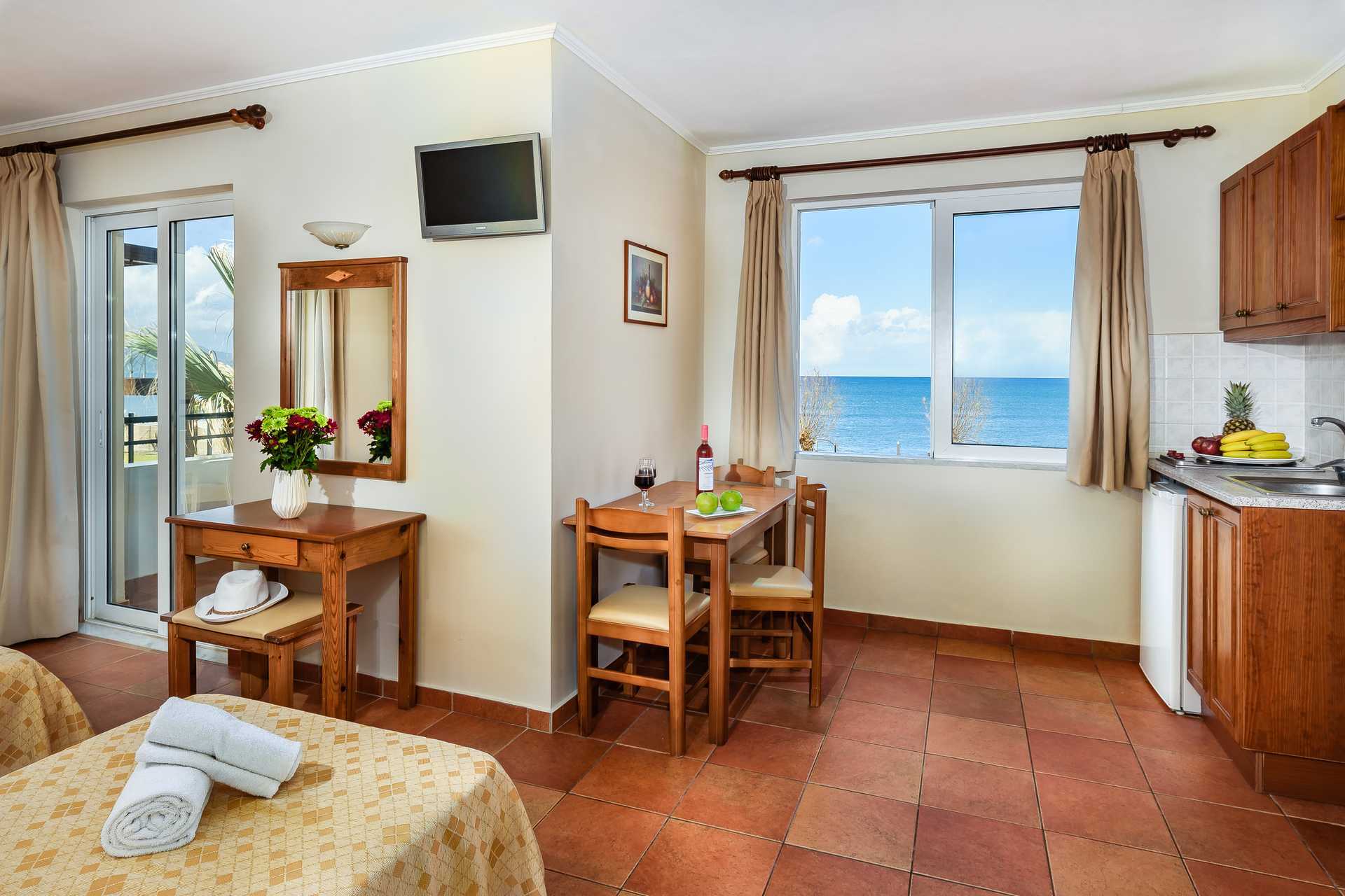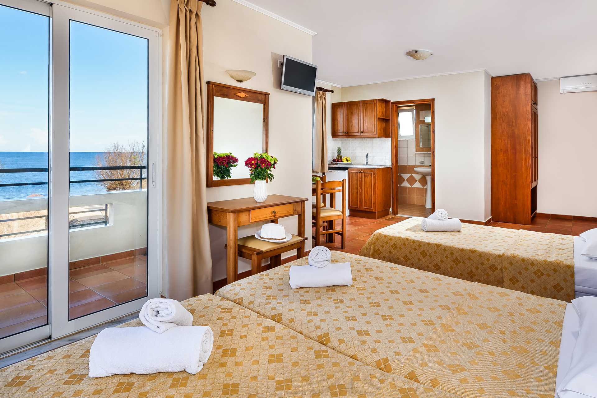 1-værelses lejlighed med balkon eller balkon i stueplan, nogle balkoner har delvis havudsigt. Kombineret soveværelse med opholdsrum og minikøkken. To enkeltsenge. Mulighed for ekstra opredning i enkeltseng. Minikøkken med køleskab, kogeplader, mikrobølgeovn og enkelt køkkenudstyr. Gratis wifi og aircondition. Deponering mod betaling. Badeværelse med bruser og toilet. Rengøring 6 gange om ugen.