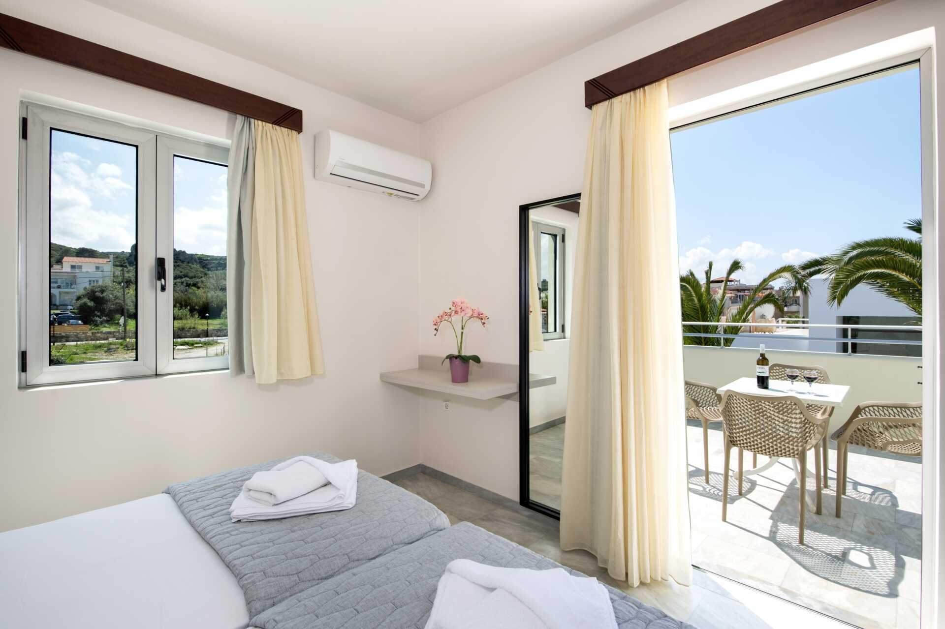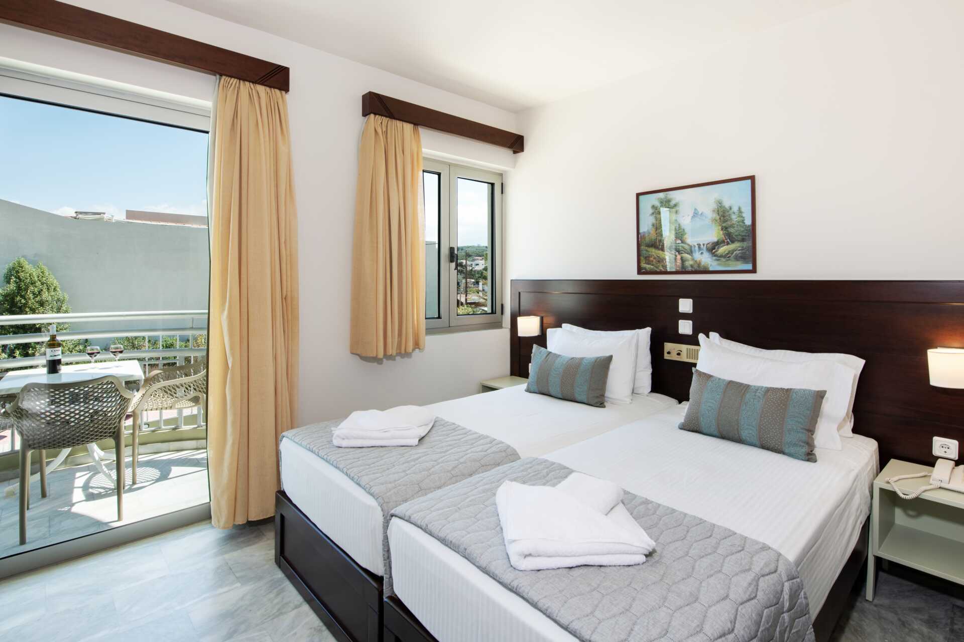 1-værelses lejligheder beliggende i strand-/poolbygningen. Balkon, nogle med havudsigt eller med delvis havudsigt. Kombineret soveværelse og minikøkken. To enkeltsenge. Mulighed for ekstra opredning i sovesofa. Lejlighederne er der en flaske vin og en flaske vand ved ankomst. Minikøkken med kogeplader, køleskab, kaffemaskine, el-kedel, brødrister og enkelt køkkenudstyr. Gratis wifi, aircondition og deponering. Tv med internationale kanaler. Strygejern og strygebræt. Badekåber og tøfler. Hårtørrer. Badeværelse med bruser og toilet. Rengøring 6 gange om ugen.