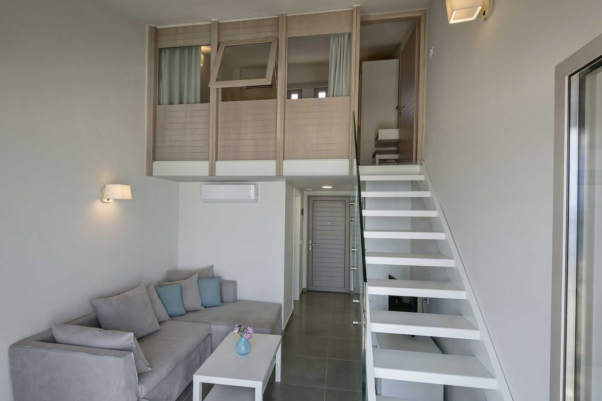 2-værelses lejlighed i etage med balkon og havudsigt. Myggenet ved balkondøren. I entréplan er der kombineret opholdsrum/minikøkken med kogeplader, køleskab og enkelt køkkenudstyr. Mulighed for ekstra opredninger i sovesofa. Ovenpå er der et soveværelse med en dobbeltseng. Gratis wifi, aircondition og deponering. Tv med internationale kanaler. Hårtørrer. Badeværelse med bruser og toilet. Rengøring 6 gange om ugen. Børn under to år tæller med i det maksimale antal personer på værelset.
