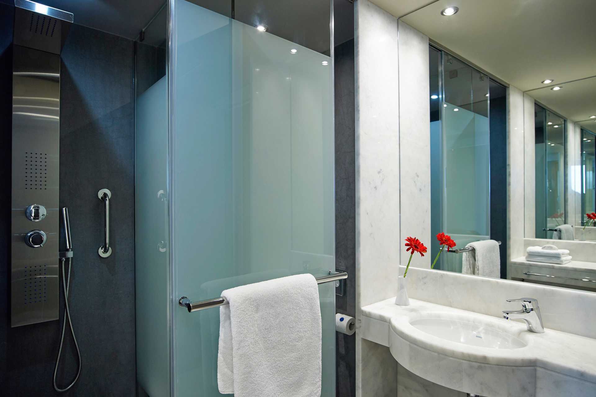 Enkeltværelser med balkon. En dobbeltseng. Gratis wifi, aircondition og deponering. Minibar. El-kedel og kaffe/te. Tv med internationale kanaler. Badekåbe og tøfler. Hårtørrer. Badeværelse med bruser og toilet. Rengøring 7 gange om ugen.