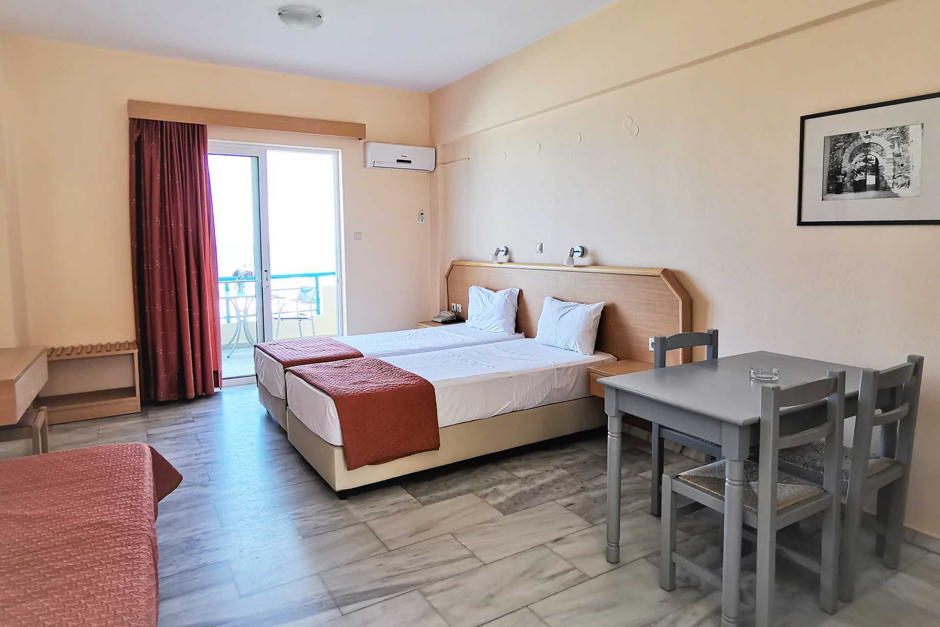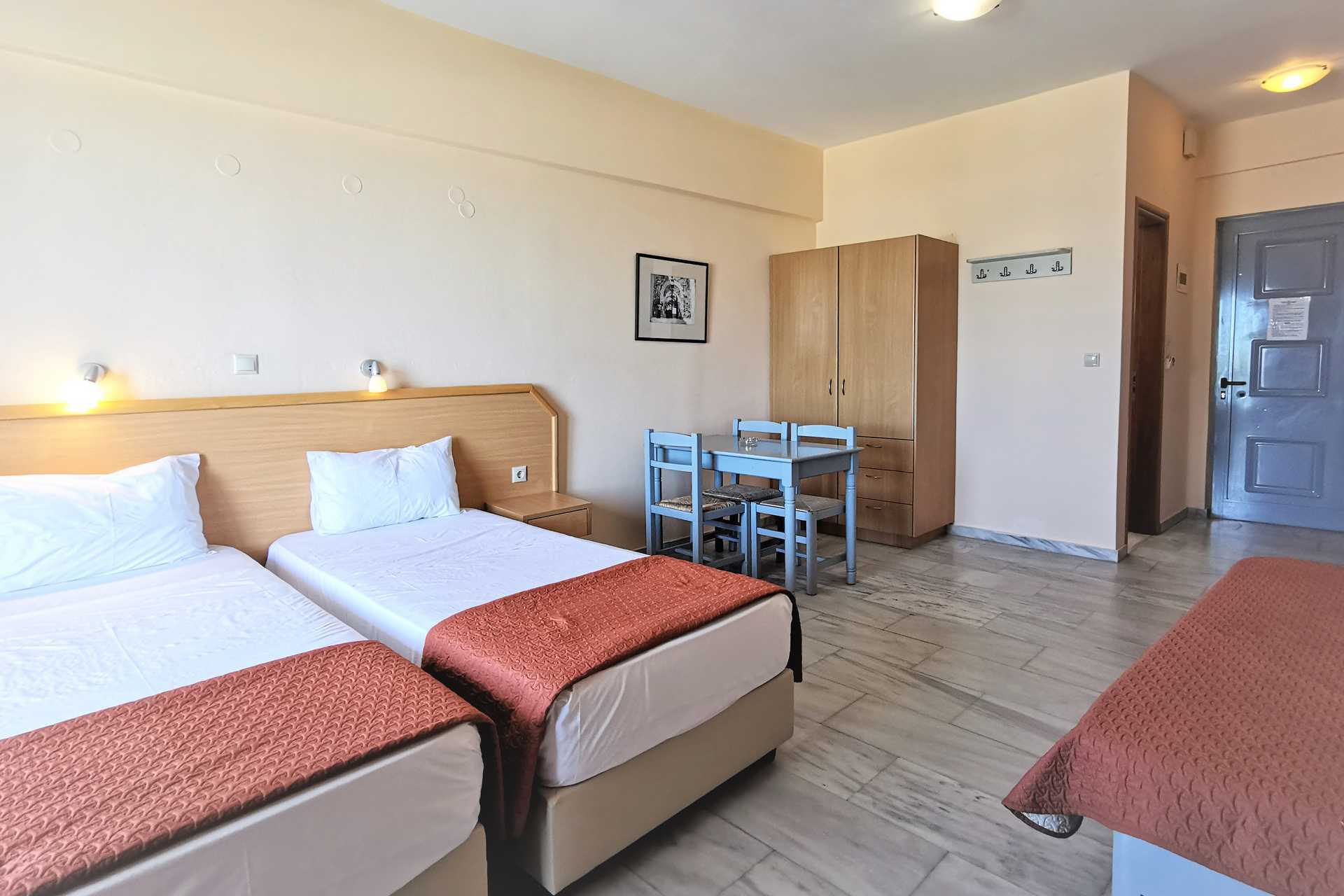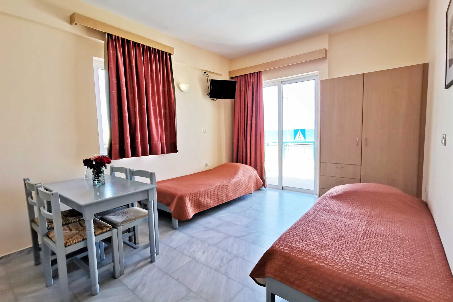 1-værelses lejligheder med balkon og havudsigt. Soveværelse kombineret med minikøkken. To enkeltsenge. Mulighed for en ekstra opredning i sovesofa. Minikøkken med kogeplader, køleskab, kaffemaskine, lille ovn og enkelt køkkenudstyr. Gratis wifi og aircondition. Deponering mod betaling. Tv med internationale kanaler. Lille badeværelse med bruser og toilet. Rengøring 6 gange om ugen.