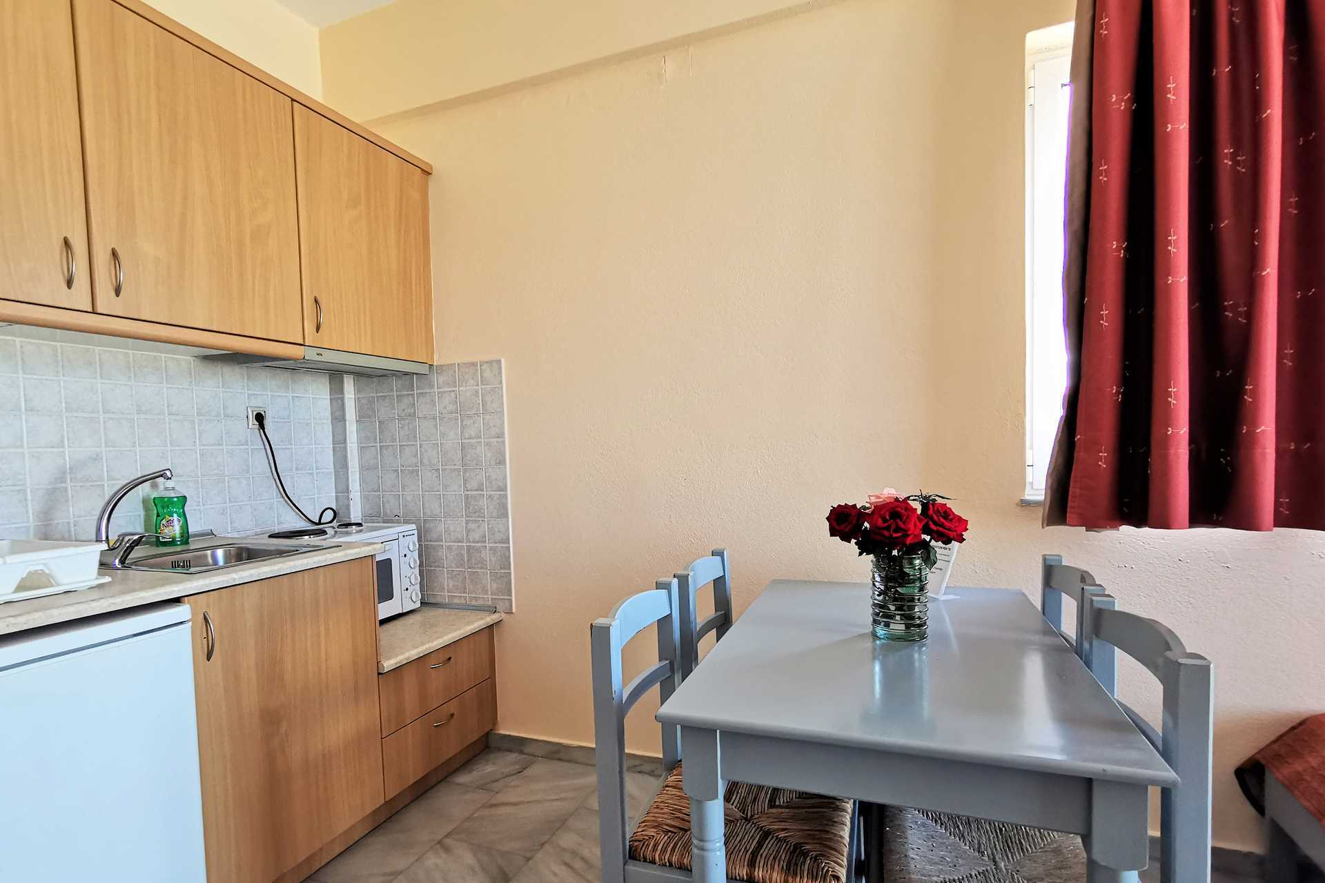 1-værelses lejligheder i nedsænket stueplan med udsigt mod haven. Soveværelse kombineret med minikøkken. To enkeltsenge. Mulighed for ekstra opredning i enkeltseng. Minikøkken med kogeplader, køleskab, kaffemaskine, lille ovn og enkelt køkkenudstyr. Gratis wifi og aircondition. Deponering mod betaling. Tv med internationale kanaler. Lille badeværelse med bruser og toilet. Rengøring 6 gange om ugen.
