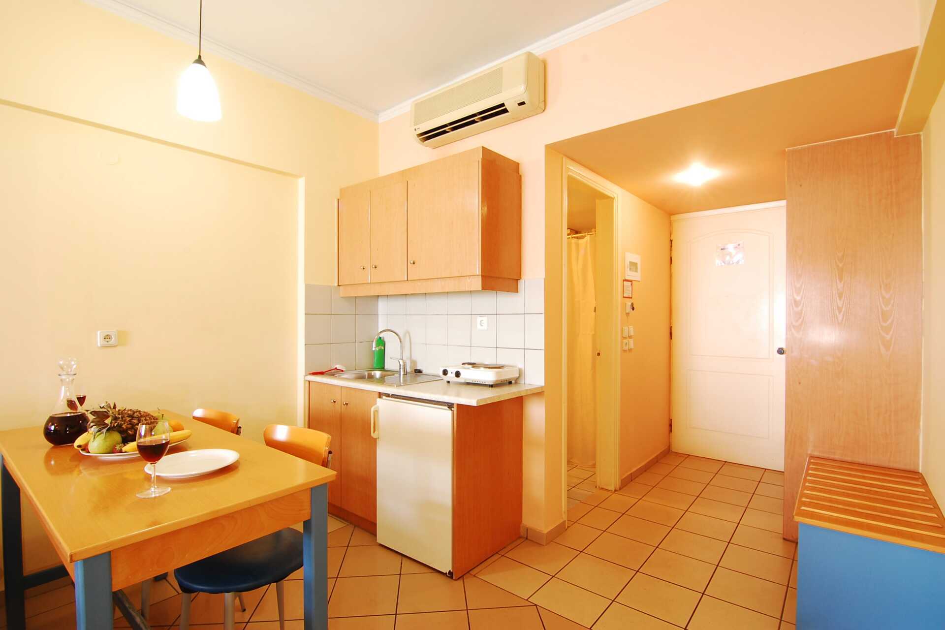 1-værelses lejlighed med balkon med pooludsigt eller havudsigt eller med stor balkon eller terrasse. Kombineret soveværelse og minikøkken. To enkeltsenge. Mulighed for ekstra opredning i enkeltseng. Minikøkken med kogeplader, køleskab, brødrister, kaffemaskine eller el-kedel og enkelt køkkenudstyr. Gratis wifi og aircondition. Deponering mod betaling. Tv med lokale kanaler. Hårtørrer. Badeværelse med bruser og toilet. Rengøring 6 gange om ugen.
