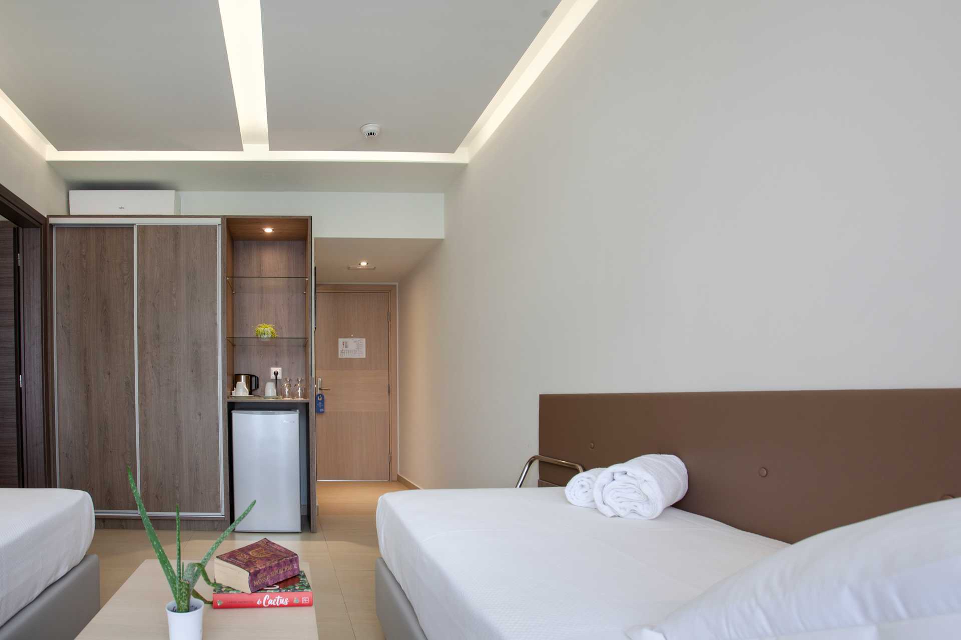 Familie-værelse med balkon. To soveværelser, et med en dobbeltseng eller to enkeltsenge og et med en enkeltseng og en sovesofa. Gratis wifi, aircondition og deponering. Køleskab. El-kedel og kaffe/te. Et tv med internationale kanaler i hvert soveværelse. Hårtørrer. Tøfler. To badeværelser med bruser og toilet. Rengøring 7 gange om ugen. Børn under to år tæller med i det maksimale antal personer på værelset.