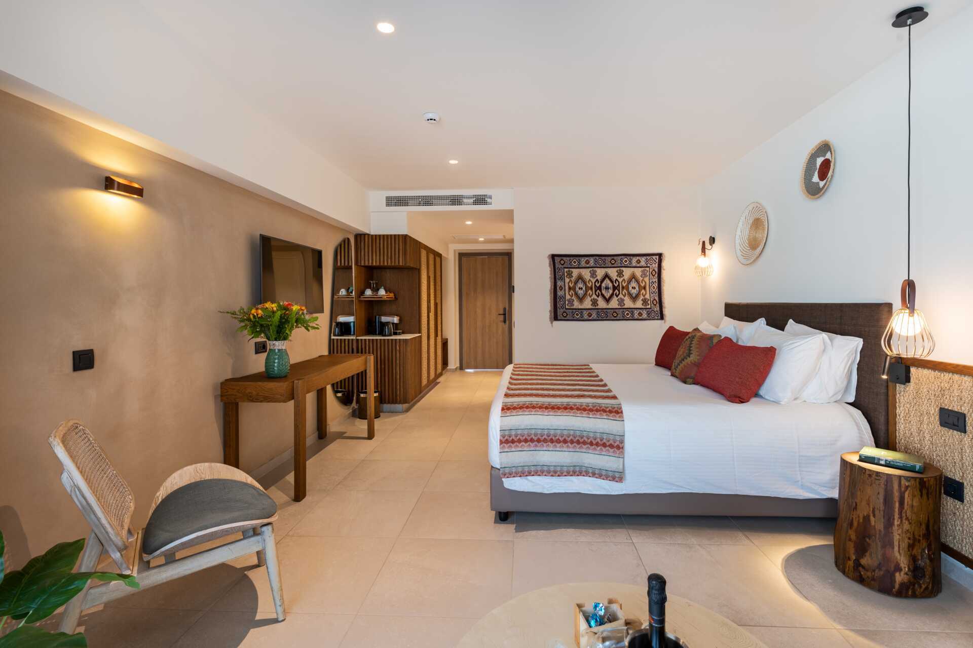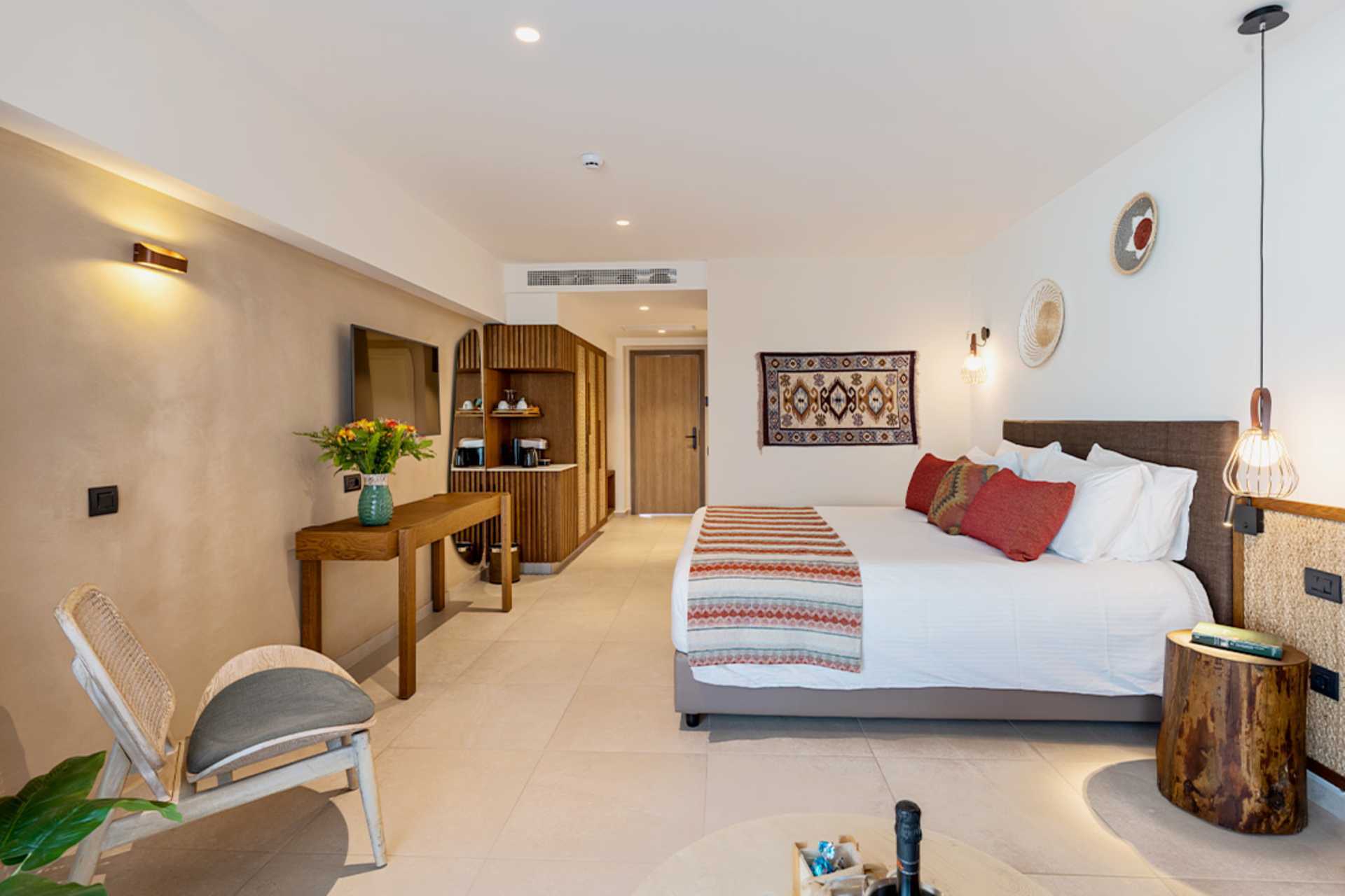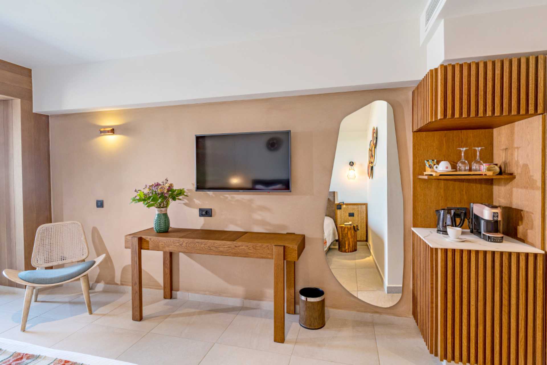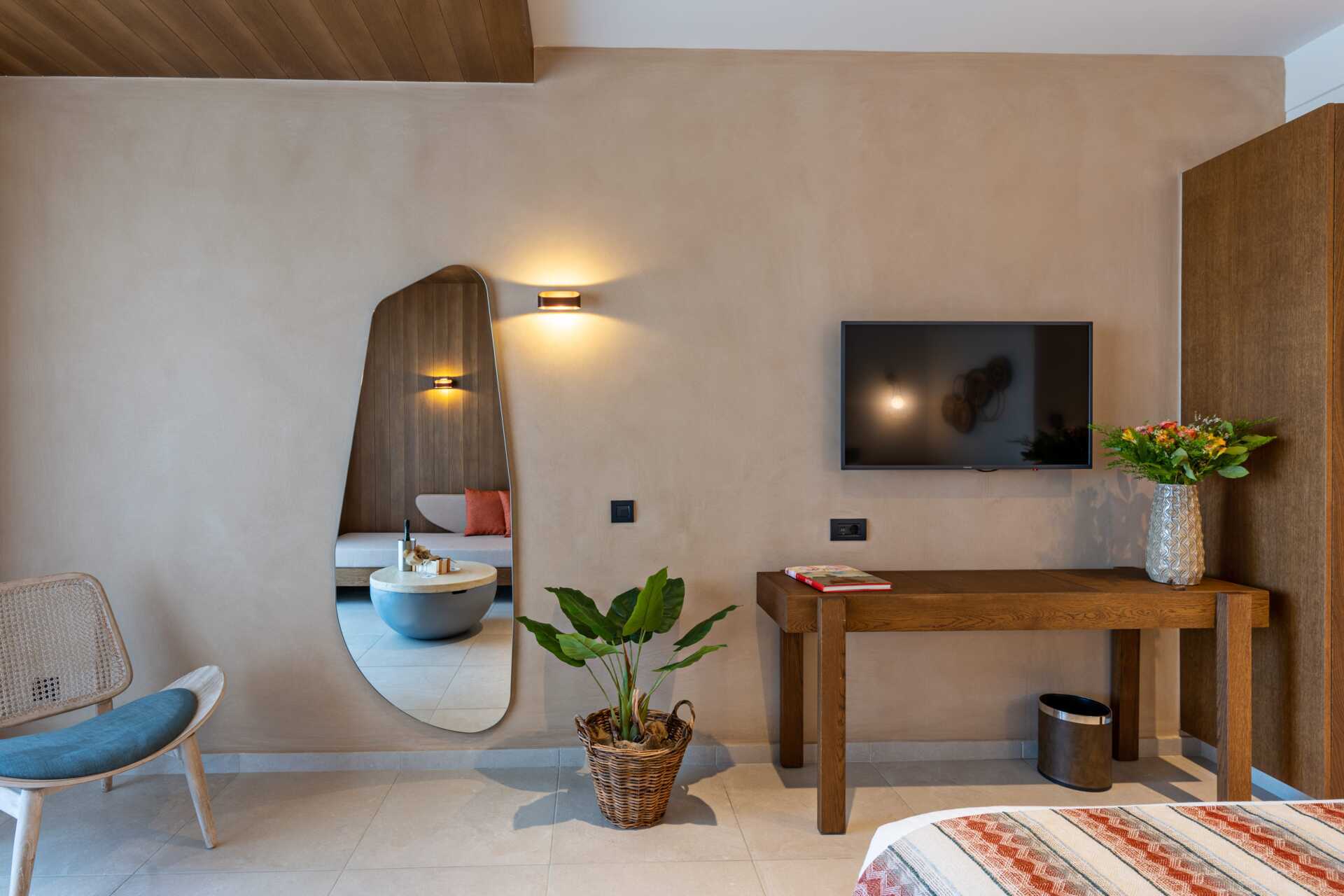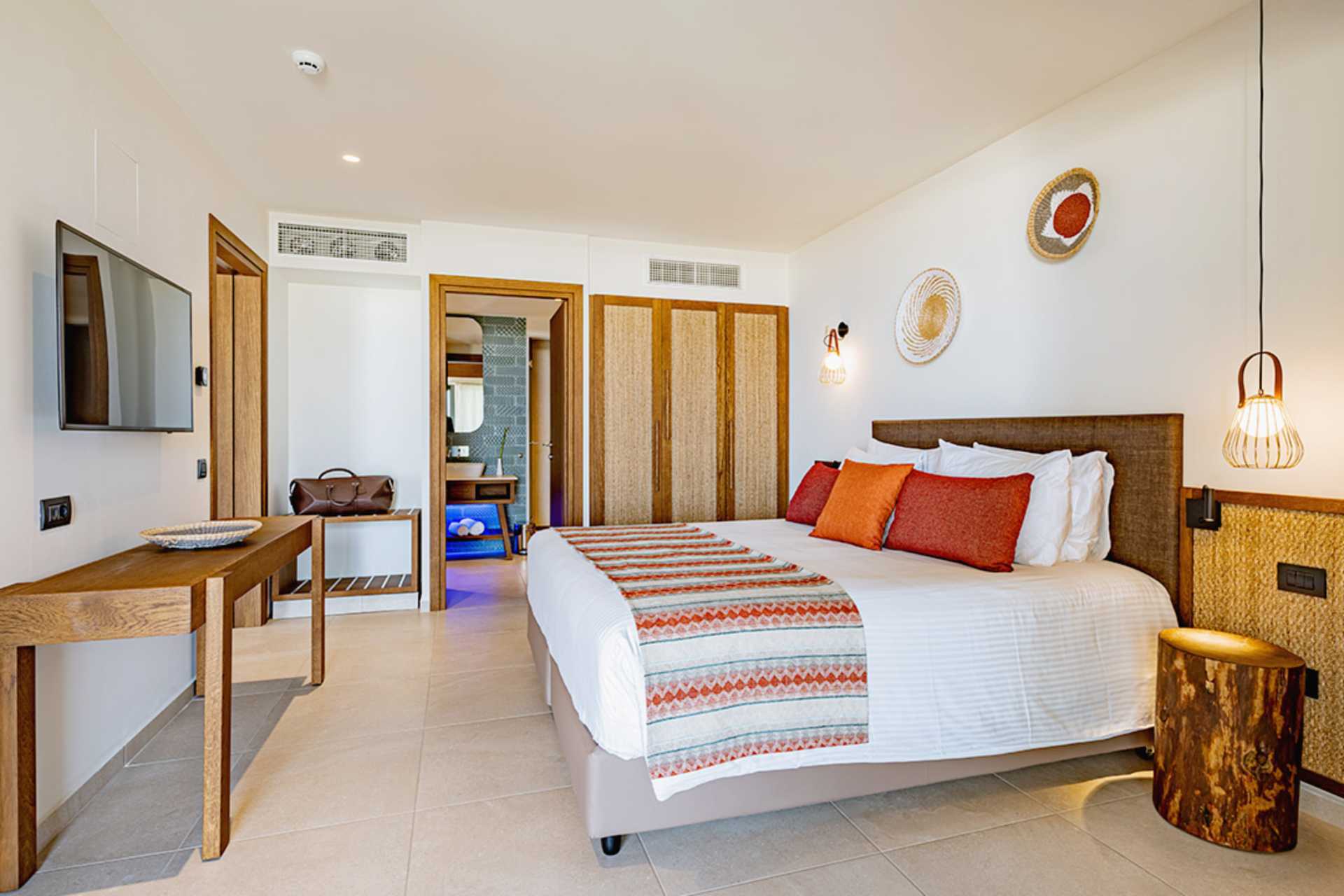 Junior-suiter med balkon. En dobbeltseng. Pudemenu. Gratis wifi, aircondition og deponering. Køleskab. Nespresso kaffemaskine - kapsler medfølger. El-kedel og kaffe/te. Mousserende vin, en flaske vand og frugt ved ankomst. Tv med internationale kanaler. Badekåber og tøfler. Strygejern og strygebræt. Pool- og strandhåndklæder Hårtørrer. Badeværelse med bruser og toilet. Rengøring 7 gange om ugen.
