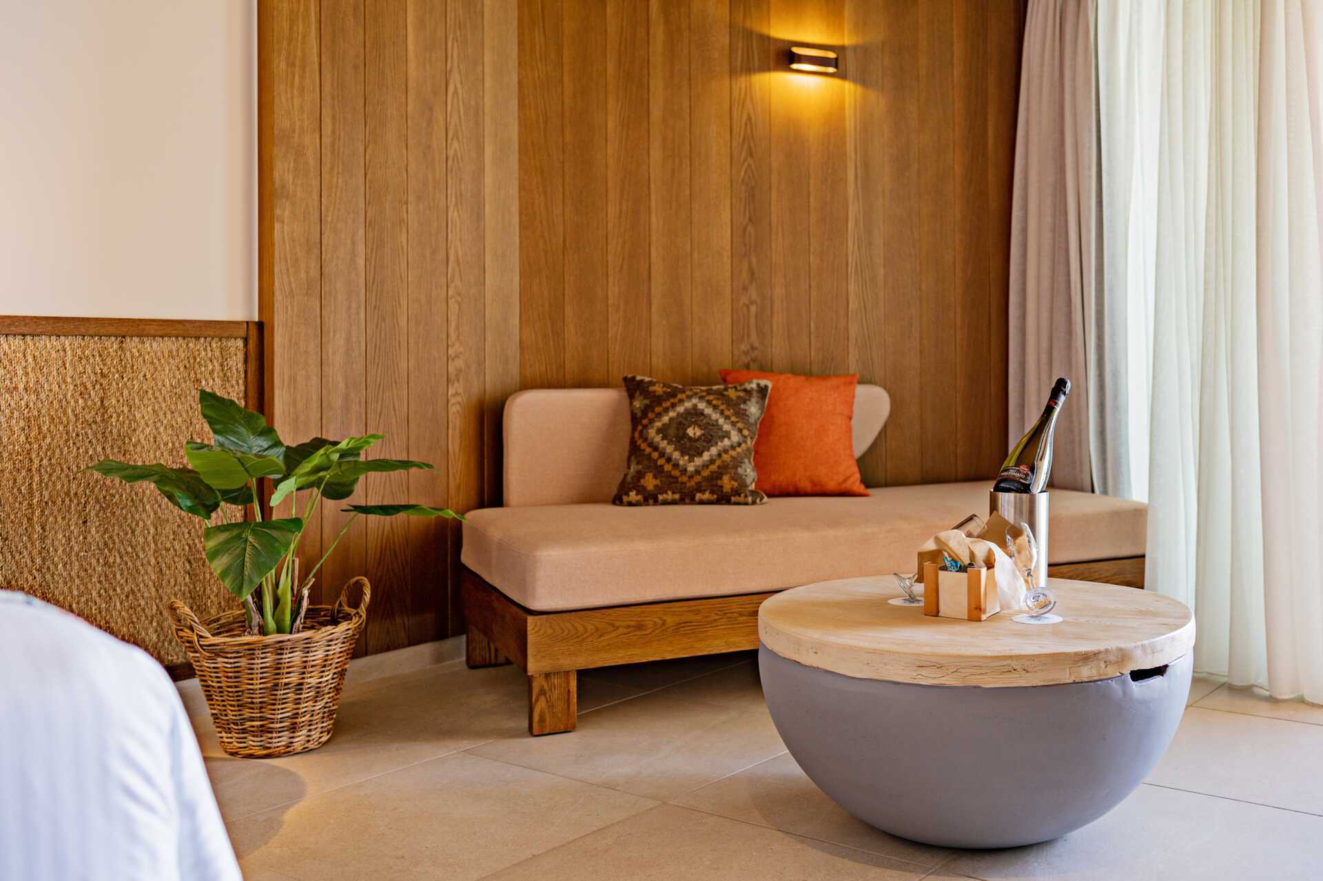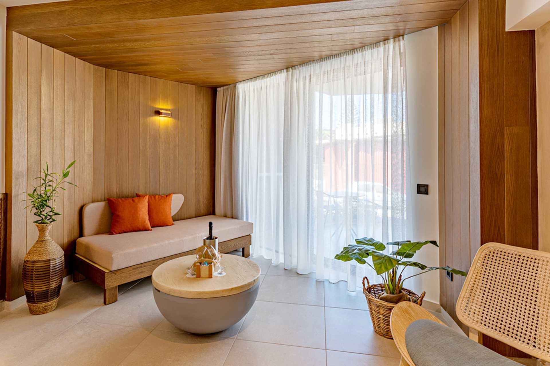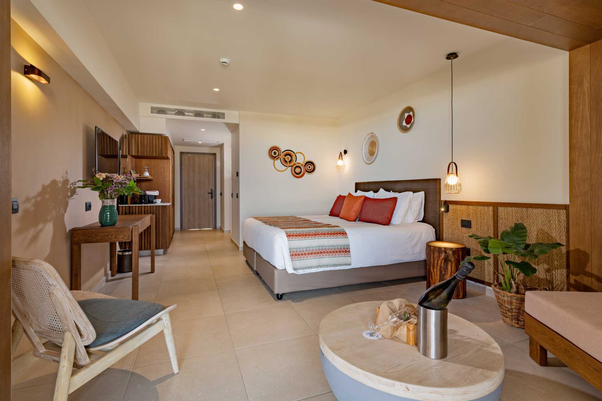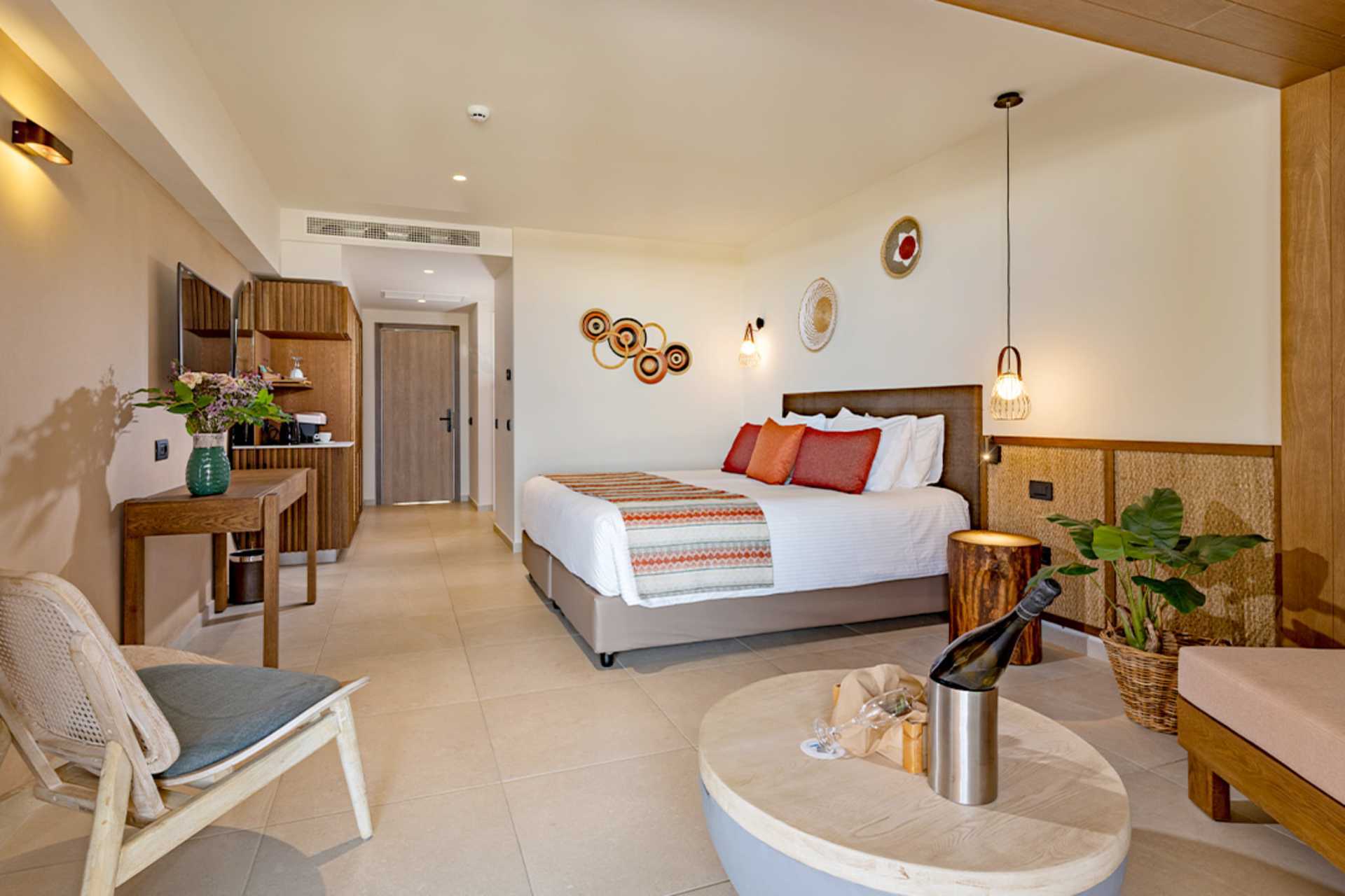 Junior-suiter med balkon. En dobbeltseng. Pudemenu. Gratis wifi, aircondition og deponering. Køleskab. Nespresso kaffemaskine - kapsler medfølger. El-kedel og kaffe/te. Mousserende vin, en flaske vand og frugt ved ankomst. Tv med internationale kanaler. Badekåber og tøfler. Strygejern og strygebræt. Pool- og strandhåndklæder Hårtørrer. Badeværelse med bruser og toilet. Rengøring 7 gange om ugen.