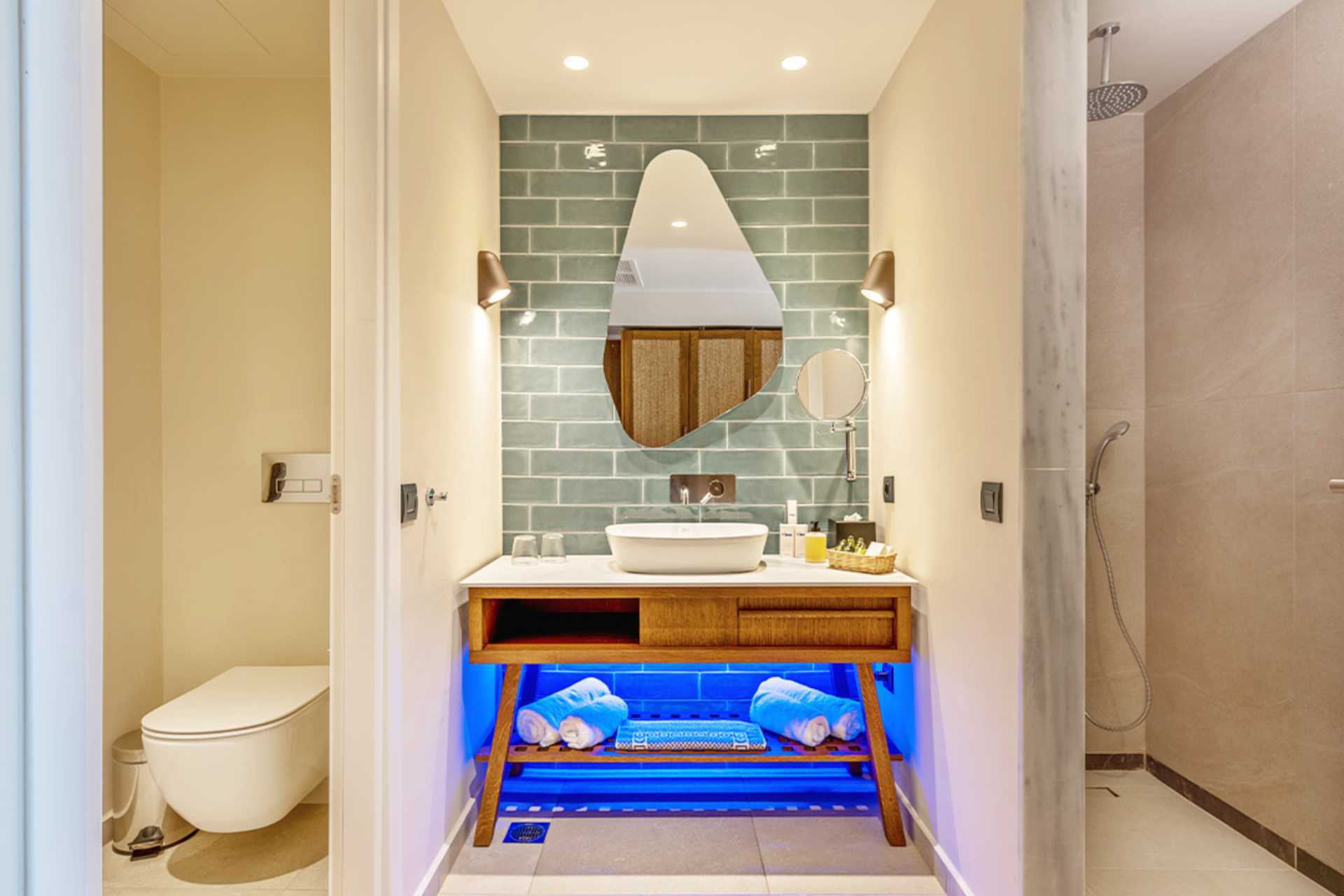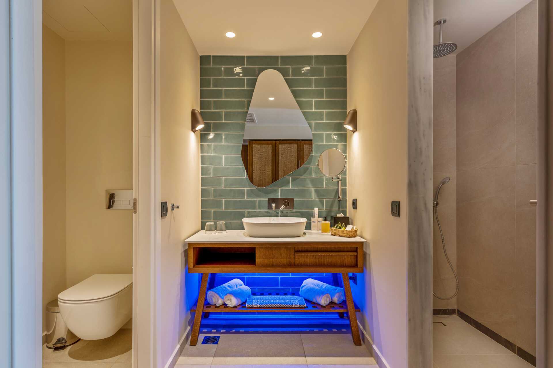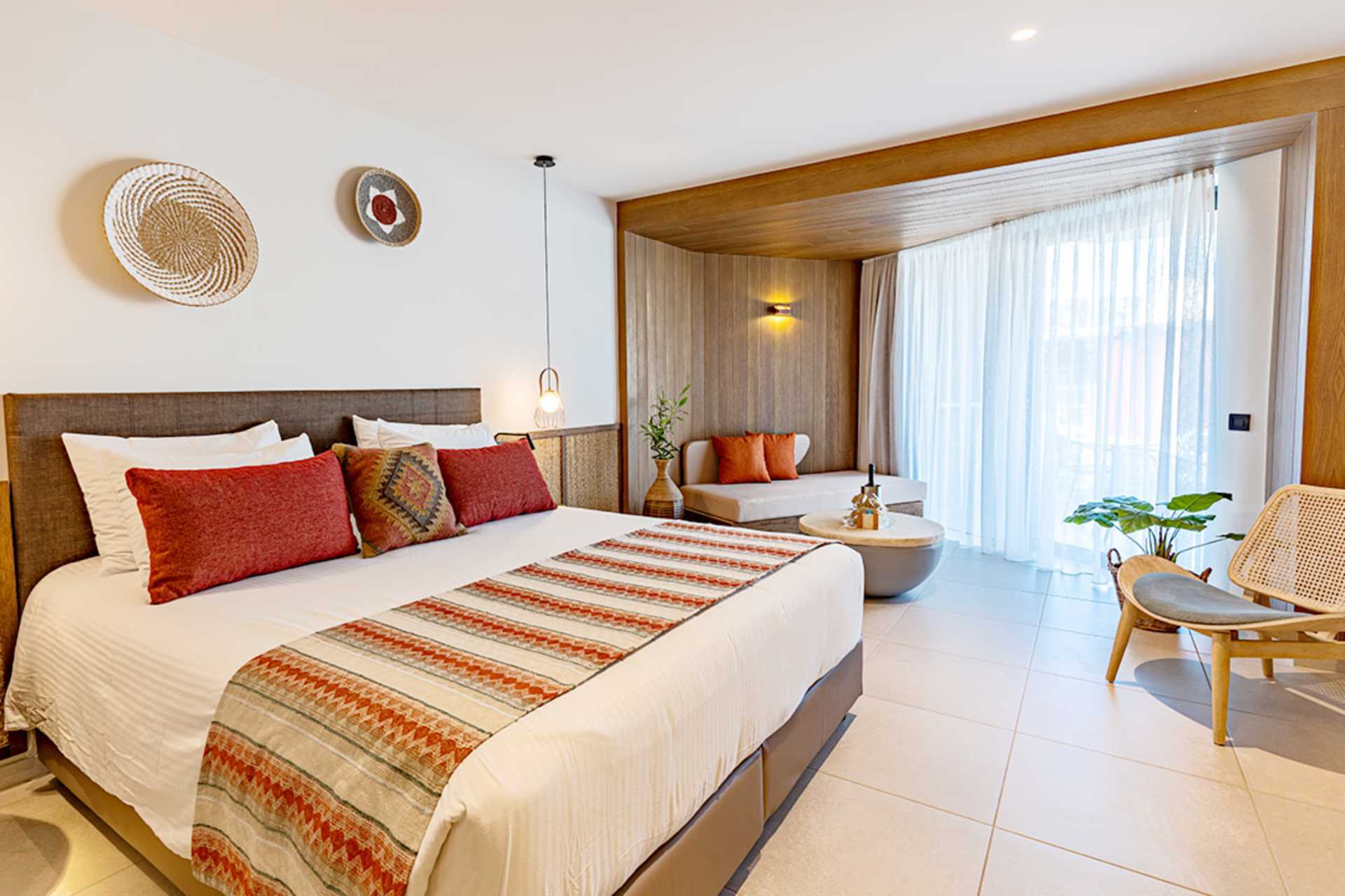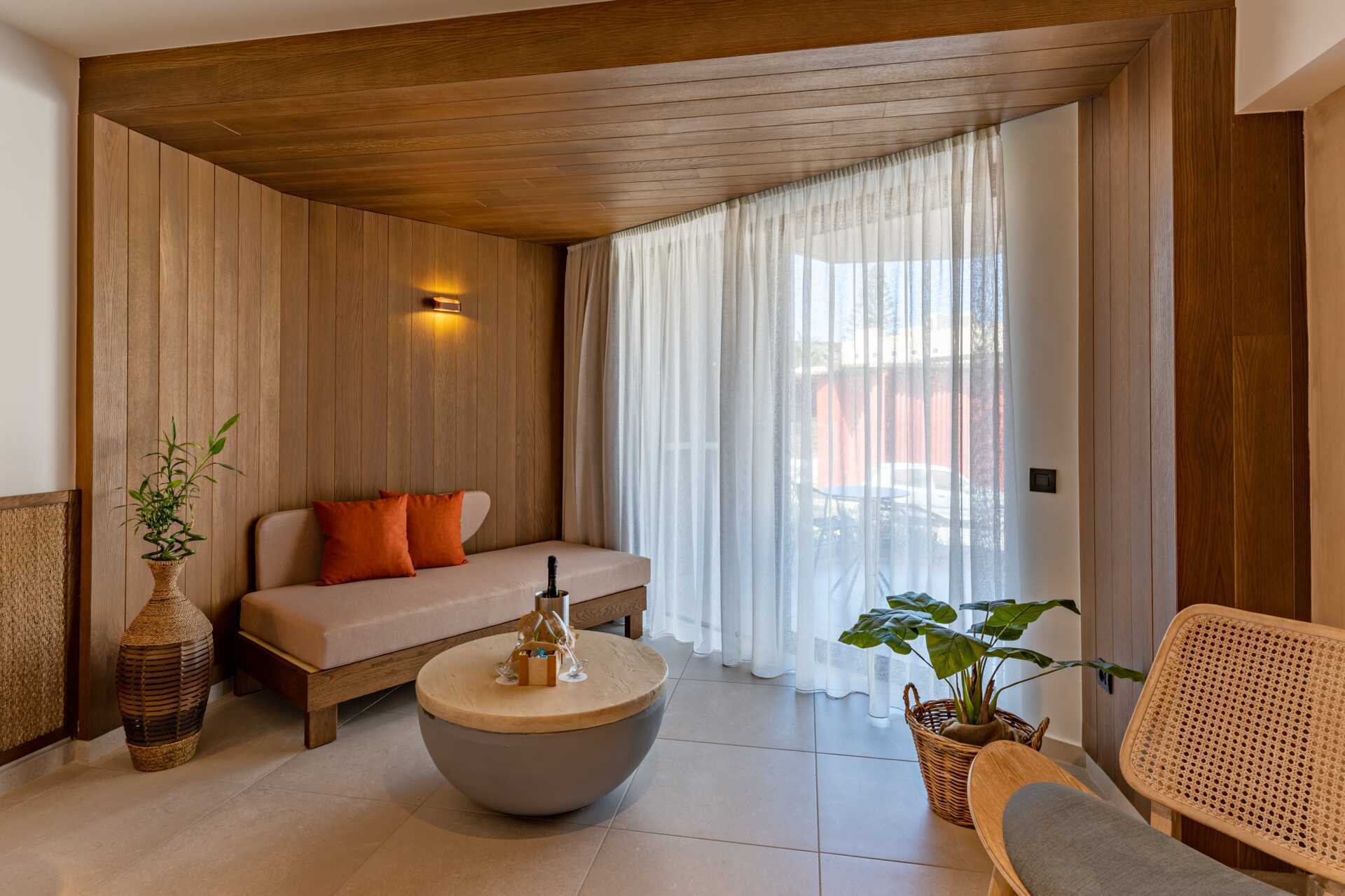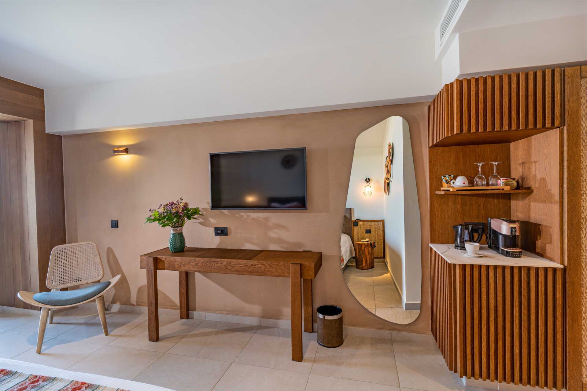 Junior-suiter med balkon. En dobbeltseng. Pudemenu. Gratis wifi, aircondition og deponering. Køleskab. Nespresso kaffemaskine - kapsler medfølger. El-kedel og kaffe/te. Mousserende vin, en flaske vand og frugt ved ankomst. Tv med internationale kanaler. Badekåber og tøfler. Strygejern og strygebræt. Pool- og strandhåndklæder Hårtørrer. Badeværelse med bruser og toilet. Rengøring 7 gange om ugen.