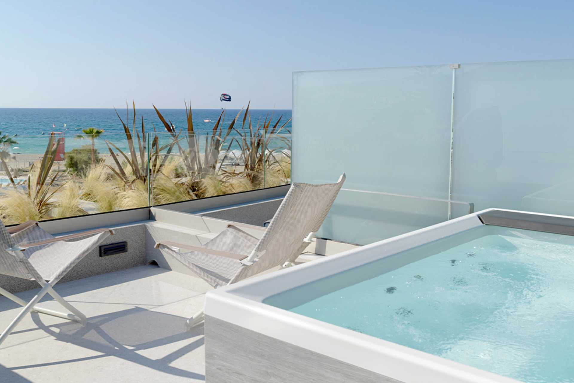 2-værelses suiter i to etager med stor balkon eller terrasse med jacuzzi og havudsigt. I stueplan er der et opholdsrum med sovesofa og badeværelse og ovenpå er der soveværelse med dobbeltseng. Pudemenu. Gratis wifi, aircondition og deponering. Minibar. El-kedel og kaffe/te. Tv med internationale kanaler. Hårtørrer. Badekåber og tøfler. Badeværelse med badekar med separat eller med bruser og separat toilet. Rengøring 7 gange om ugen.