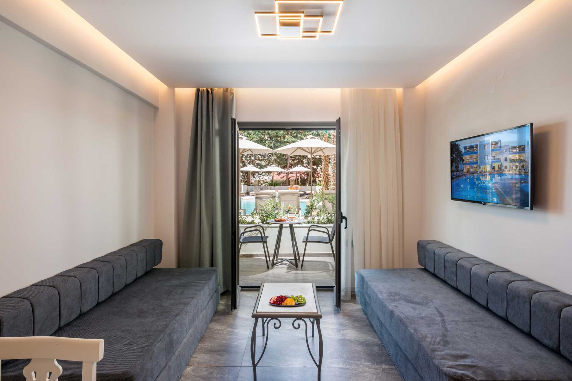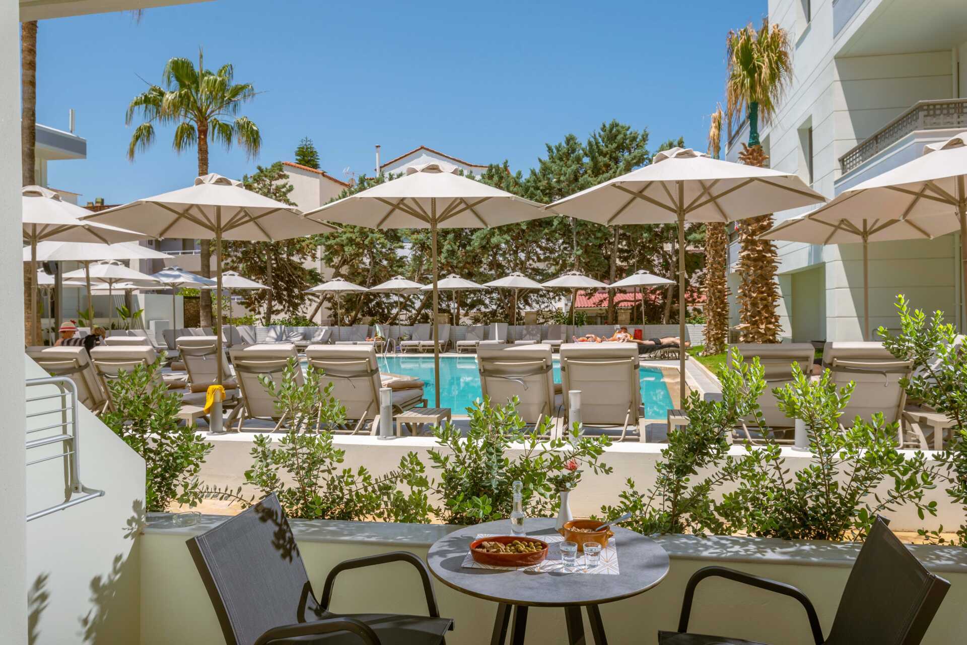 Superior-værelser med balkon i stueplan og pooludsigt. En dobbeltseng. Gratis wifi, aircondition og deponering. Køleskab. El-kedel samt kaffe/te. Strygejern og strygebræt. Tv med internationale kanaler. Hårtørrer. Badeværelse med bruser og toilet. Rengøring 6 gange om ugen.