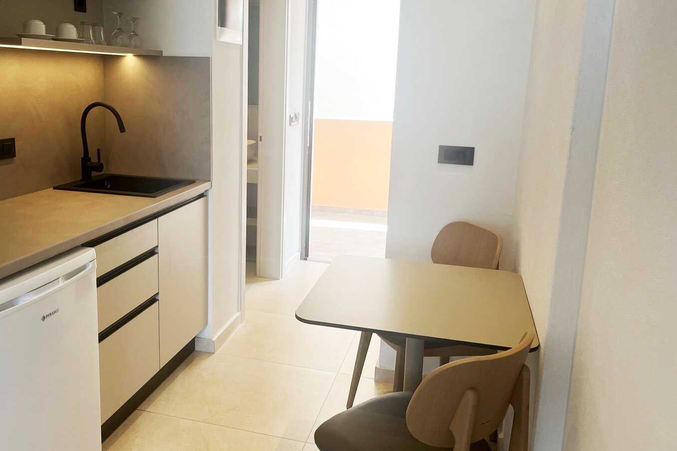 1-værelses lejlighed superior med balkon og havudsigt. Soveværelse kombineret med minikøkken. To enkeltsenge. Minikøkken med kogeplader, køleskab, el-kedel, kaffemaskine og enkelt køkkenudstyr. Gratis wifi og aircondition. Deponering mod betaling. Tv med internationale kanaler. Hårtørrer. Badeværelse med bruser og toilet. Rengøring 6 gange om ugen. Børn under to år tæller med i det maksimale antal personer på værelset.