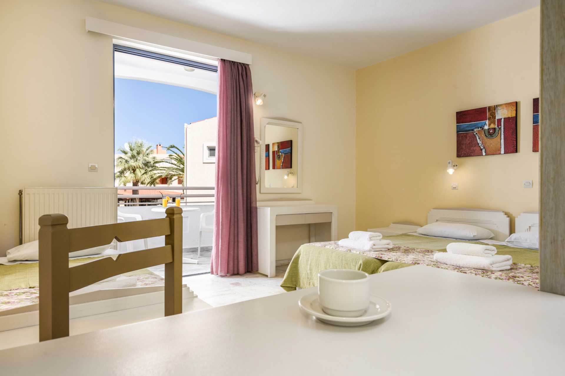 2-værelses lejligheder med balkon eller terrasse. Soveværelse og kombineret opholdsrum med minikøkken. To enkeltsenge. Mulighed for ekstra opredning i to sovesofaer. Minikøkken med kogeplader, køleskab, el-kedel og enkelt køkkenudstyr. Gratis wifi og aircondition. Deponering mod betaling. Tv med internationale kanaler. Hårtørrer. Badeværelse med bruser og toilet. Rengøring 6 gange om ugen.