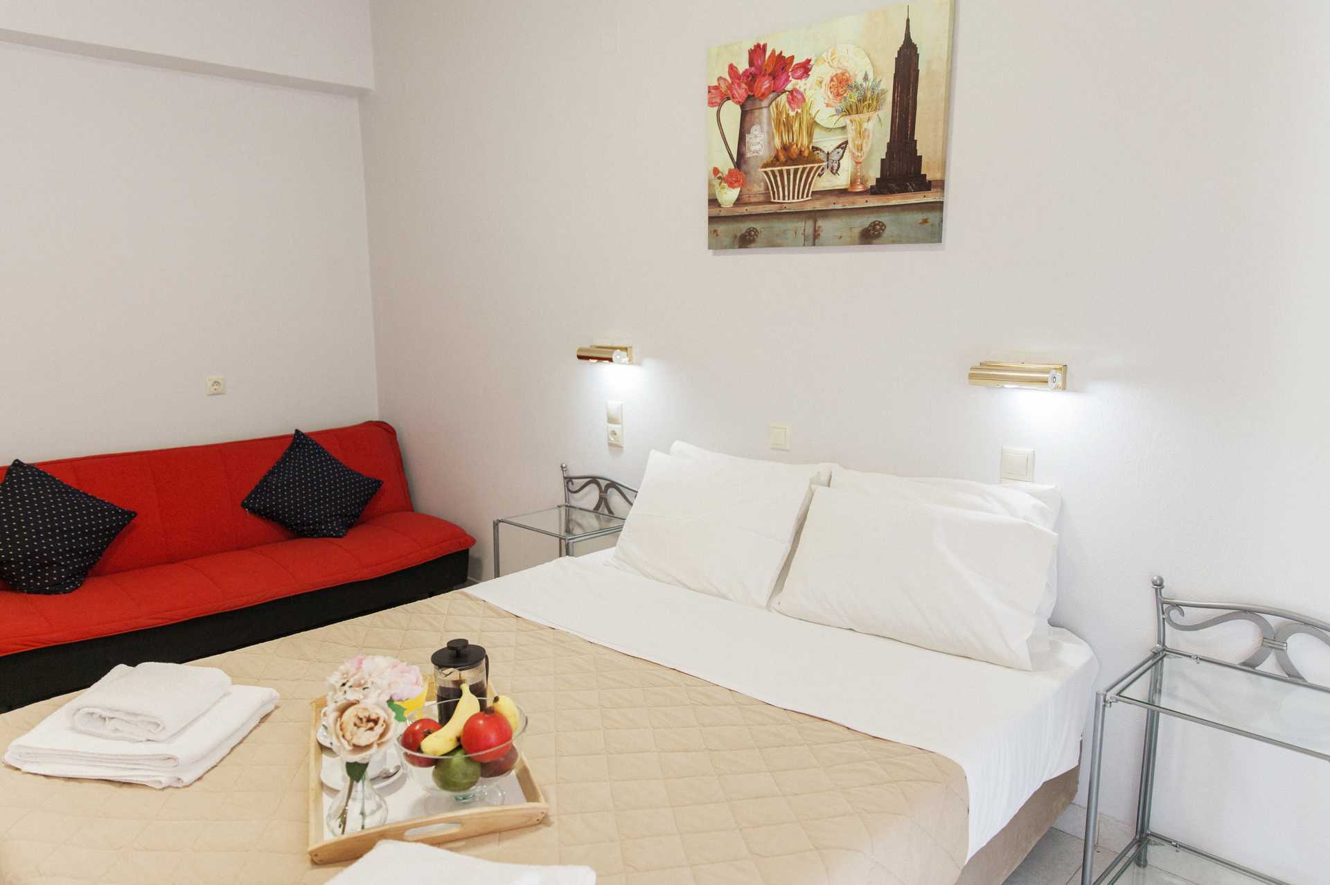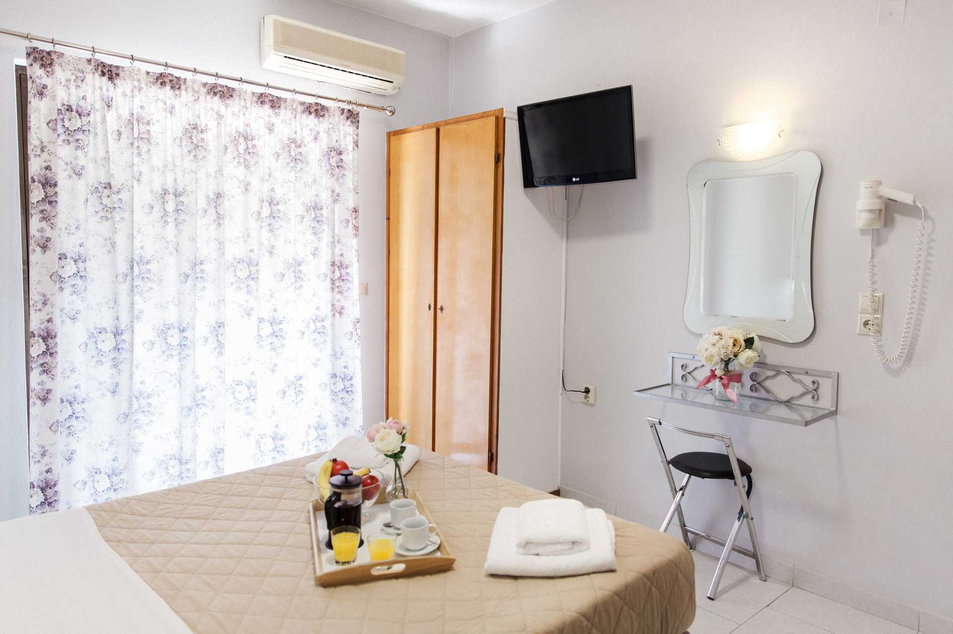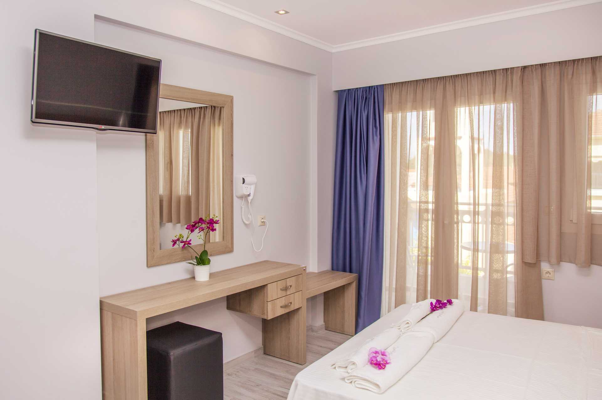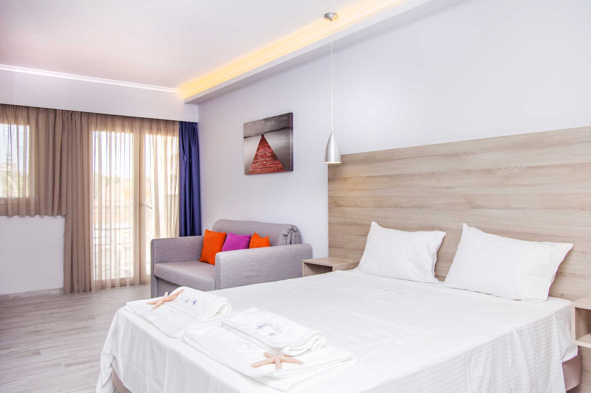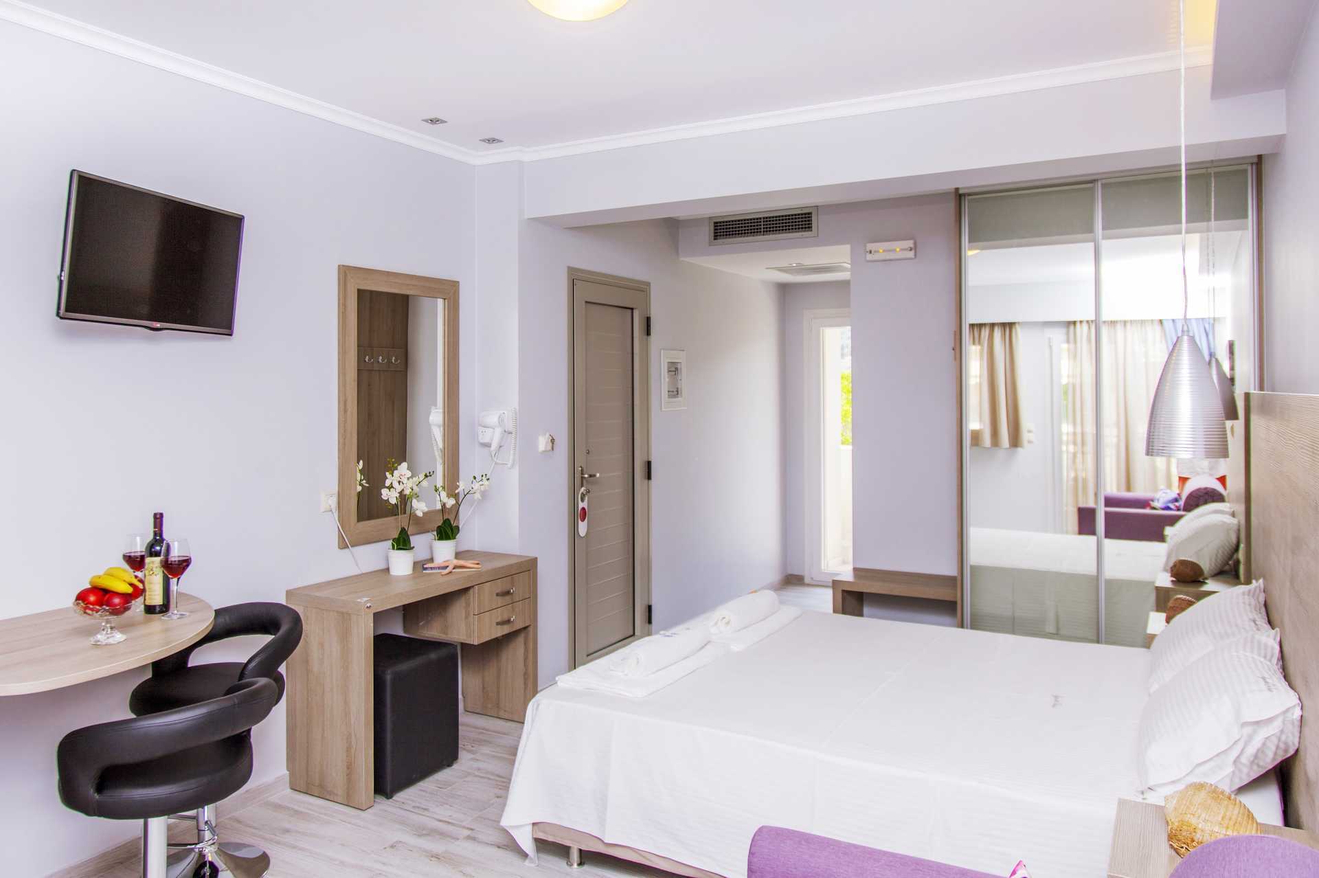 3-værelses lejligheder med balkon. To soveværelser og et kombineret opholdsrum med minikøkken. En dobbeltseng i det ene soveværelse og to enkeltsenge i det andet soveværelse. Minikøkken med kogeplader, køleskab, el-kedel og enkelt køkkenudstyr. Gratis wifi. Aircondition og deponering mod betaling. Tv med internationale kanaler. Hårtørrer. Badeværelse med bruser og toilet. Rengøring 6 gange om ugen.
