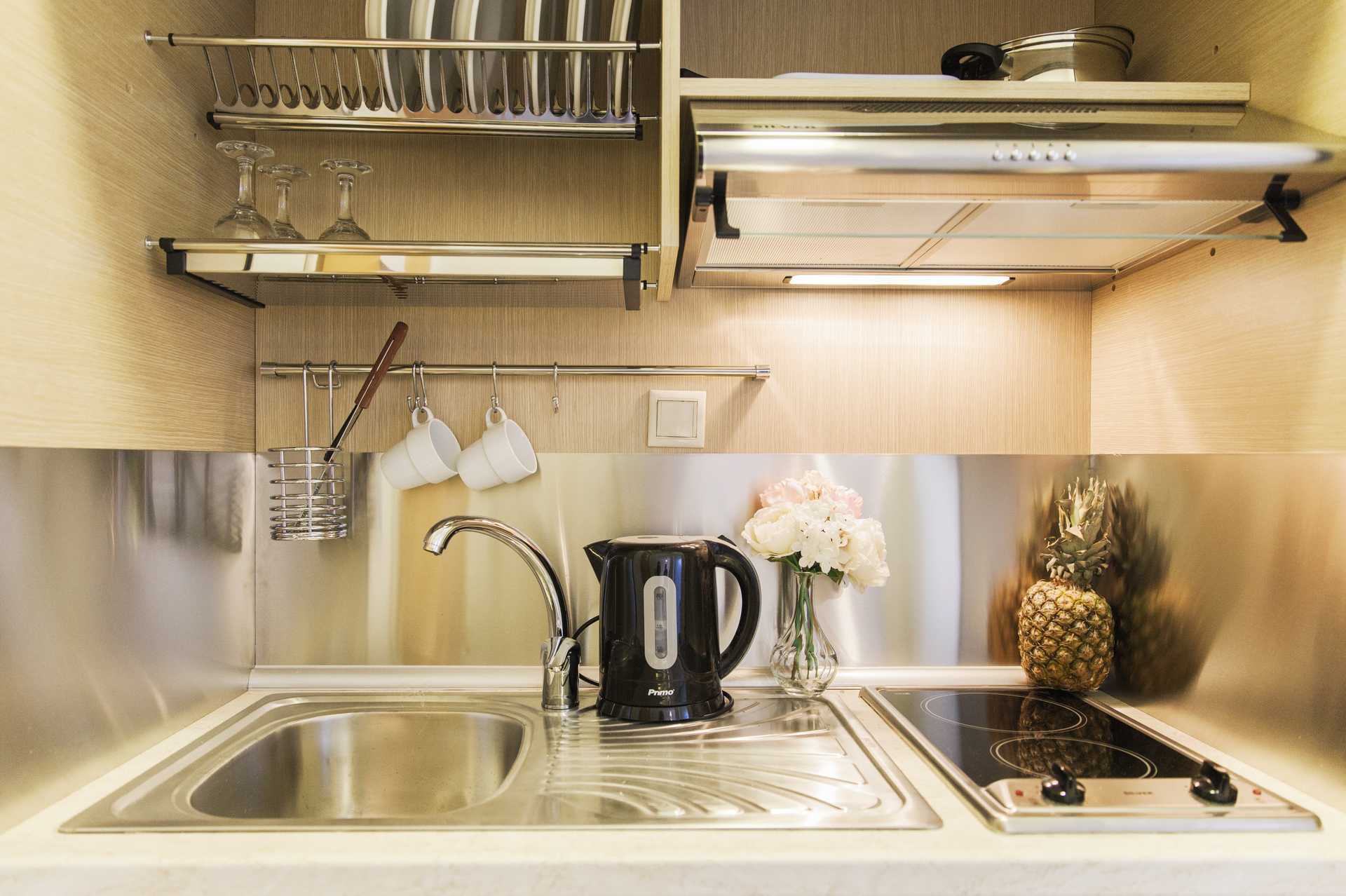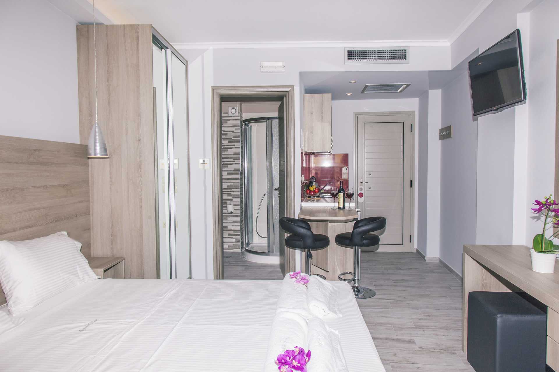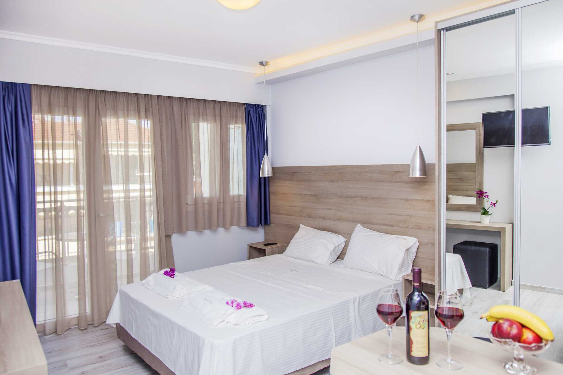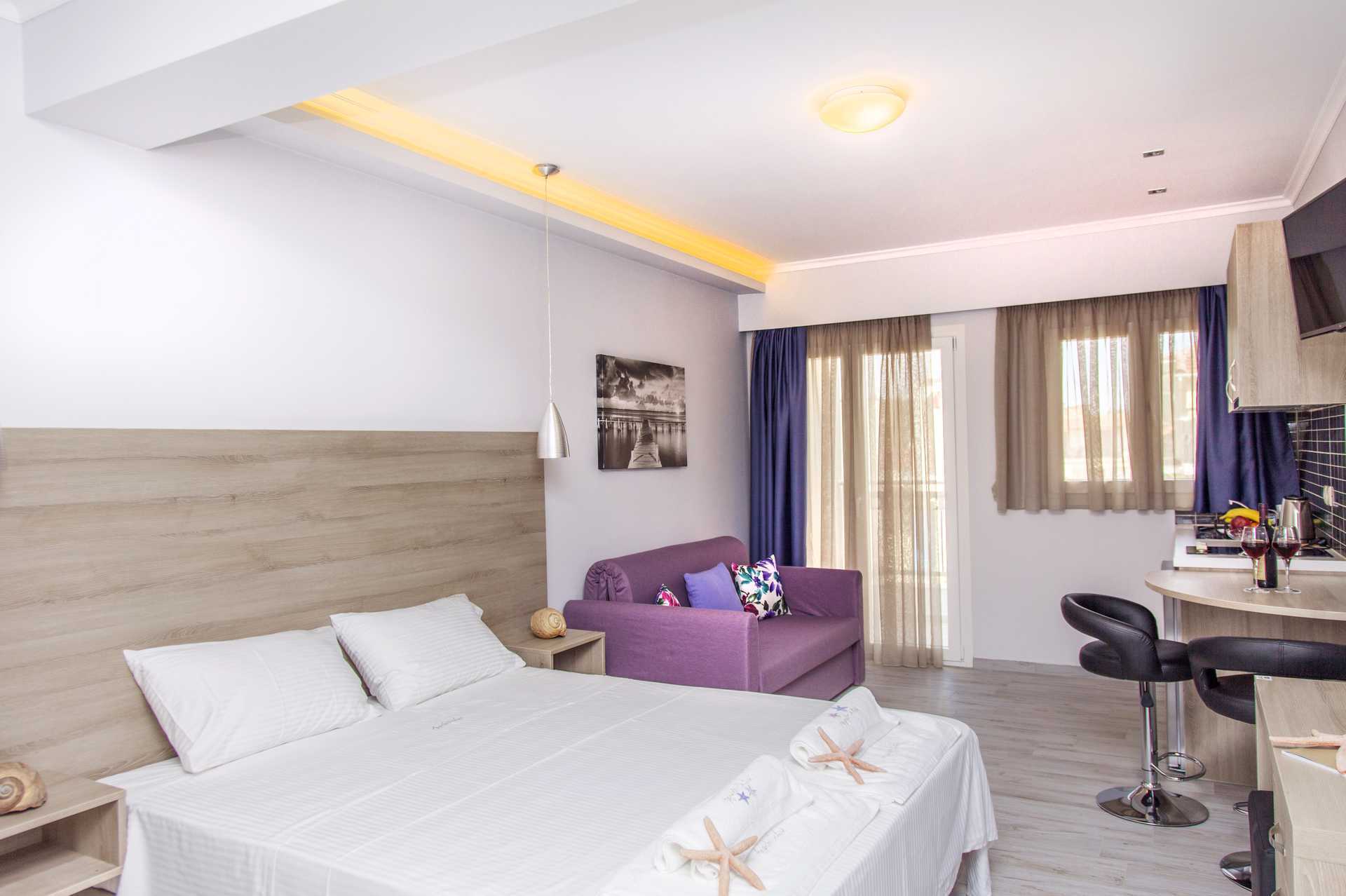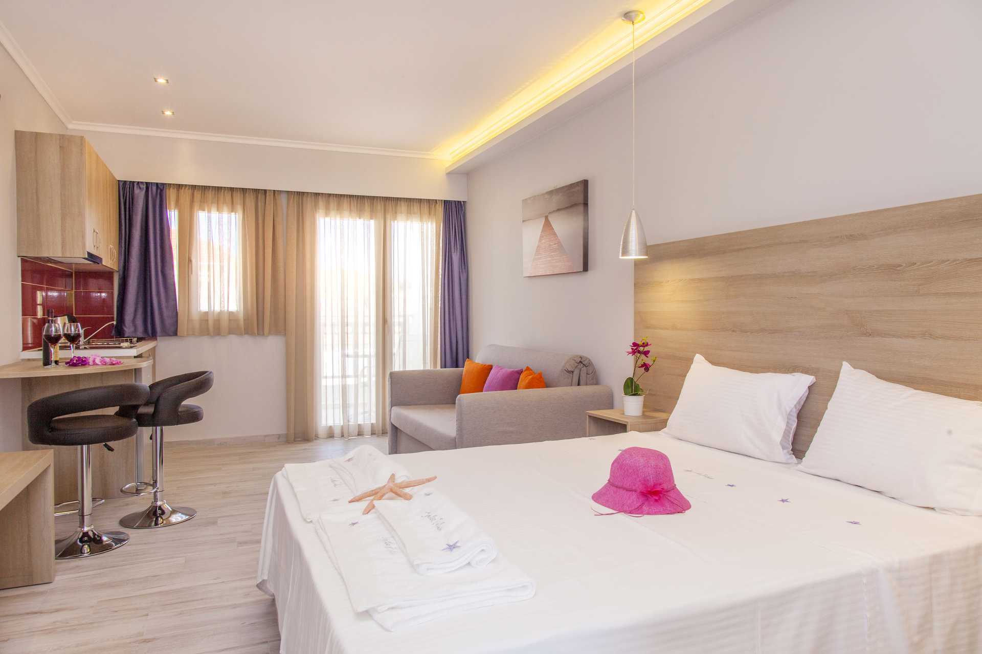 1-værelses lejligheder med balkon. Soveværelse kombineret med minikøkken. En dobbeltseng eller to enkeltsenge. Mulighed for ekstra opredning i sovesofa. Hvis der bor tre personer på værelset, kan det opfattes som trangt. Minikøkken med kogeplader, køleskab, el-kedel og enkelt køkkenudstyr. Gratis wifi. Aircondition og deponering mod betaling. Tv med internationale kanaler. Hårtørrer. Badeværelse med bruser og toilet. Rengøring 6 gange om ugen.