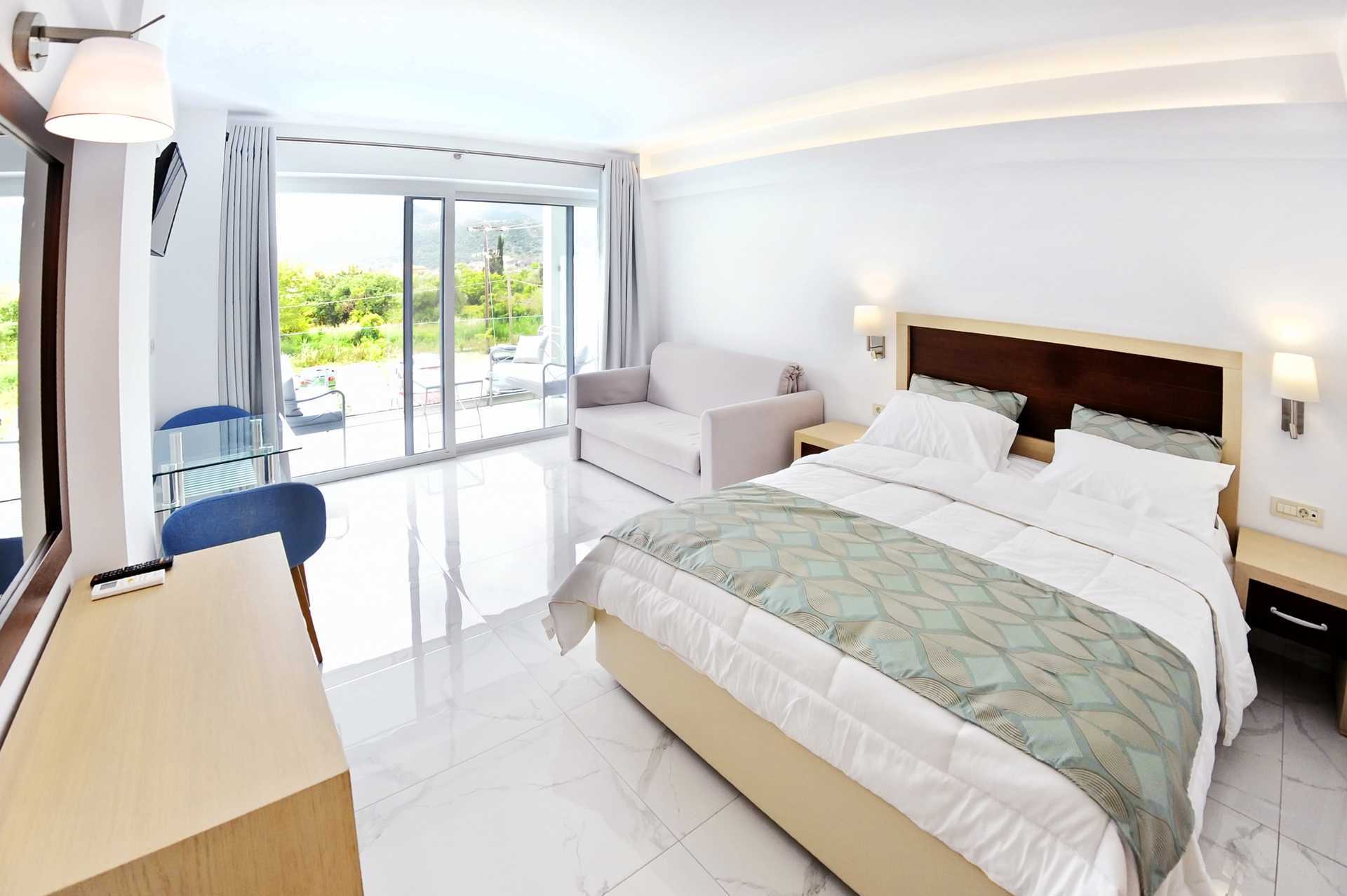 1-værelses lejligheder deluxe med balkon eller terrasse i stueplan og pooludsigt. Lejlighederne ligger i den nye del. Soveværelse kombineret med minikøkken. En dobbeltseng. Mulighed for ekstra opredninger i sovesofa. Minikøkken med kogeplader, køleskab, el-kedel og enkelt køkkenudstyr. Gratis wifi, aircondition og deponering. Tv med lokale kanaler. Badeværelse med bruser og toilet. Rengøring 6 gange om ugen.