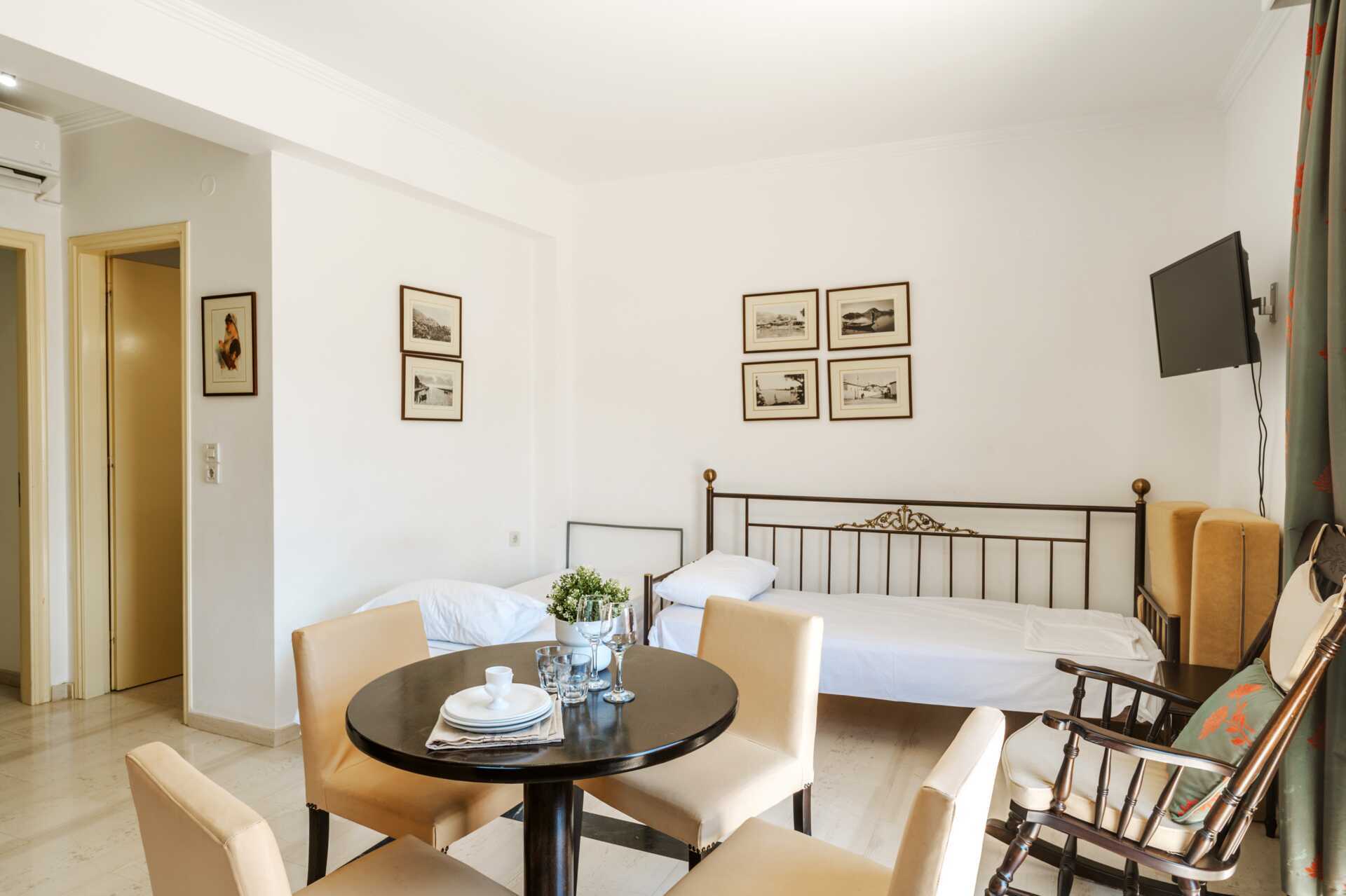 1-værelses lejlighed med balkon eller balkon i stueplan, nogle med pooludsigt. Alle 1-værelses lejligheder ligger i den ældre del. Soveværelse kombineret med minikøkken. En dobbeltseng eller to enkeltsenge. Mulighed for ekstra opredninger i sovesofa. Minikøkken med køleskab, kogeplader, el-kedel og enkelt køkkenudstyr. Gratis wifi, aircondition og deponering. Tv med lokale kanaler. Hårtørrer. Badeværelse med bruser og toilet. Rengøring 6 gange om ugen. Indretningen kan variere mellem lejlighederne.