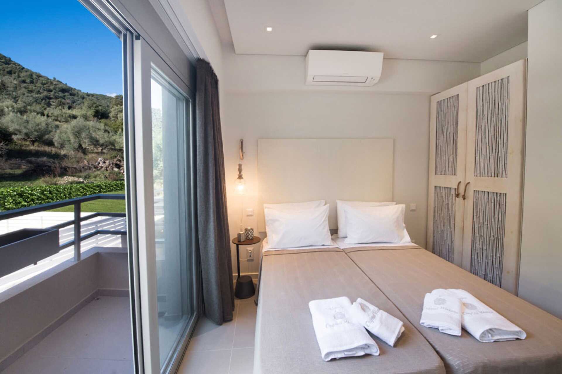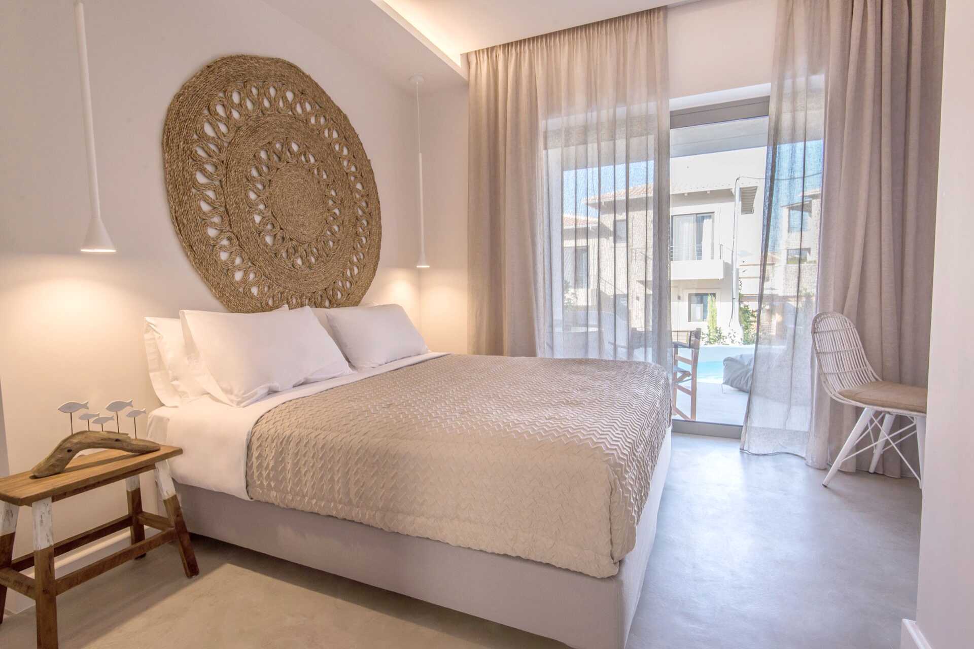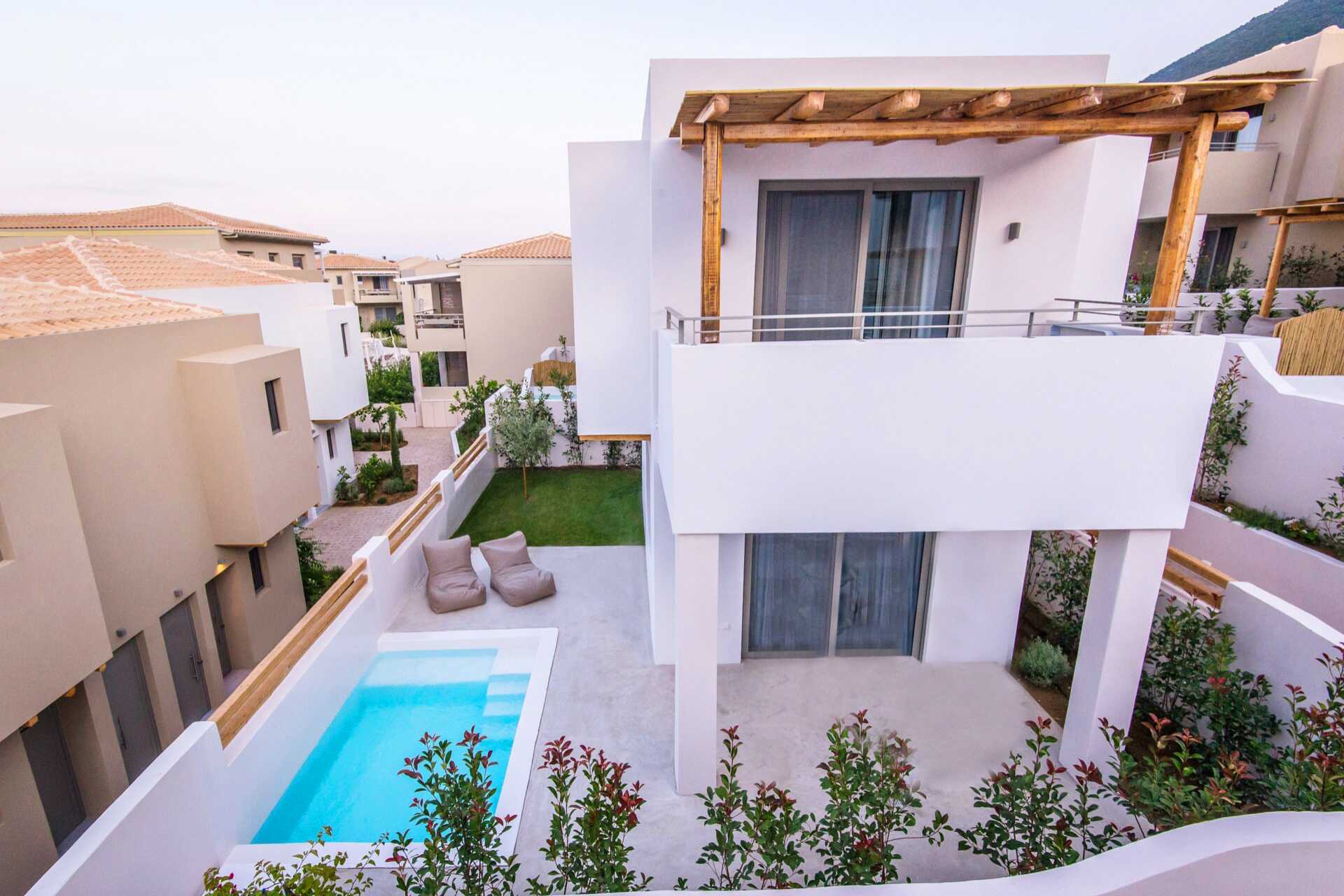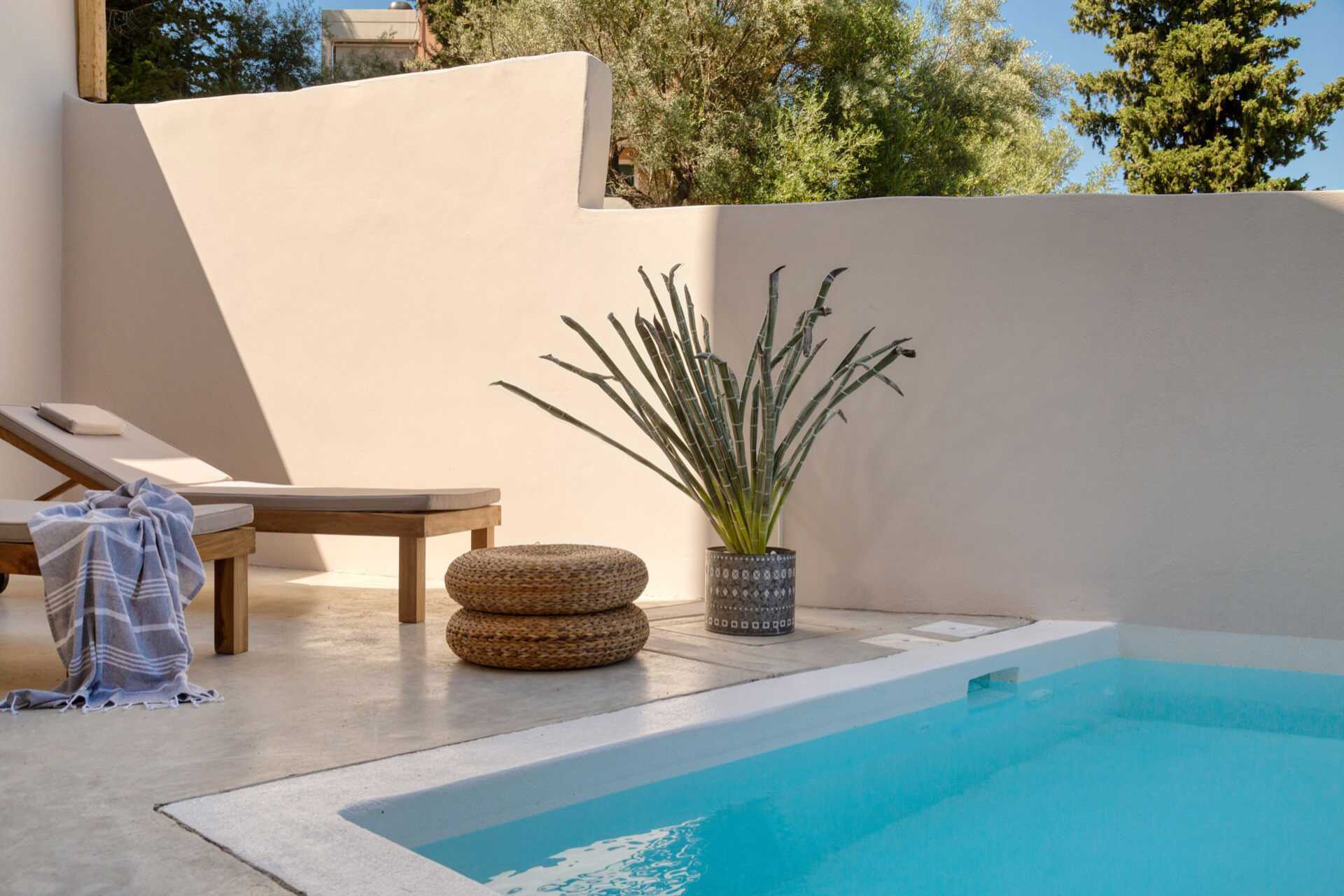 Dobbeltværelser med terrasse og privat pool. På terrassen er der stole og borde og trapper ned i poolen. En dobbeltseng eller to enkeltsenge. Gratis wifi, aircondition og deponering. Minibar. El-kedel og kaffe/te. Tv med internationale kanaler. Hårtørrer. Badeværelse med bruser og toilet. Rengøring 7 gange om ugen.