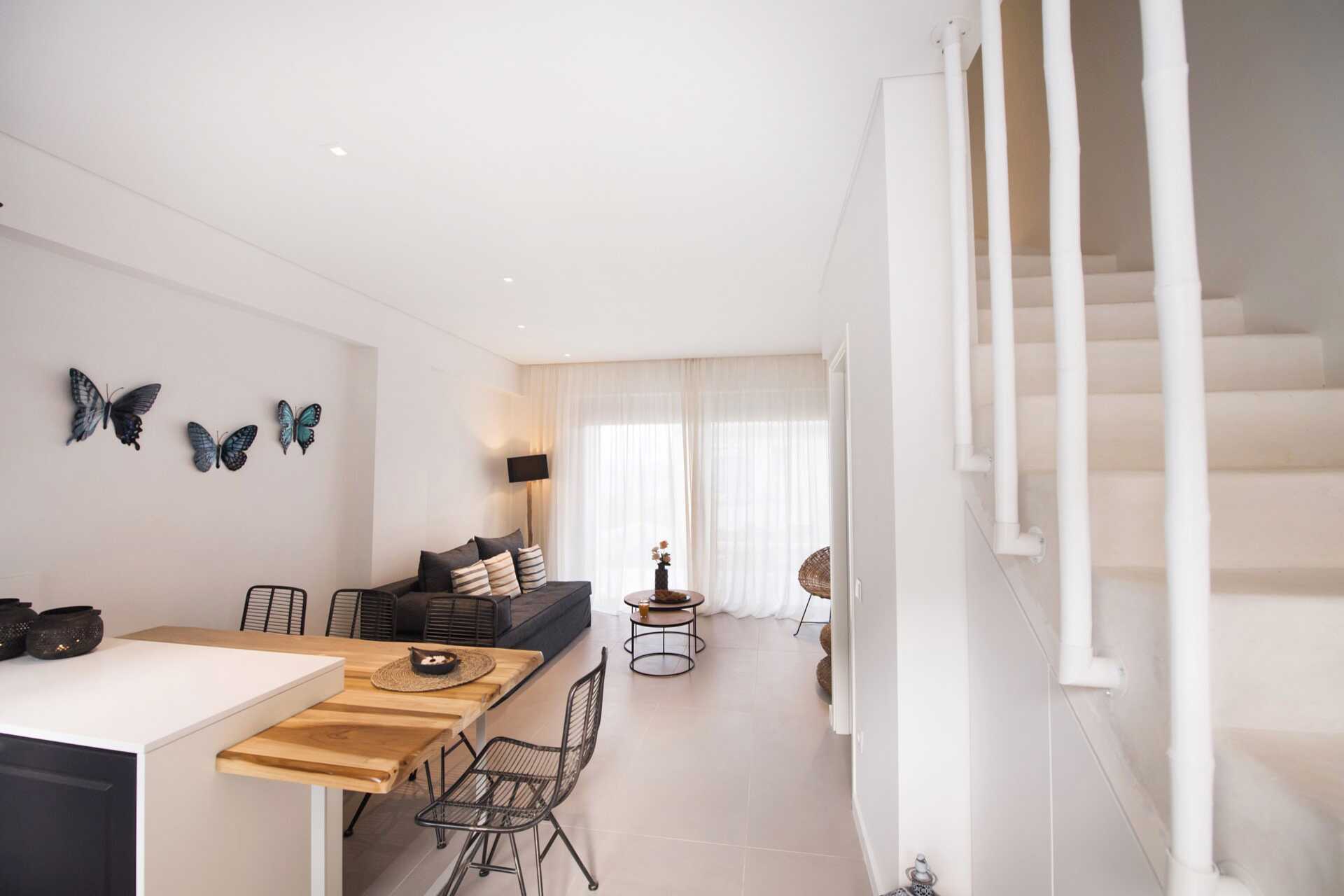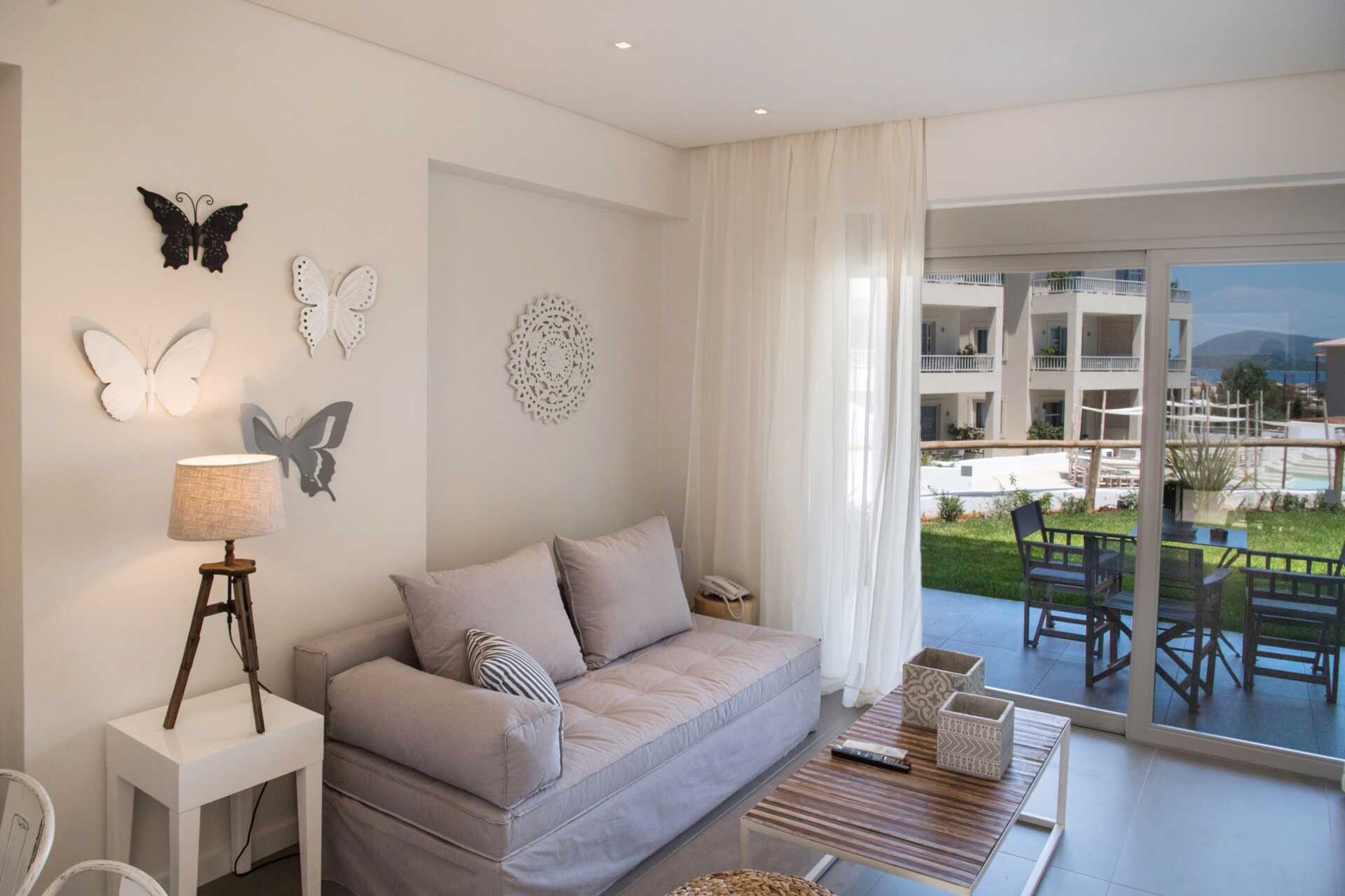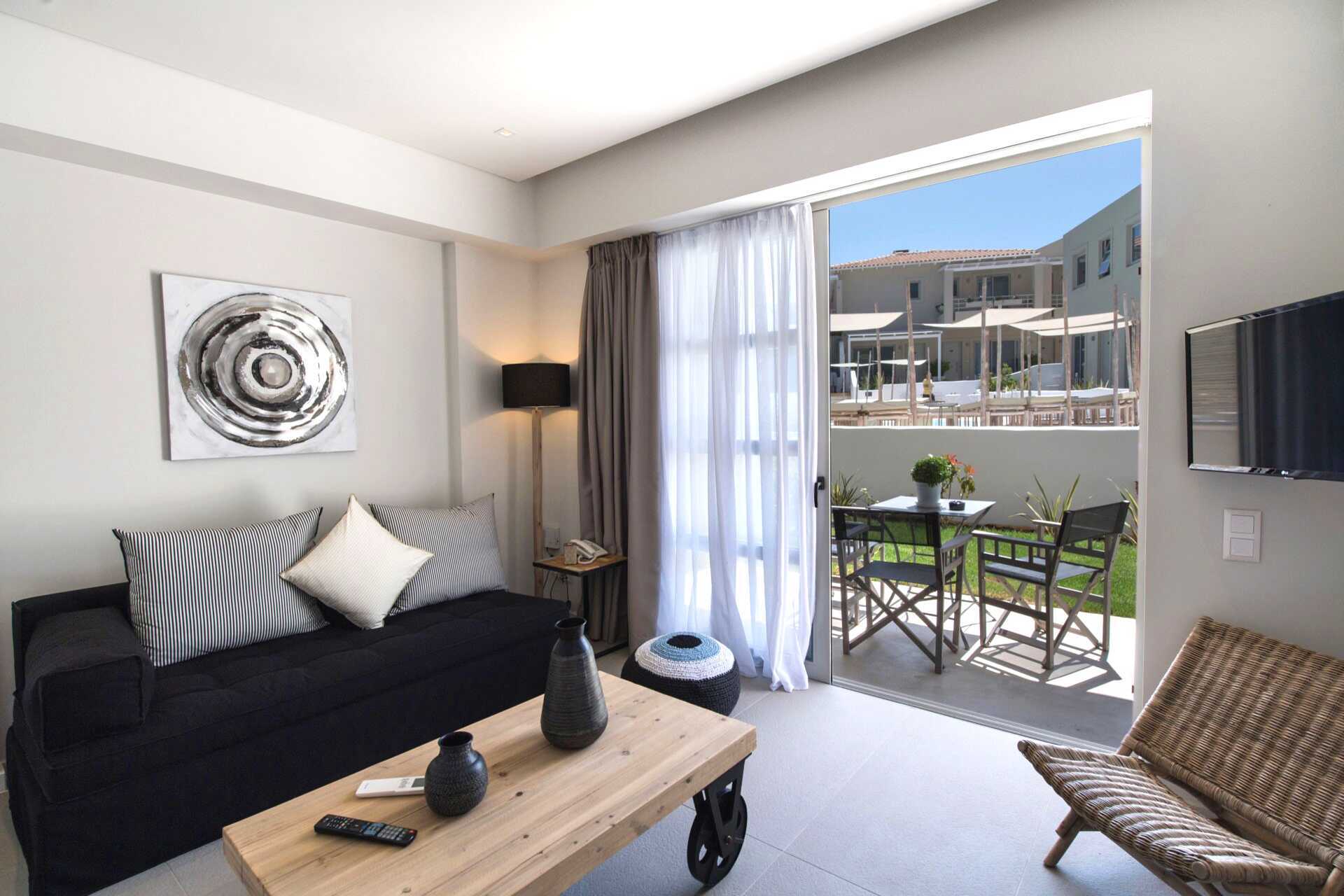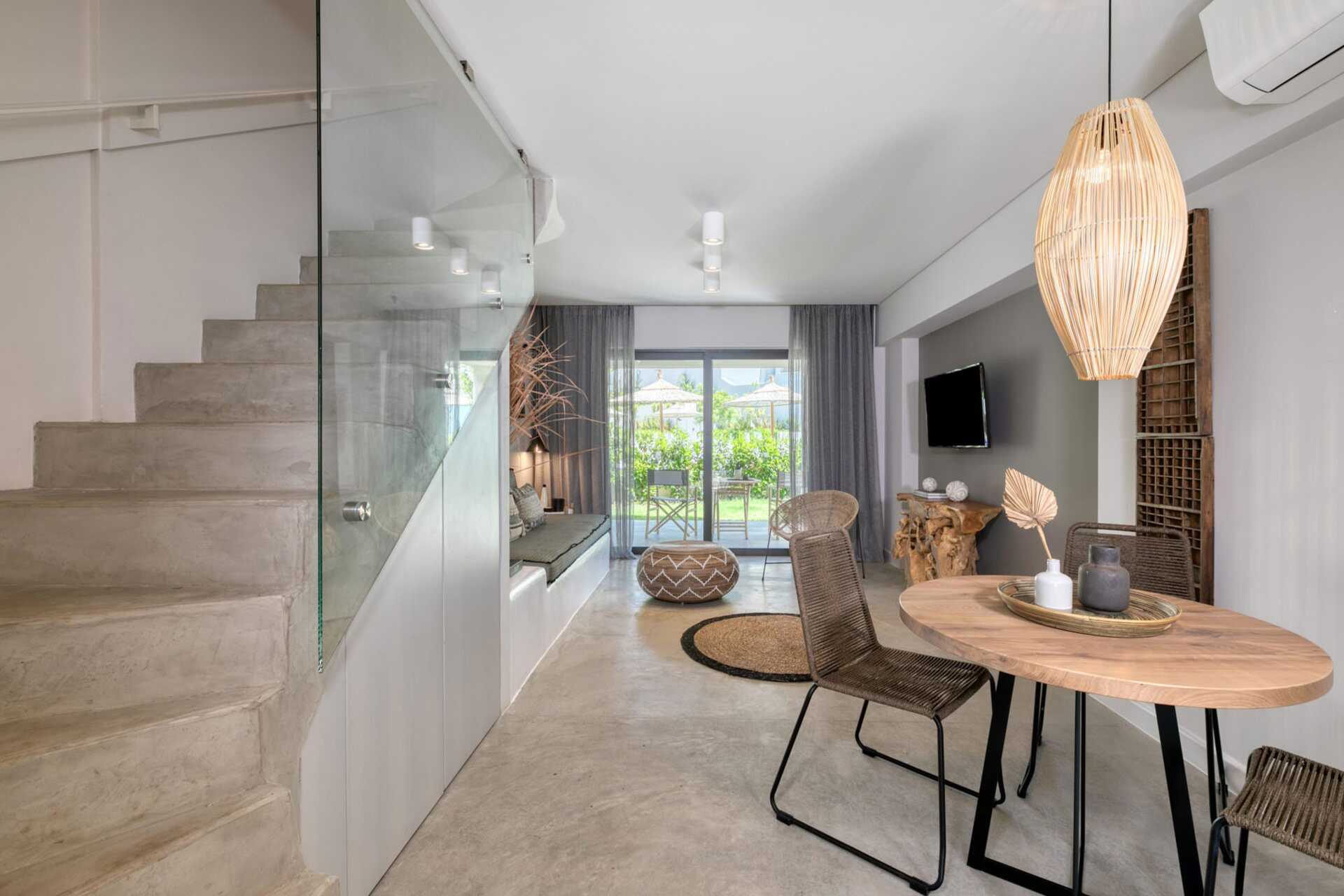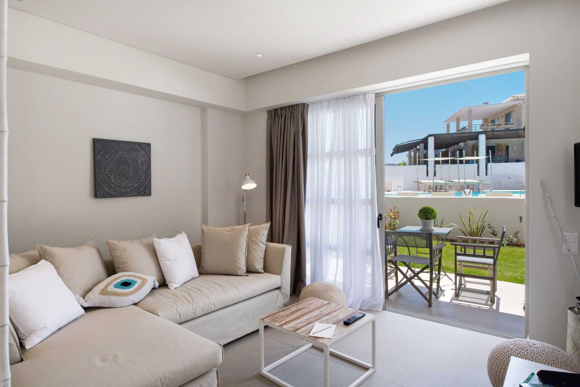 Suite med terrasse og pooludsigt. I entréetagen er der opholdsrum med spiseplads (nogle gange ved bardisken) og sofa, toilet og terrasse. Ovenpå er der to soveværelser, hvoraf det ene har balkon. Et soveværelse med dobbeltseng og et soveværelse med to enkeltsenge og et badeværelse med bruser og toilet. Gratis wifi, aircondition og deponering. Minibar. El-kedel og kaffe/te. Tv med internationale kanaler. Hårtørrer. Rengøring 7 gange om ugen.