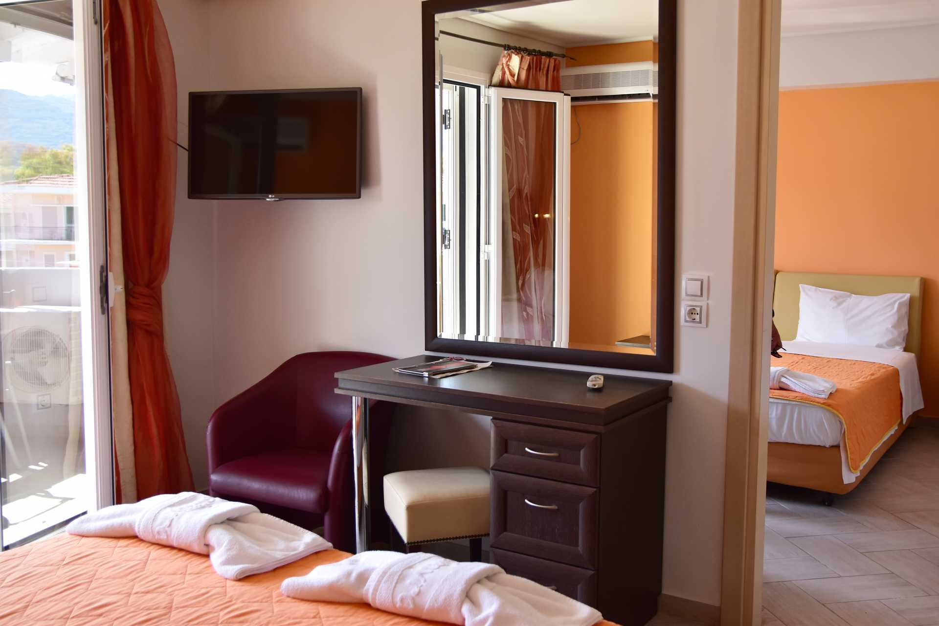 Familie-værelse med balkon. Familie-værelset består af to soveværelser. Et soveværelse med en dobbeltseng og det andet med to enkeltsenge. Nogle familie-værelser har et lille minikøkken. Nogle værelser har el-kedel. Køleskab med fryseboks. Gratis wifi. Aircondition og deponering mod betaling. Tv med lokale kanaler. Badeværelse med bruser og toilet. Rengøring 6 gange om ugen.