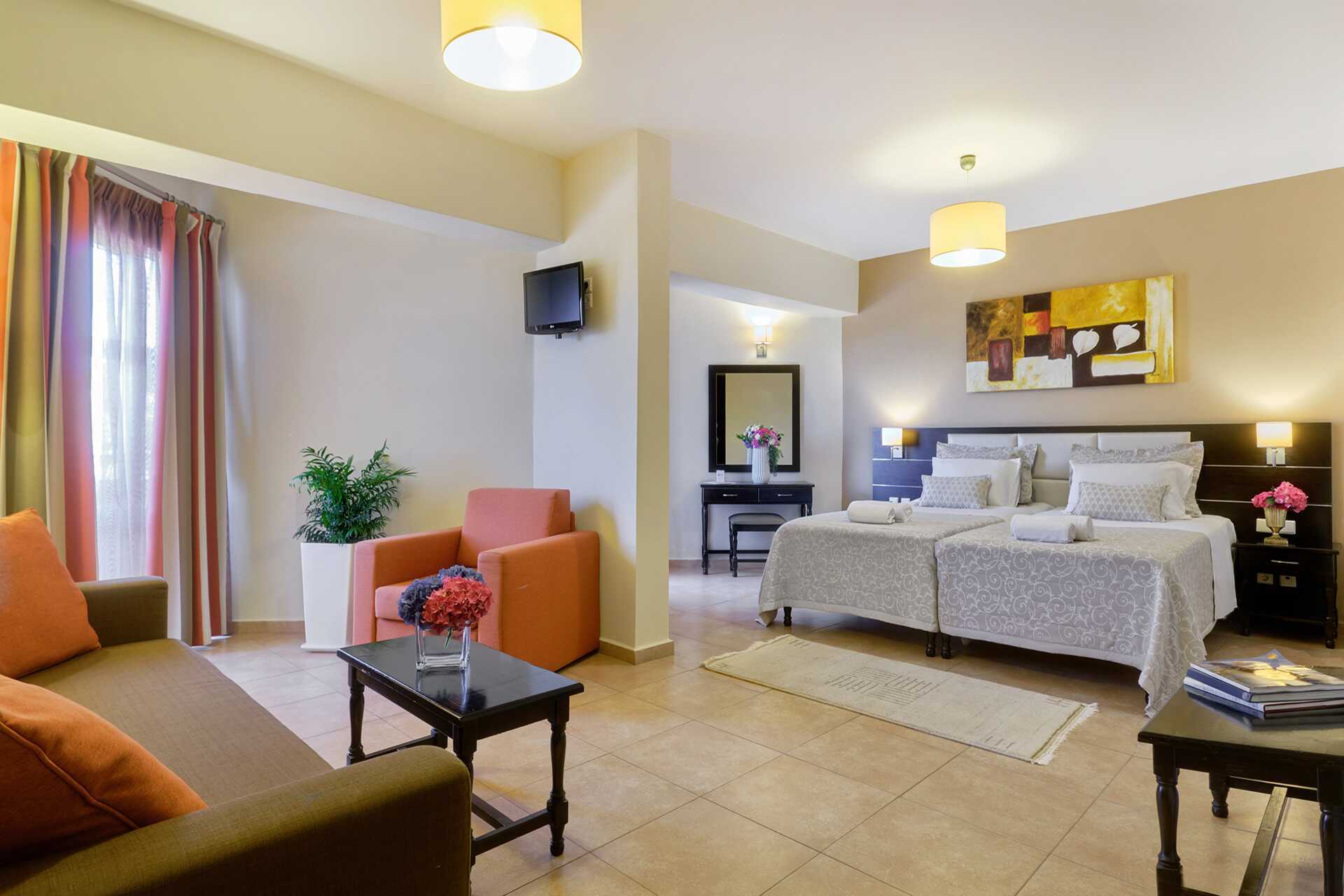Familie-værelse med balkon. Familie-værelset består af et soveværelse med to enkeltsenge og et opholdsrum med mulighed for ekstra opredninger i en sovesofa. Gratis wifi, aircondition og deponering. Køleskab. El-kedel og kaffe/te. Nespresso-maskine. Tv med satellitkanaler. Tøfler. Hårtørrer. Badeværelse med bruser og toilet. Rengøring 7 gange om ugen.