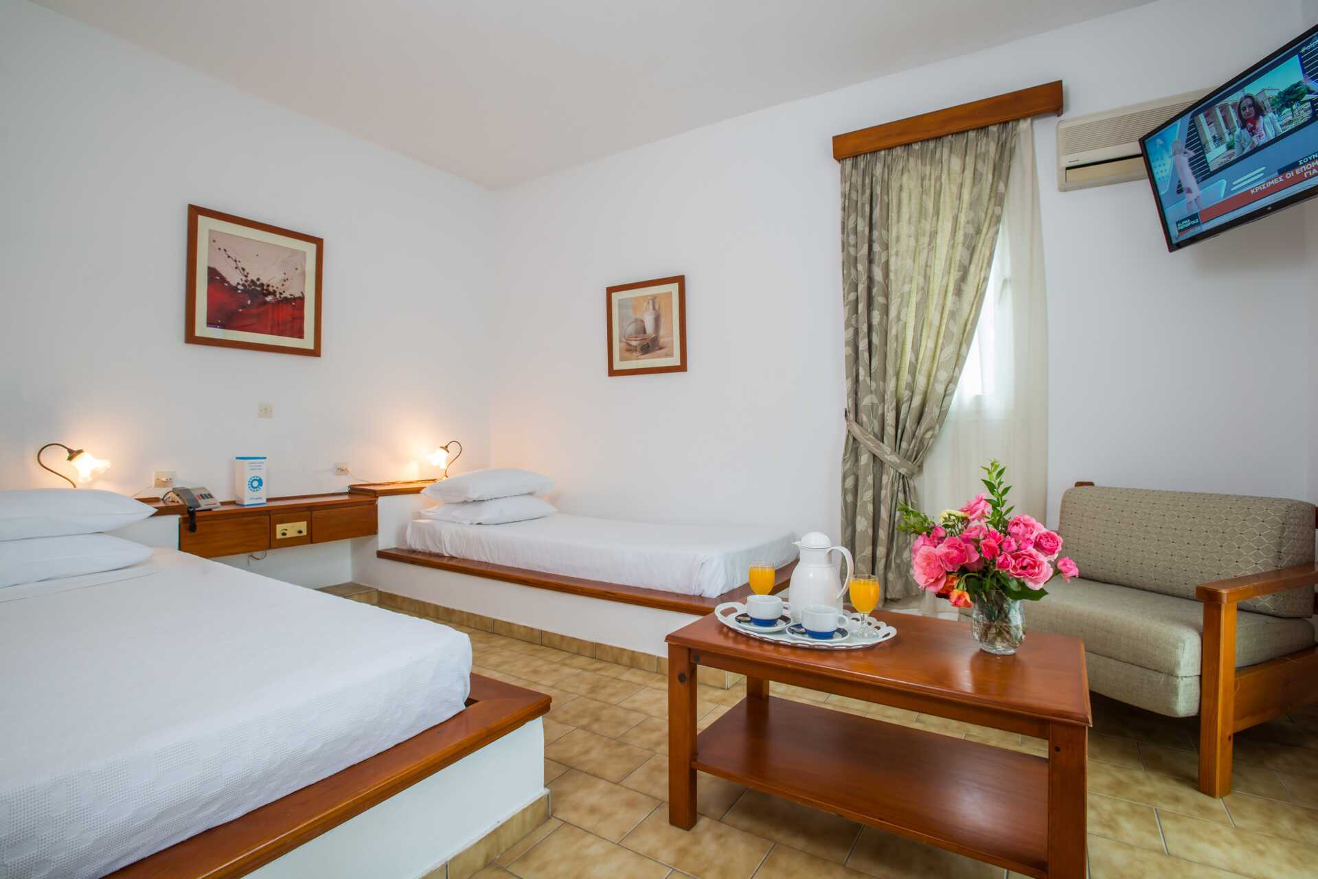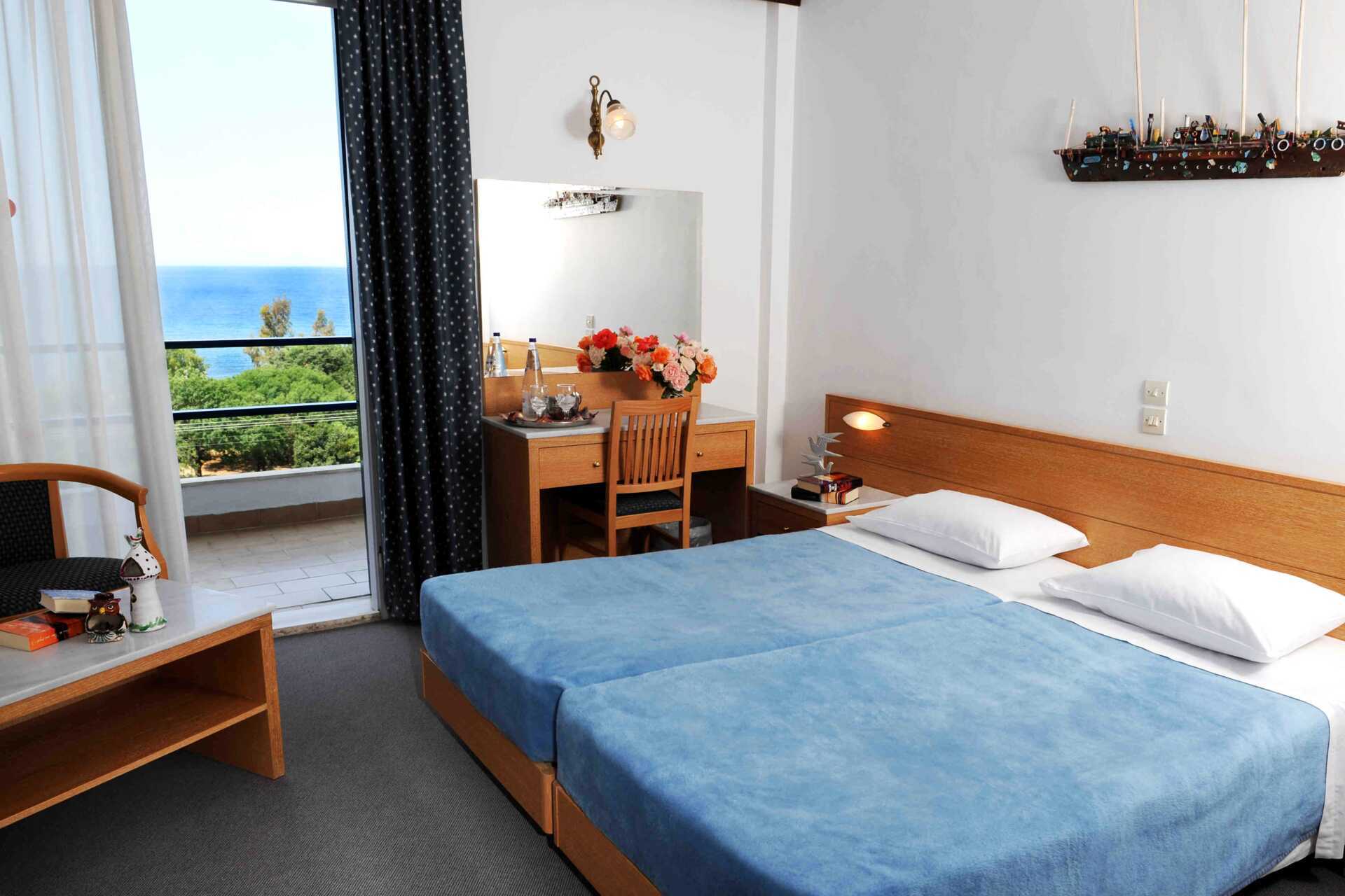 Dobbeltværelse med balkon og havudsigt. En dobbeltseng eller to enkeltsenge. Mulighed for en ekstra opredning til et barn. Gratis wifi, aircondition og deponering. Minibar. Tv med internationale kanaler. Hårtørrer. Badeværelse med bruser og toilet. Rengøring 6 gange om ugen.