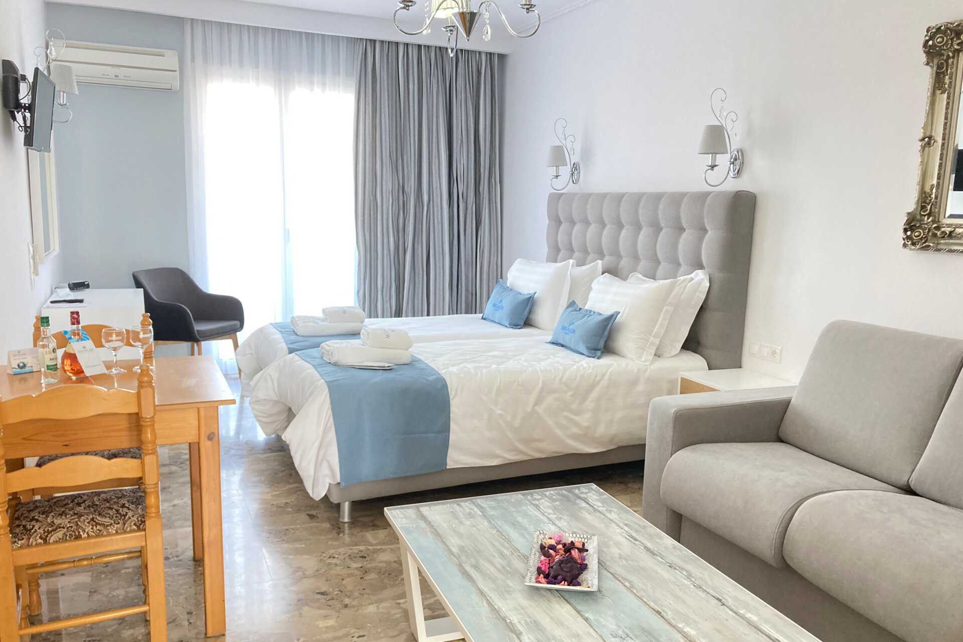 1-værelses lejligheder deluxe med balkon eller terrasse. Soveværelse kombineret med minikøkken. En dobbeltseng eller to enkeltsenge. Mulighed for ekstra opredning i sovesofa. Minikøkken med kogeplader, ovn, el-kedel, kaffemaskine, mikroovn, brødrister, Nespresso maskine - kapsler medfølger ved ankomst samt enkelt køkkenudstyr. Spiseplads ved bardisken. Gratis wifi, aircondition og deponering. Tv med internationale kanaler. Strygefaciliteter. Badekåber og tøfler. Hårtørrer. Badeværelse med bruser og toilet. Rengøring 6 gange om ugen.