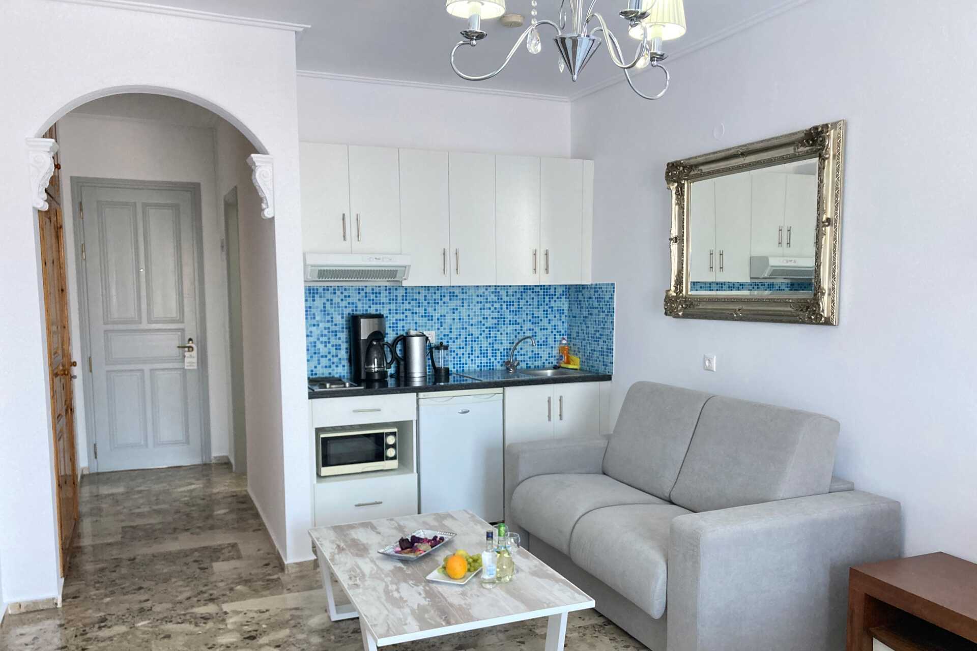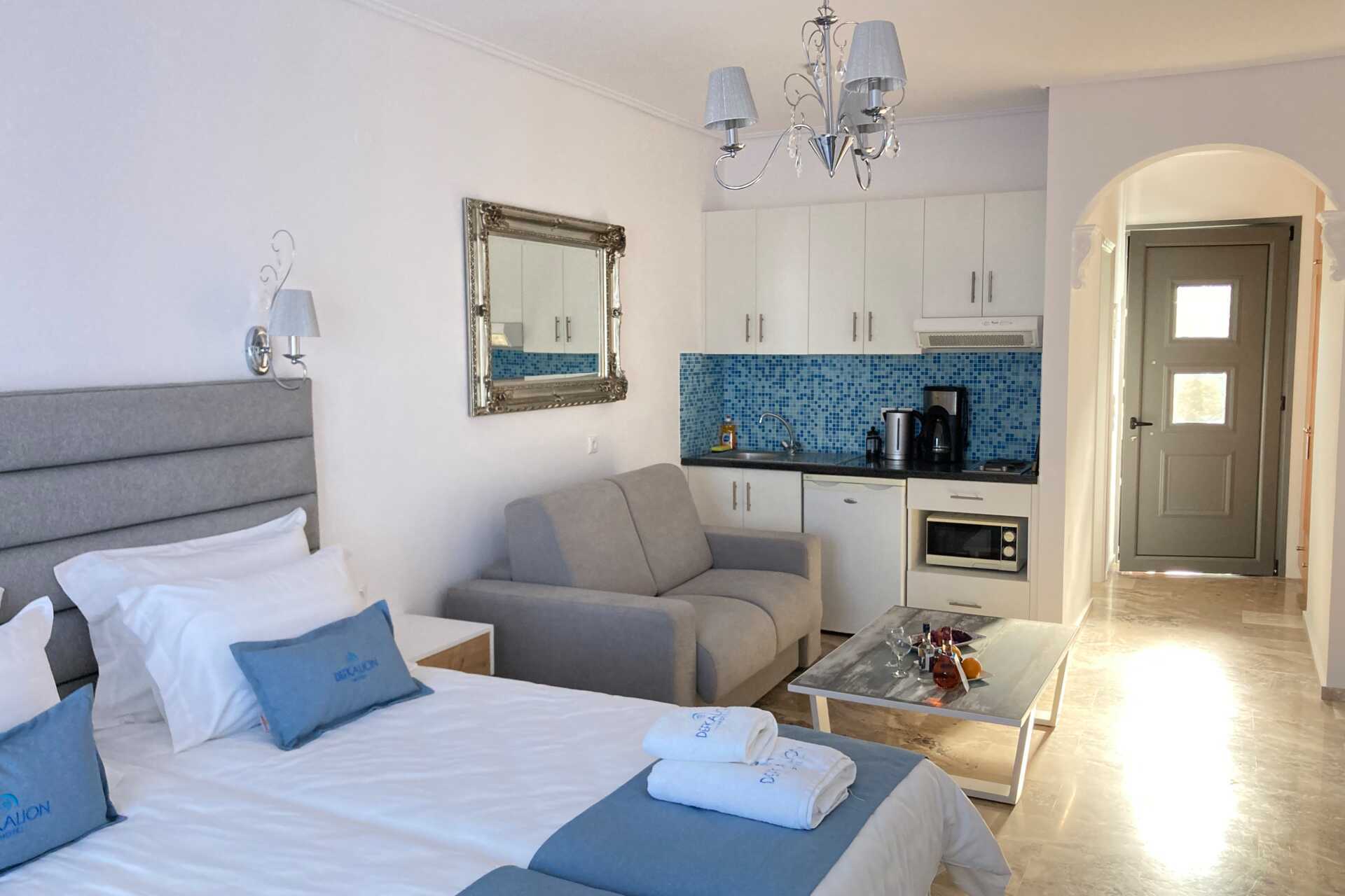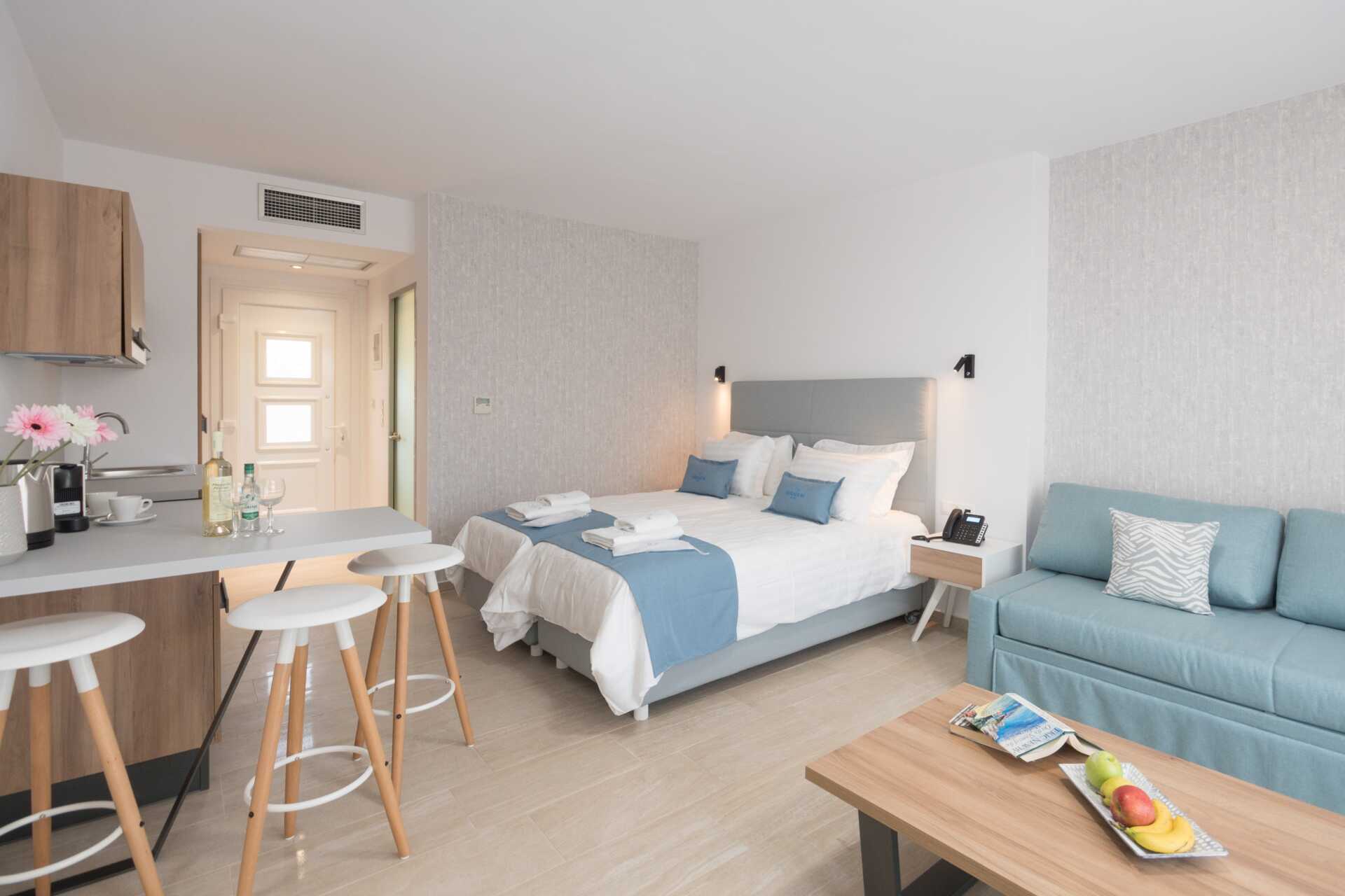 1-værelses lejligheder med balkon eller terrasse. Soveværelse kombineret med minikøkken. En dobbeltseng eller to enkeltsenge. Mulighed for ekstra opredning i sovesofa. Minikøkken med kogeplader, el-kedel, kaffemaskine, mikrobølgeovn, brødrister og enkelt køkkenudstyr. Gratis wifi, aircondition og deponering. Tv med internationale kanaler. Badekåber og tøfler. Hårtørrer. Badeværelse med bruser og toilet. Rengøring 6 gange om ugen.