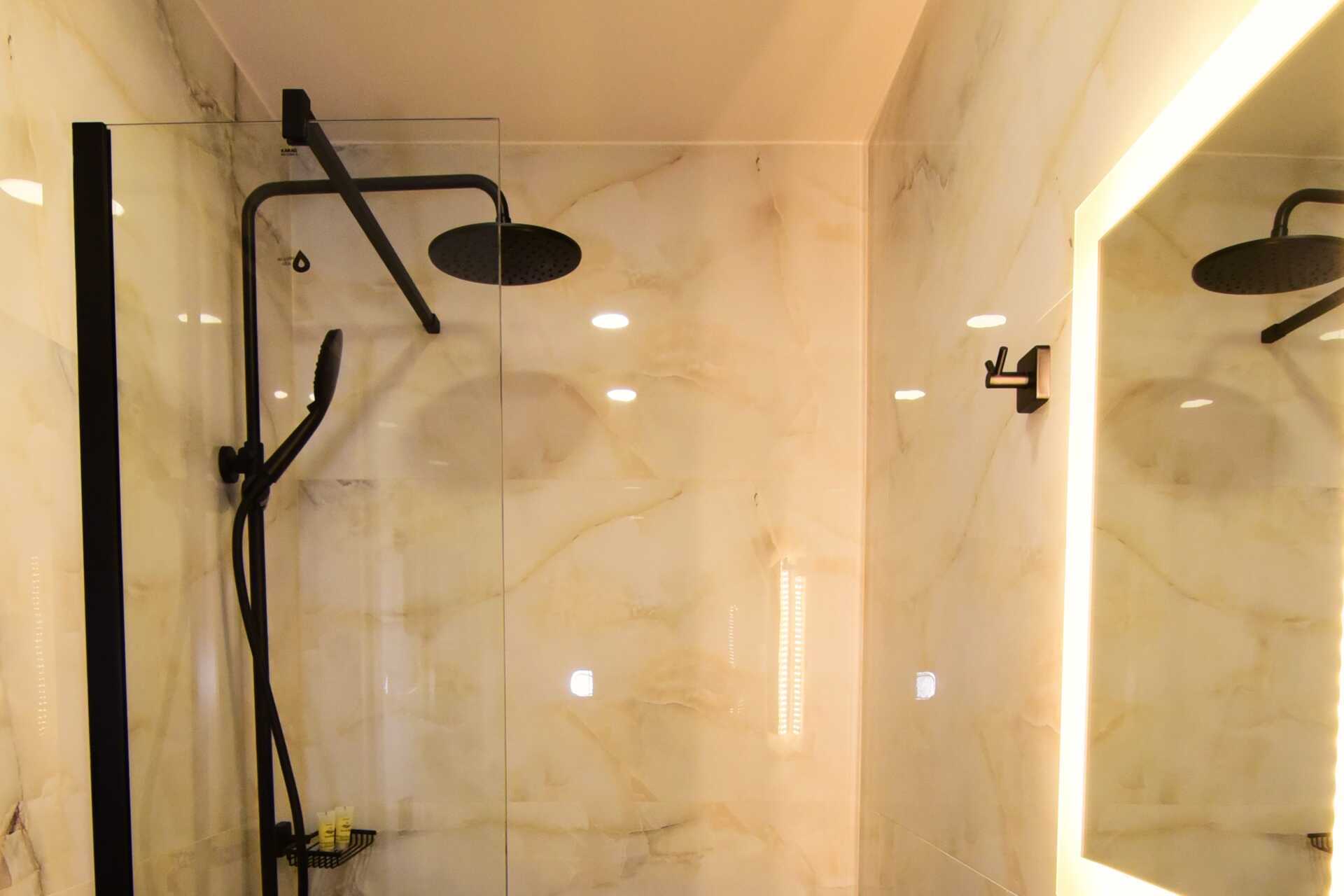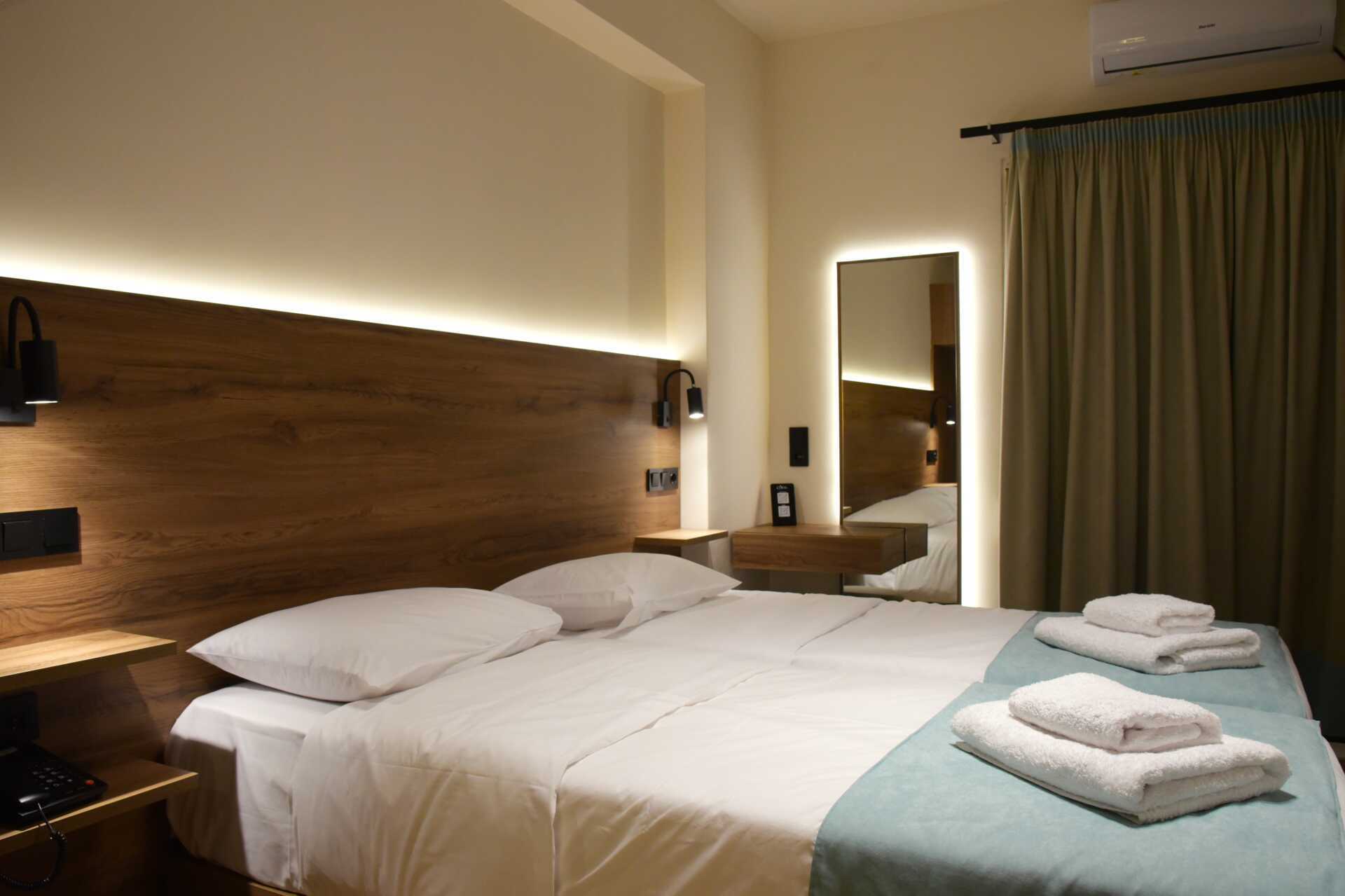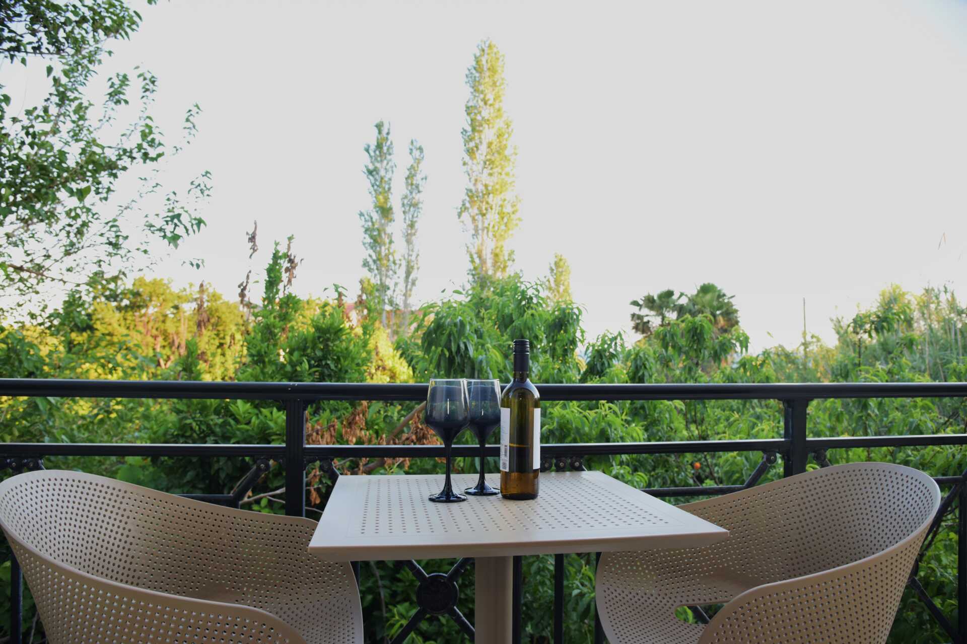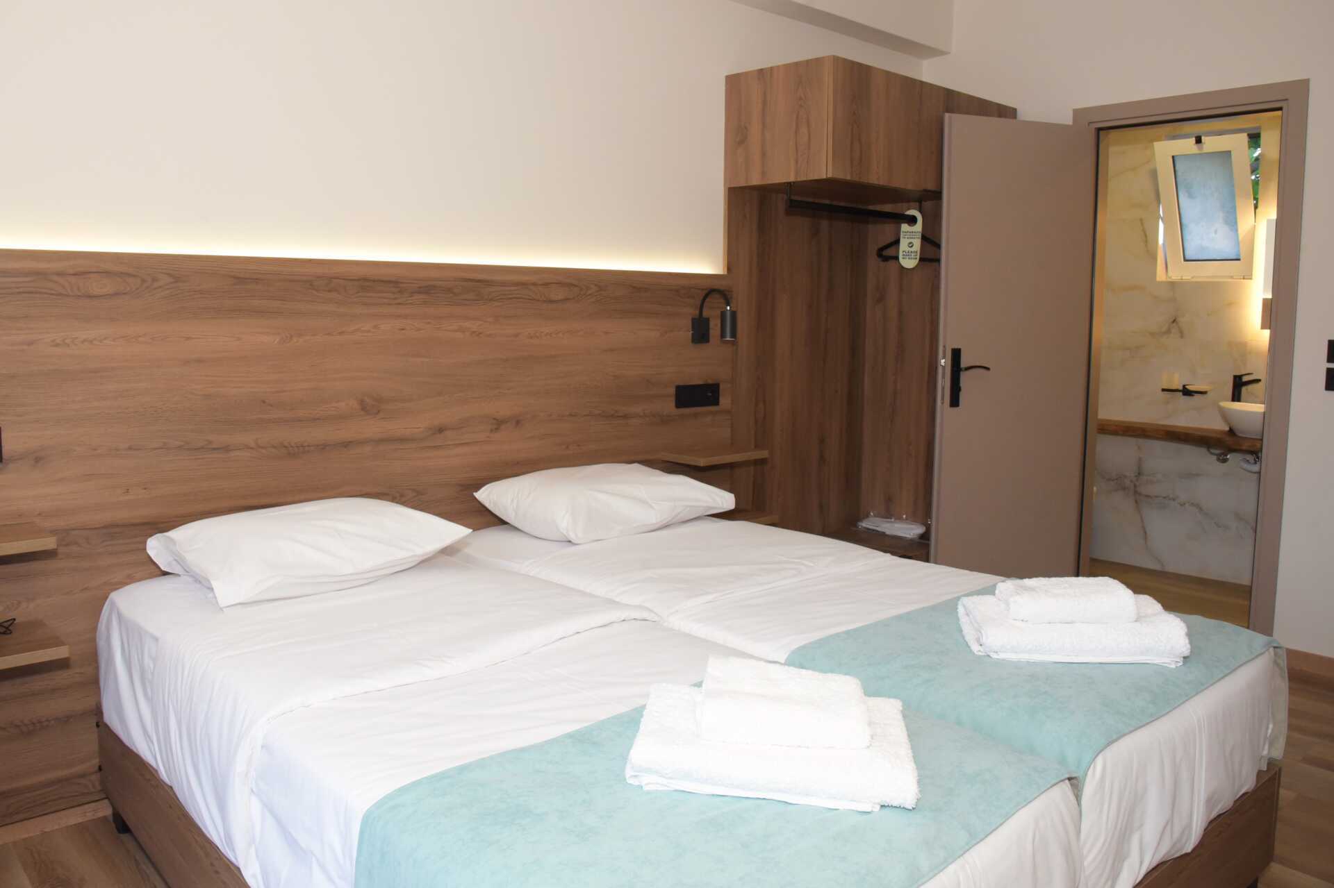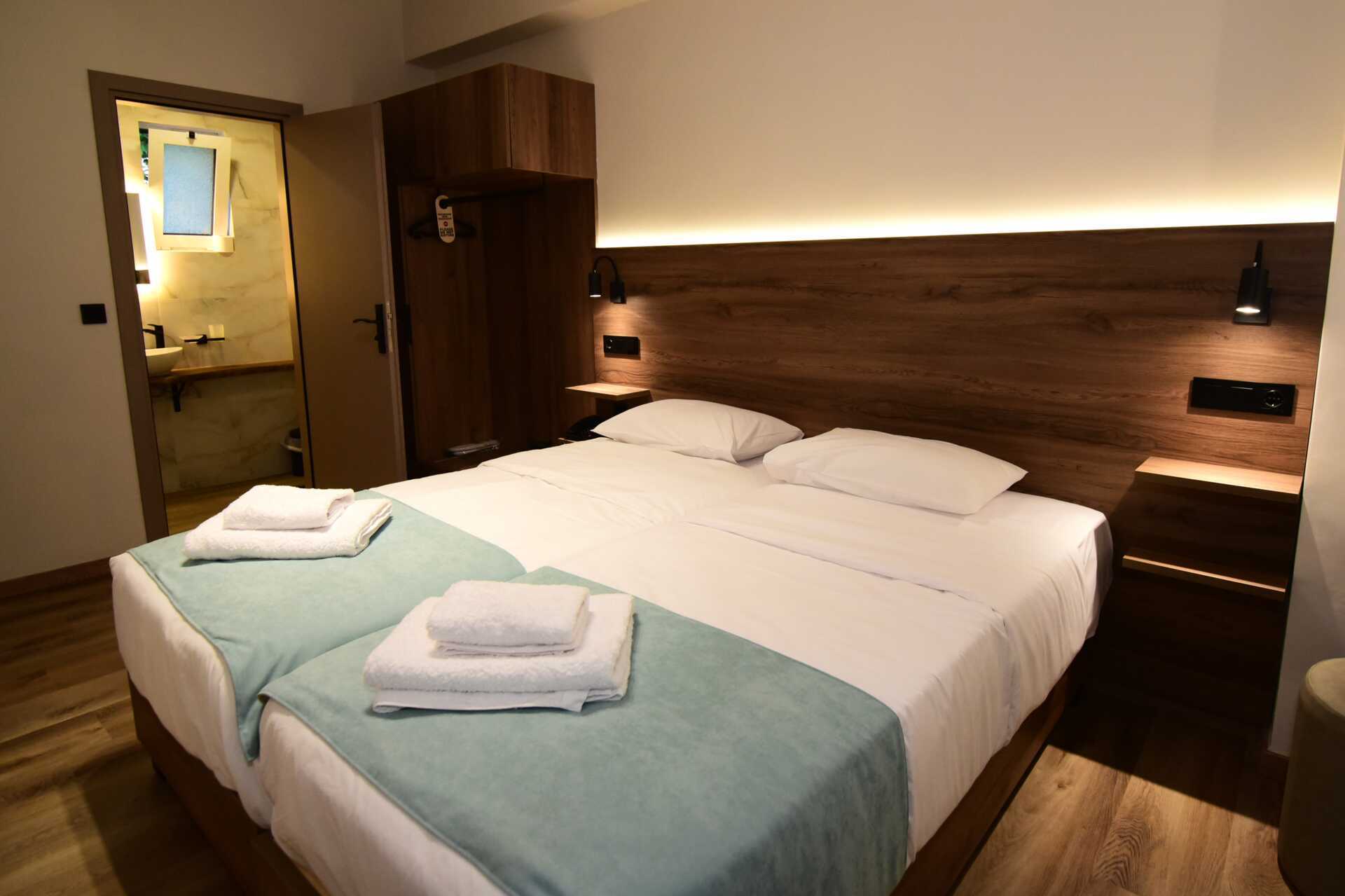 Dobbeltværelse med balkon eller terrasse i stueplan. Terrassen har udendørs møbler ved indgangen, hvor andre gæster går forbi. En dobbeltseng eller to enkeltsenge. Alle værelser med terrasse har to enkeltsenge. Gratis wifi, aircondition og deponering. Køleskab. El-kedel. Tv med internationale kanaler. Badeværelse med bruser og toilet. Rengøring 7 gange om ugen.