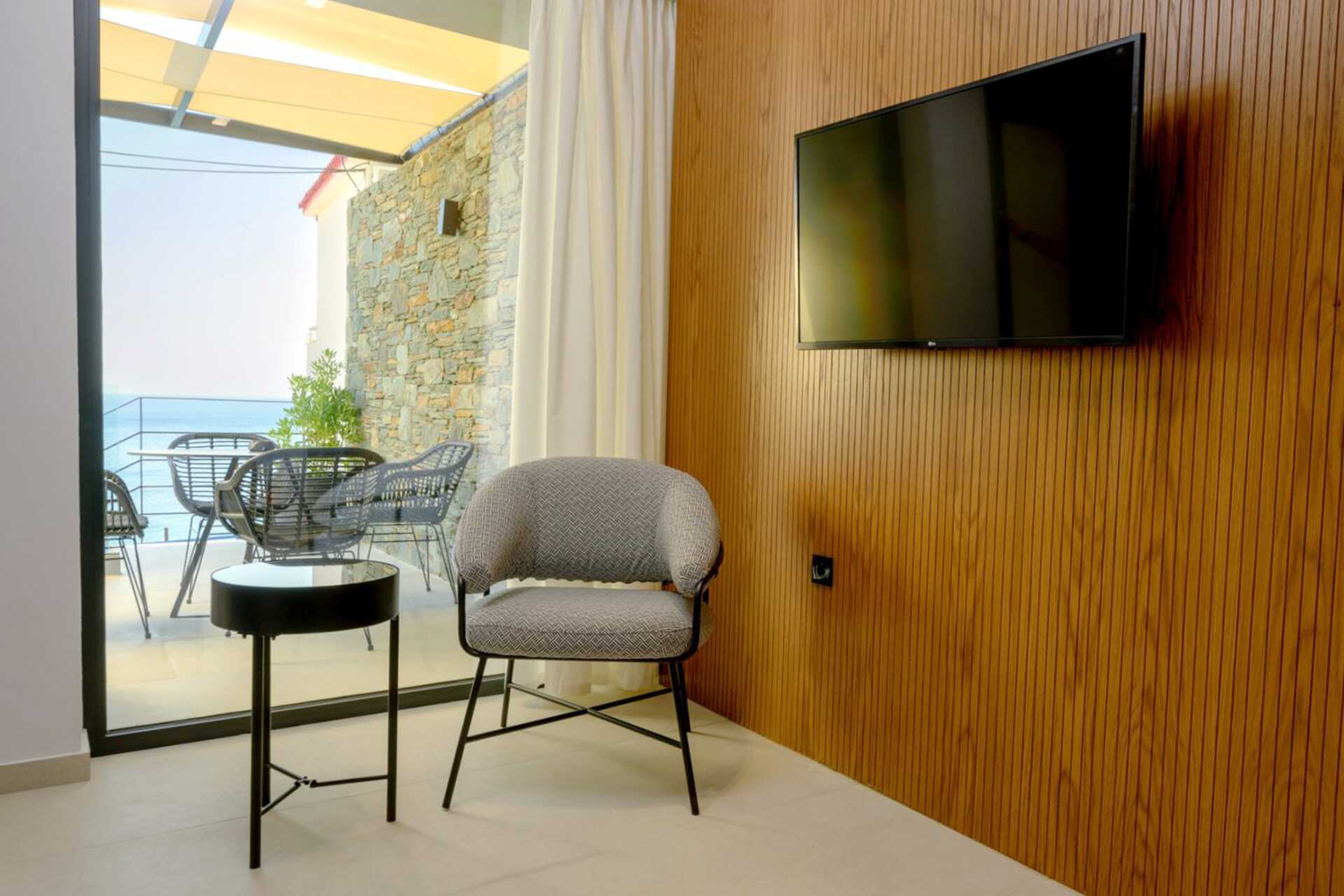 1-værelses lejlighed i etage med balkon og havudsigt. I stueplan er der kombineret opholdsrum med minikøkken og badeværelse. Ovenpå op af en trappe er der hems med dobbeltseng. Minikøkken med kogeplader, køleskab, opvaskemaskine, mikrobølgeovn og enkelt køkkenudstyr. Nespresso-maskine, 6 kapsler indgår. Vaskemaskine og damper. Der medfølger vaskemiddel og opvaskemiddel til maskinerne. Gratis wifi, aircondition og deponering. Tv med internationale kanaler og Netflix. Badekåber og tøfler. Badeværelse med bruser og toilet. Rengøring 7 gange om ugen.