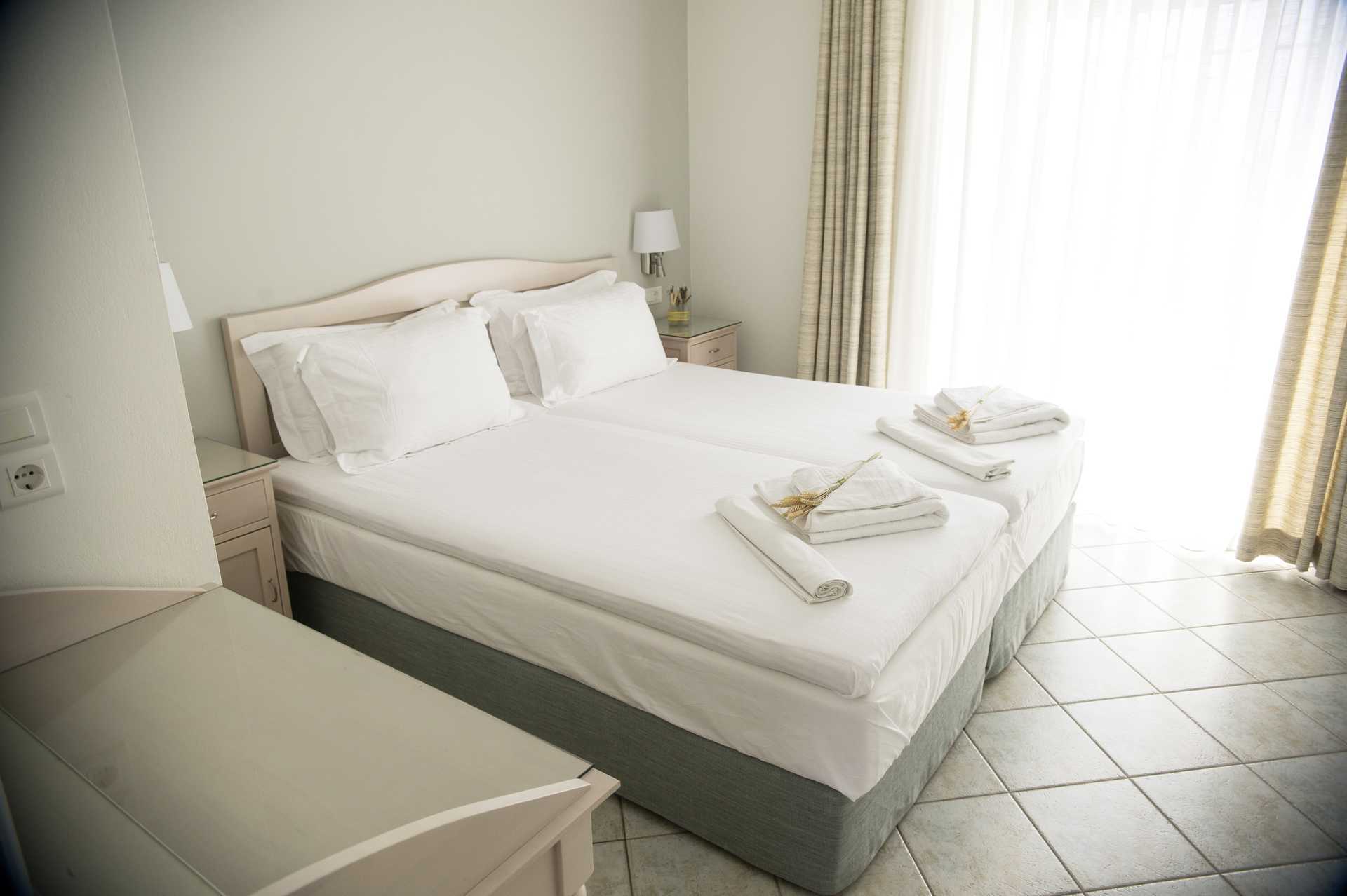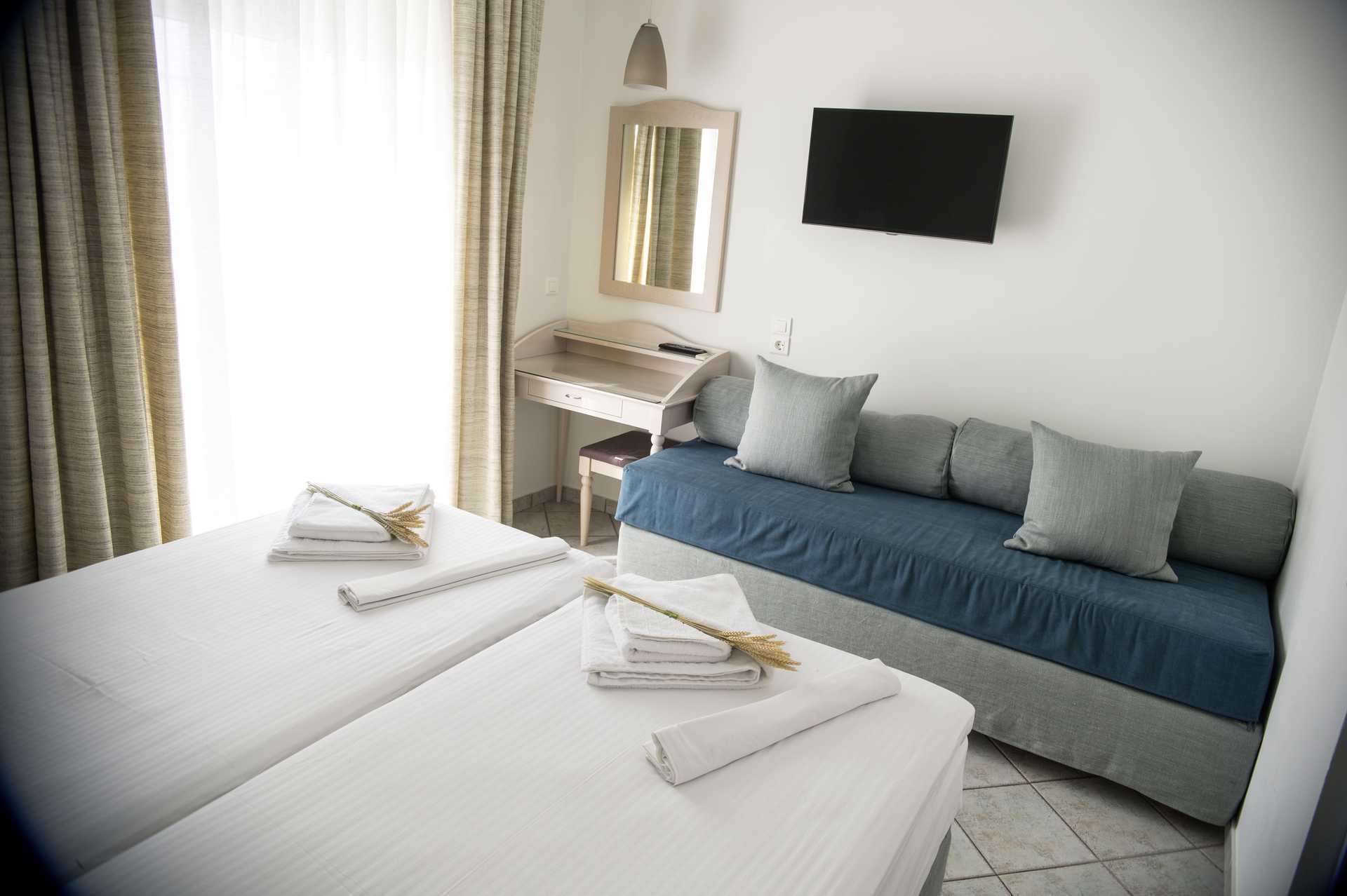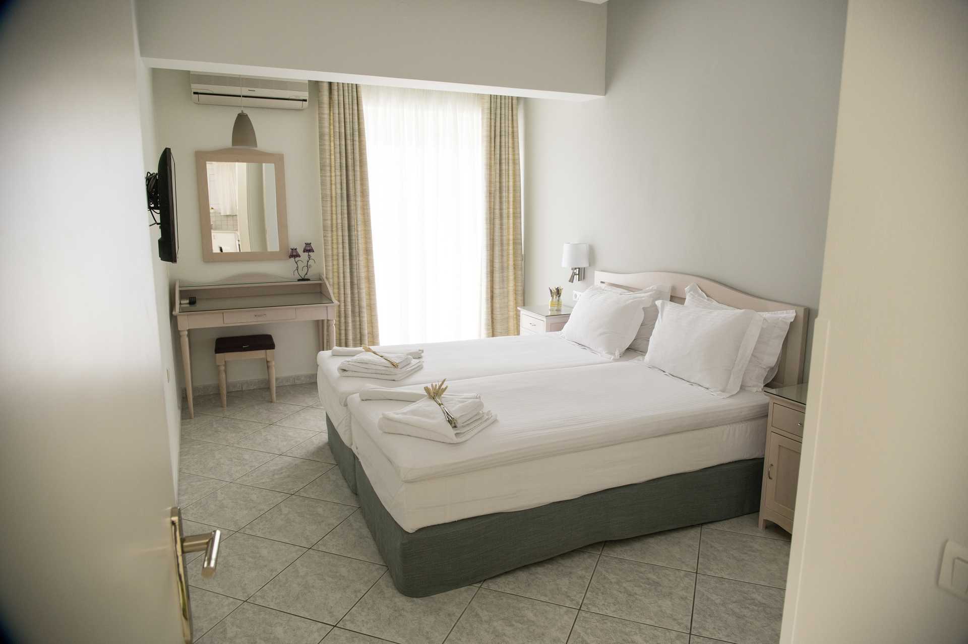 3-værelses lejlighed med balkon i stueplan og havudsigt. To soveværelser og et kombineret opholdsrum med minikøkken. To enkeltsenge i hvert soveværelse. Mulighed for ekstra opredning i sovesofa. Minikøkken med kogeplader, ovn, køleskab, kaffemaskine, el-kedel, brødrister, sandwichgrill og enkelt køkkenudstyr. Gratis wifi, aircondition og deponering. Tv med internationale kanaler. Hårtørrer. Badeværelse med badekar og bruser samt toilet. Rengøring 5 gange om ugen.