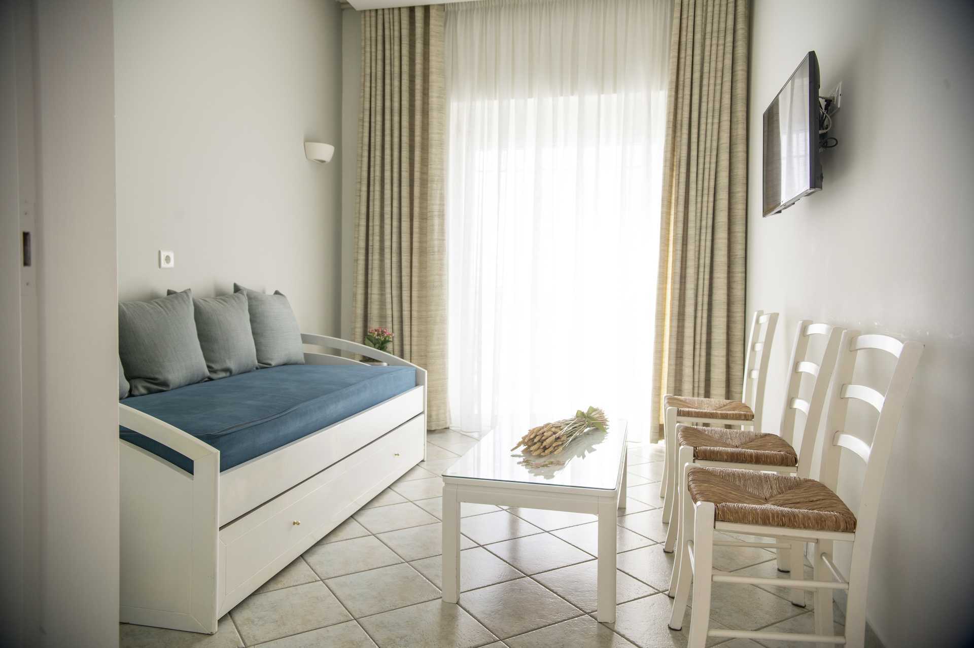 2-værelses lejlighed superior med balkon og havudsigt. Et soveværelse og et kombineret opholdsrum med minikøkken. To enkeltsenge. Mulighed for ekstra opredninger i sovesofa. Minikøkken med kogeplader, ovn, køleskab, el-kedel, brødrister og enkelt køkkenudstyr. Gratis wifi, aircondition og deponering. Tv med internationale kanaler. Hårtørrer. Badeværelse med bruser og toilet. Rengøring 5 gange om ugen.