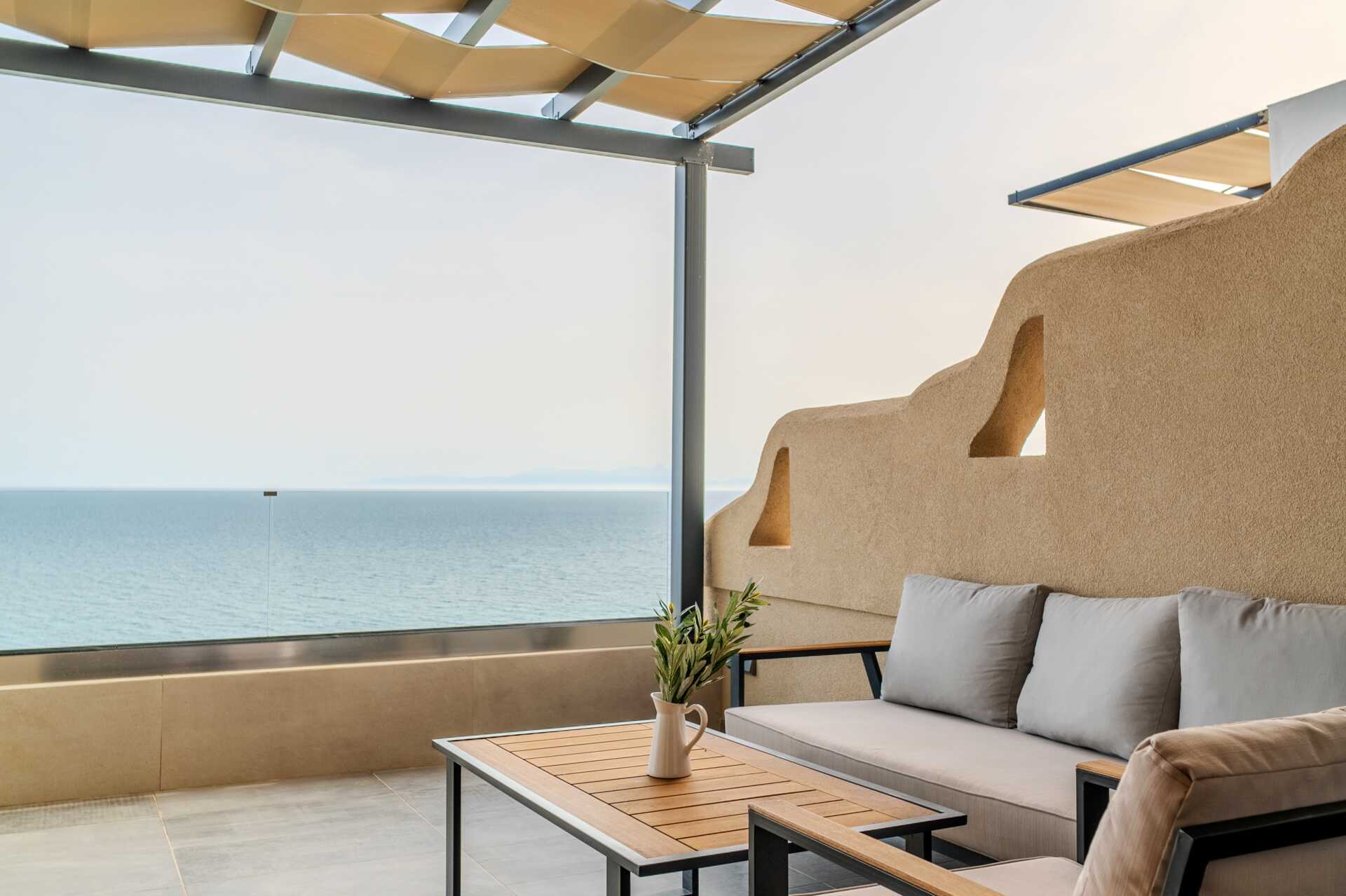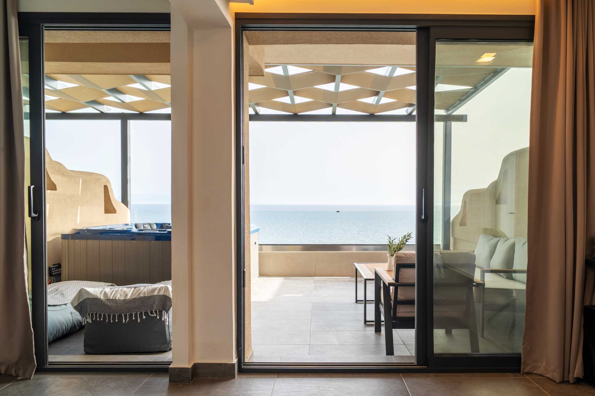 2-værelses lejlighed med balkon og havudsigt. På balkonen er der jacuzzi samt solstole og borde og stole. Soveværelse og kombineret opholdsrum med minikøkken. En dobbeltseng. Mulighed for ekstra opredninger i sovesofa. Minikøkken med kogeplader, køleskab med lille fryser, mikrobølgeovn, sandwichgrill og enkelt køkkenudstyr. Gratis wifi, aircondition og deponering. Tv med internationale kanaler. Damper. Badekåber. Hårtørrer. Badeværelse med bruser og toilet. Rengøring 7 gange om ugen.