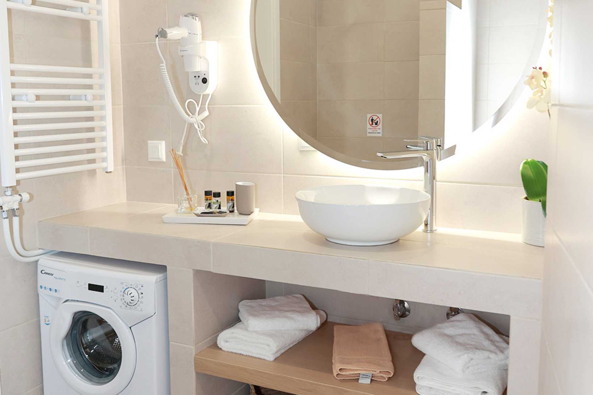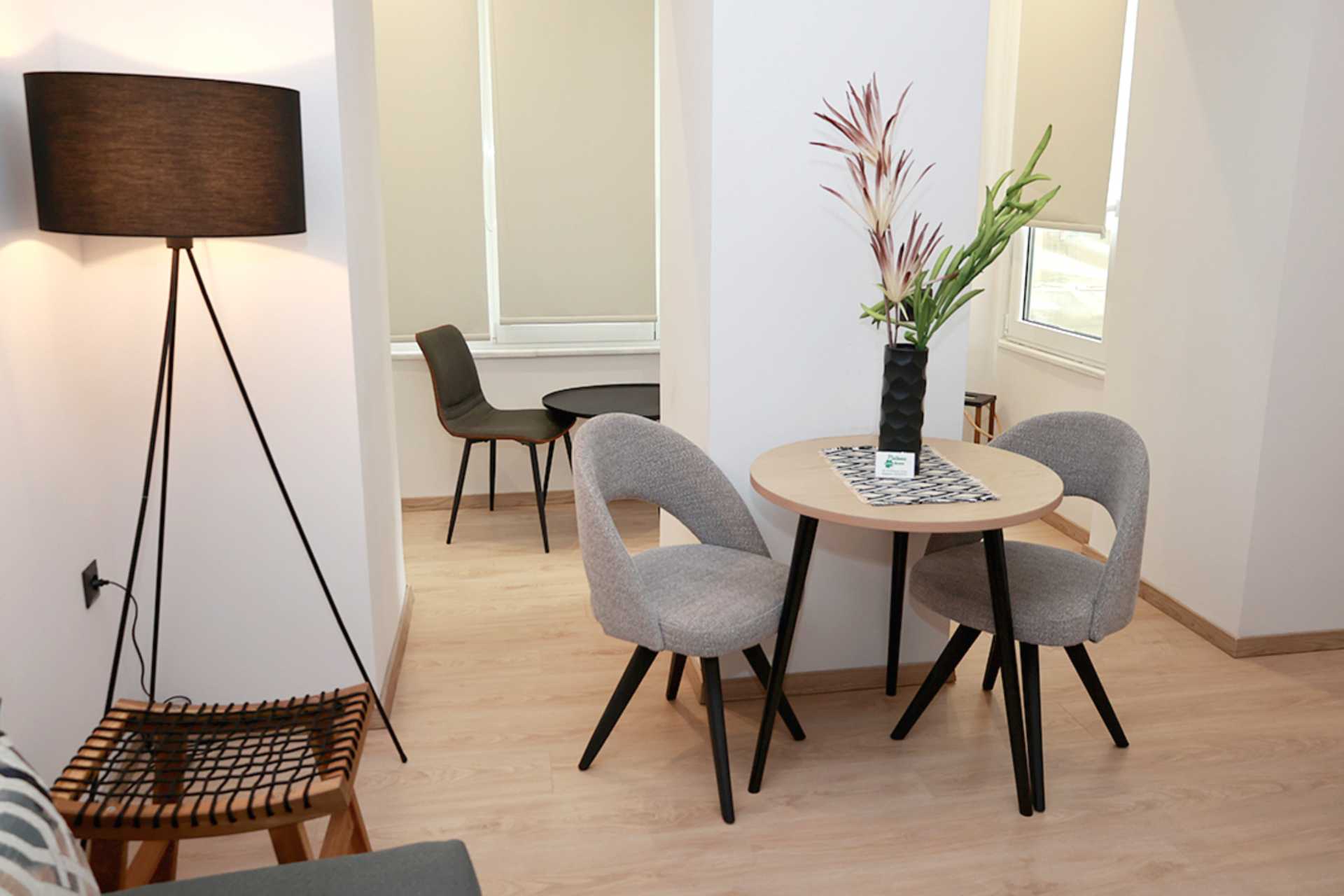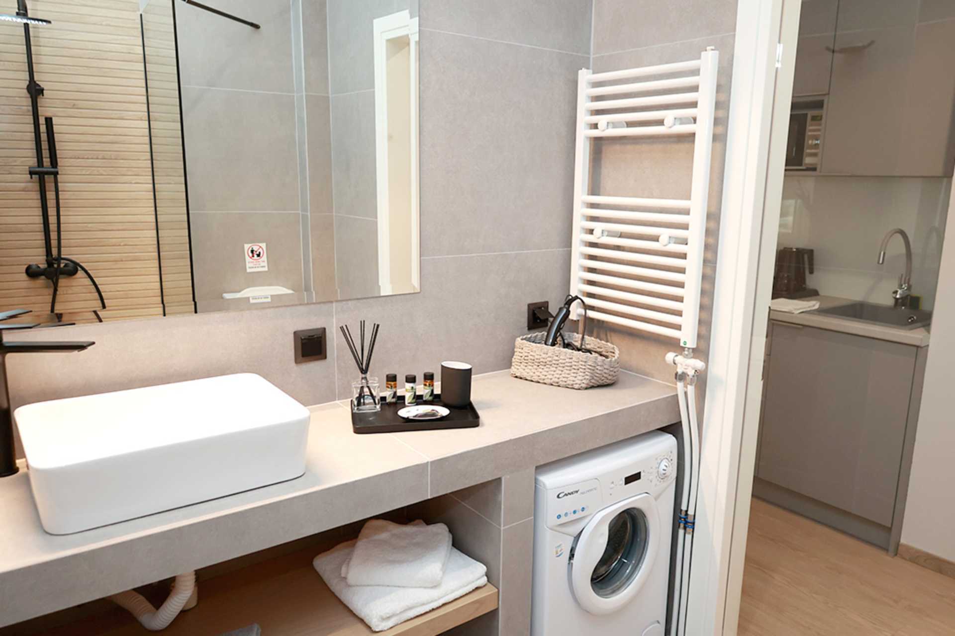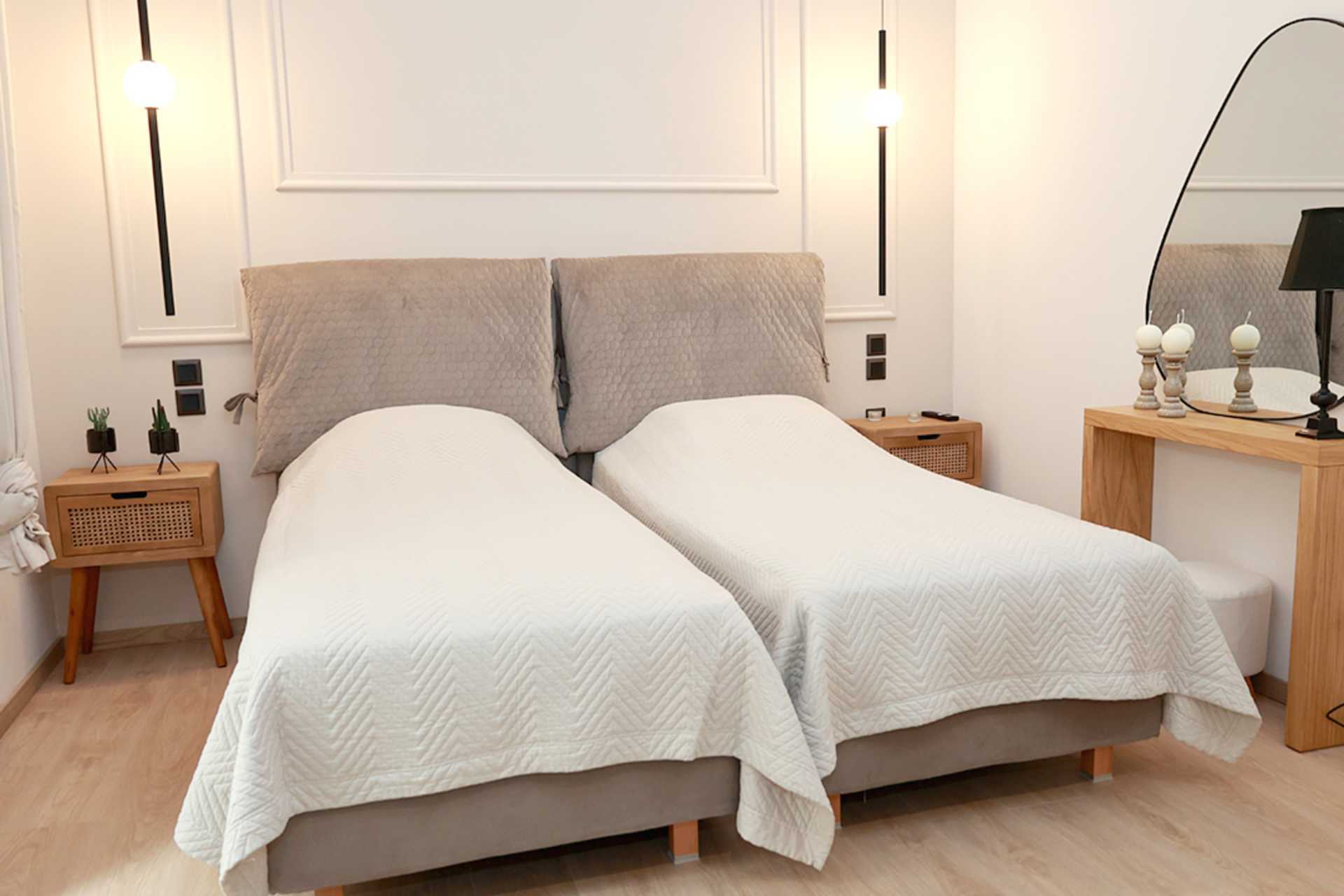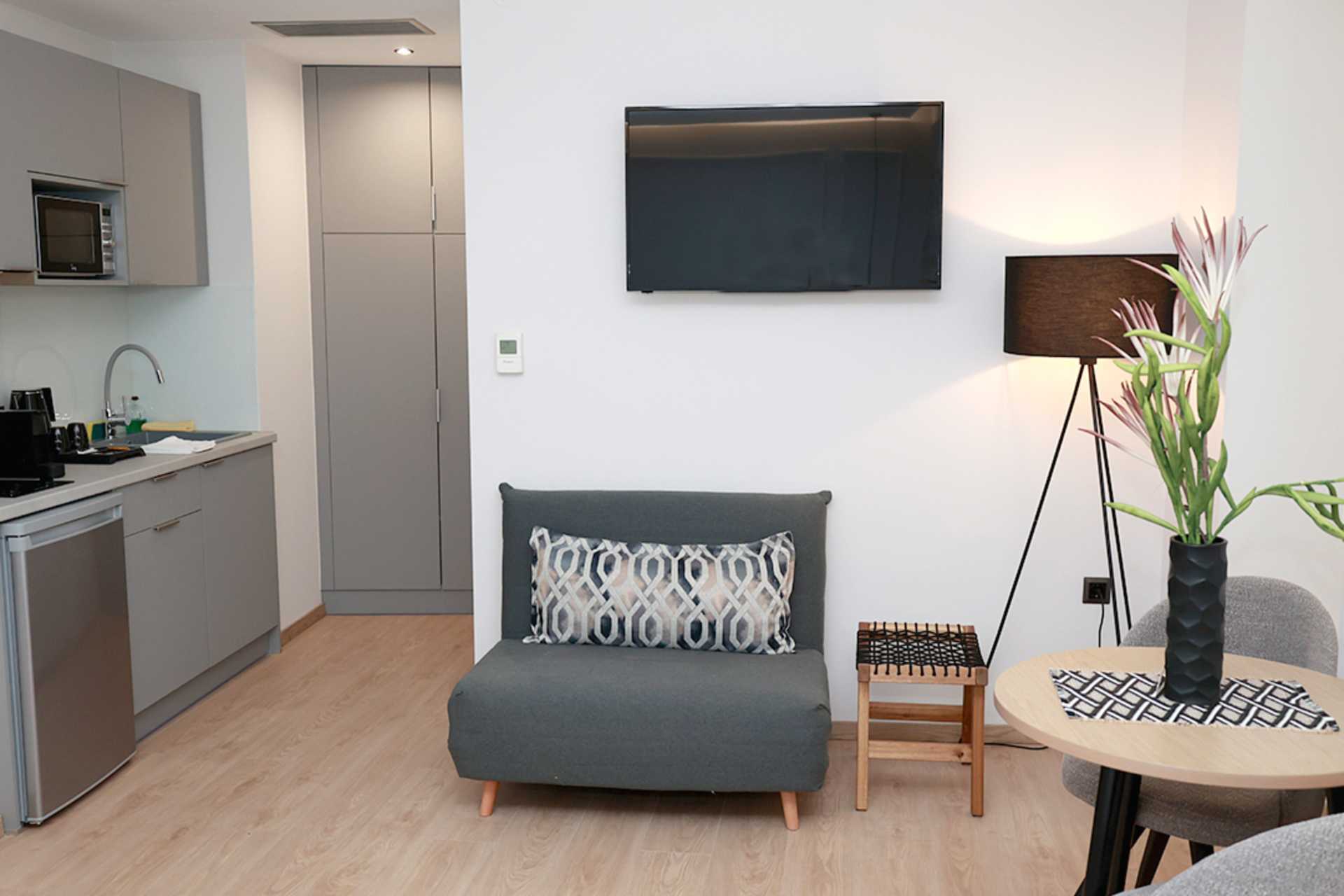 1-værelses lejlighed med terrasse i stueplan, med balkon eller stor balkon/terrasse. Soveværelse kombineret med minikøkken. To enkeltsenge. Mulighed for ekstra opredning i sovesofa i nogle lejligheder. Minikøkken med kogeplader, køleskab, mikrobølgeovn, el-kedel, kaffemaskine og enkelt køkkenudstyr. Gratis wifi, aircondition og deponering. Tv med internationale kanaler. Vaskemaskine. Badekåber. Hårtørrer. Badeværelse med bruser og toilet. Rengøring 6 gange om ugen.