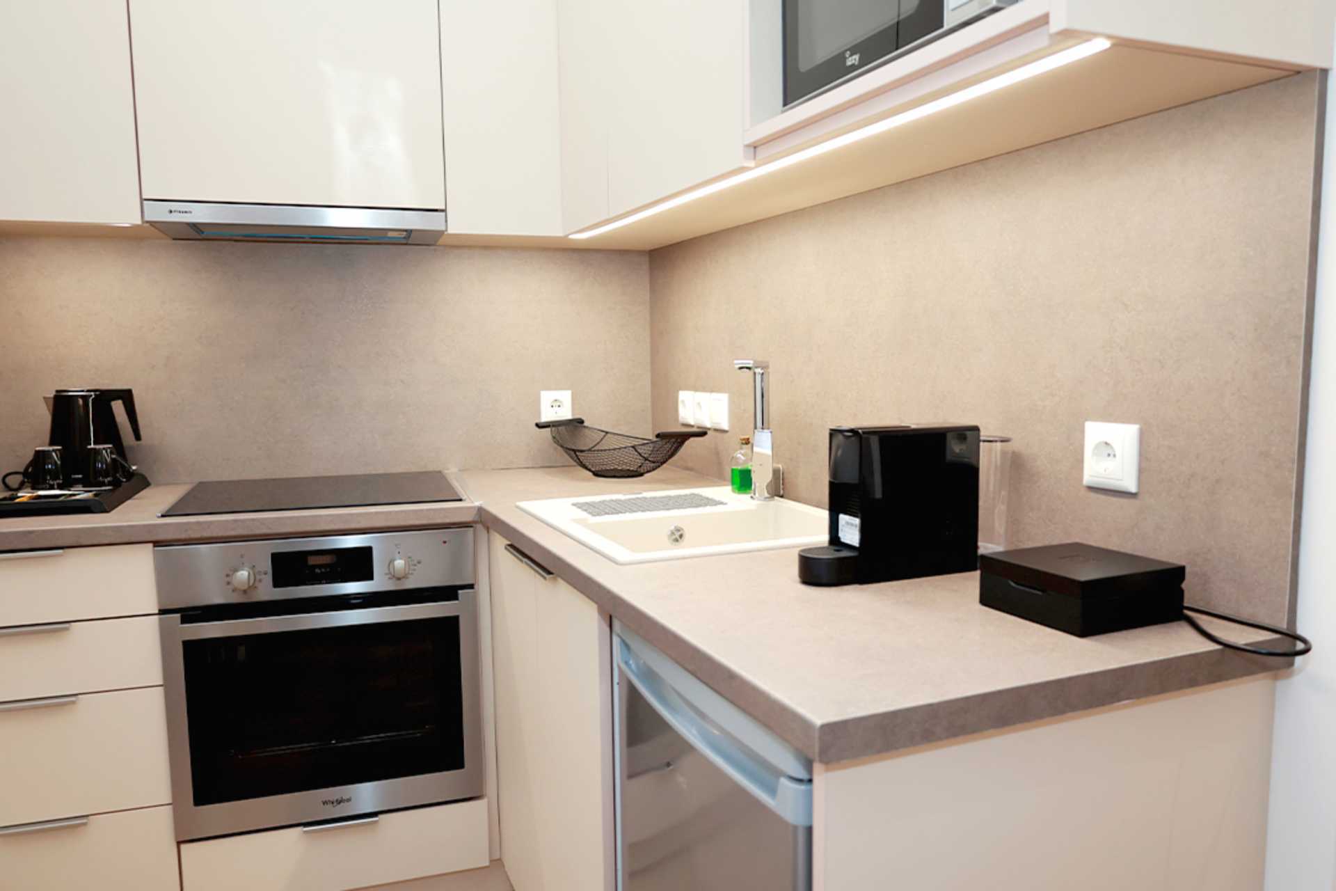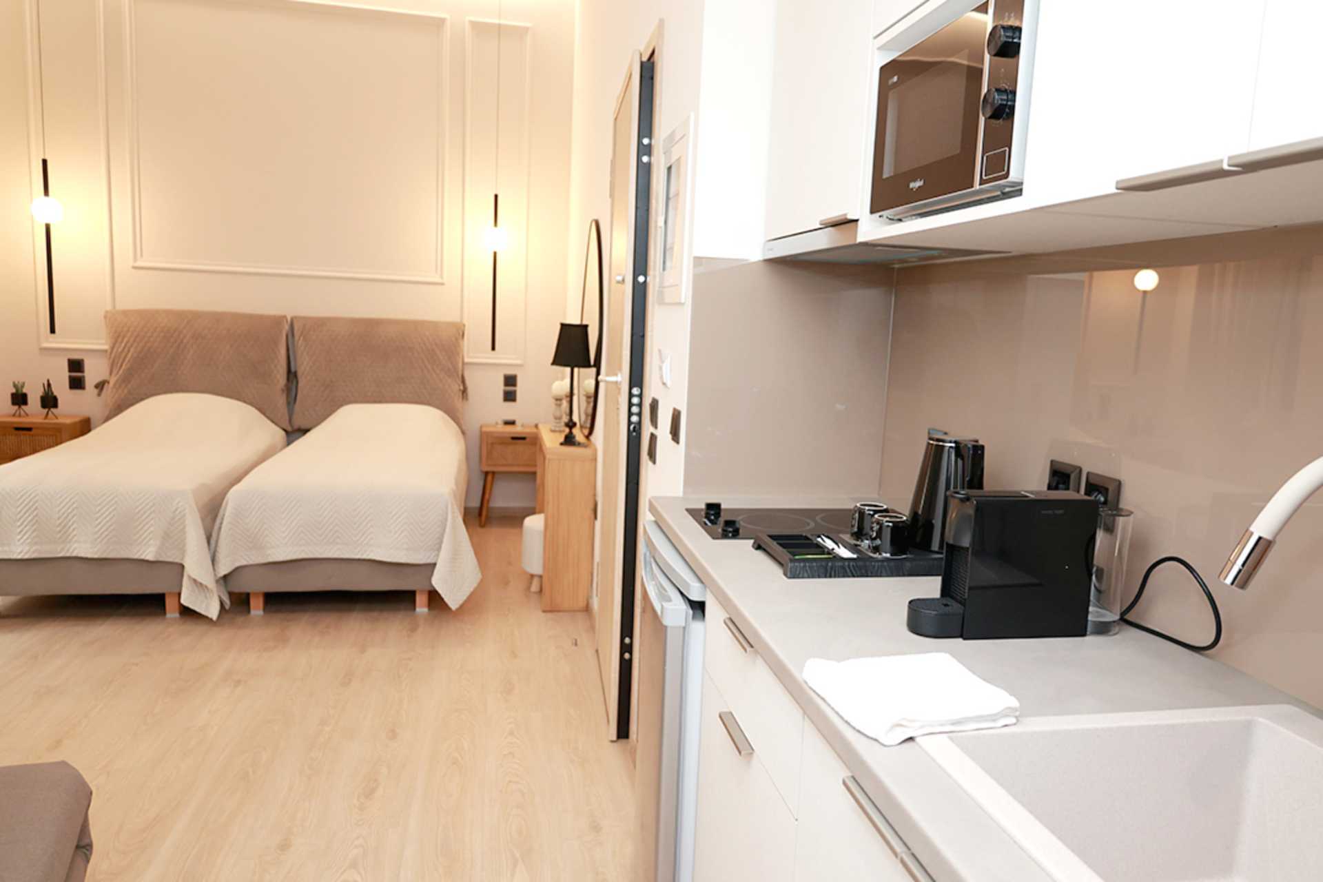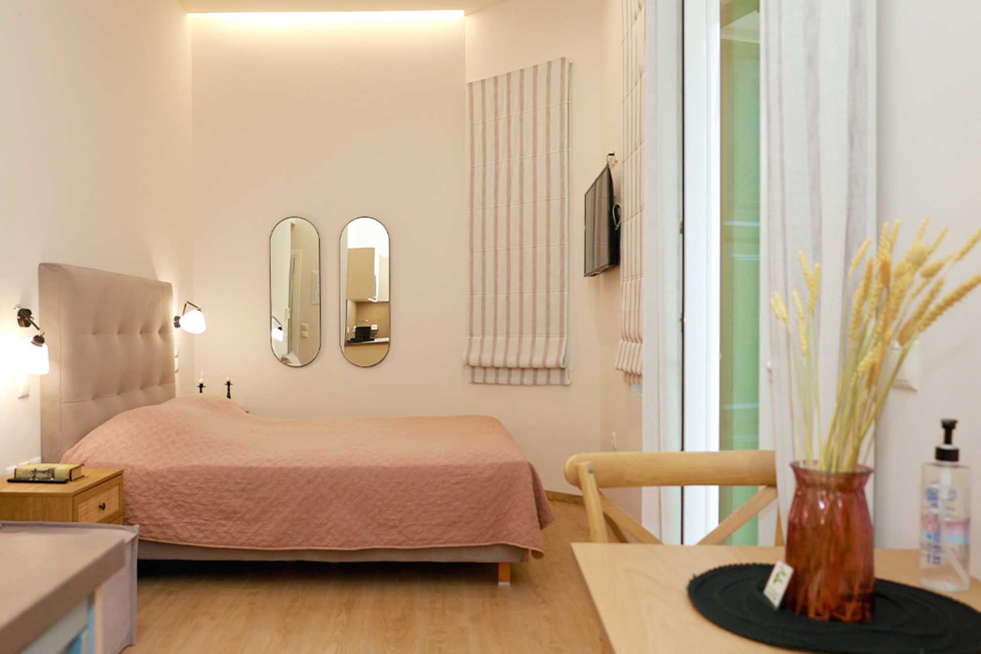 Større 1-værelses lejlighed med fransk balkon. Soveværelse kombineret med minikøkken. En dobbeltseng eller to enkeltsenge. Mulighed for ekstra opredning i sovesofa. Minikøkken med kogeplader, køleskab, mikrobølgeovn, el-kedel, kaffemaskine og enkelt køkkenudstyr. Gratis wifi, aircondition og deponering. Tv med internationale kanaler. Vaskemaskine. Badekåber. Hårtørrer. Badeværelse med bruser og toilet. Rengøring 6 gange om ugen.