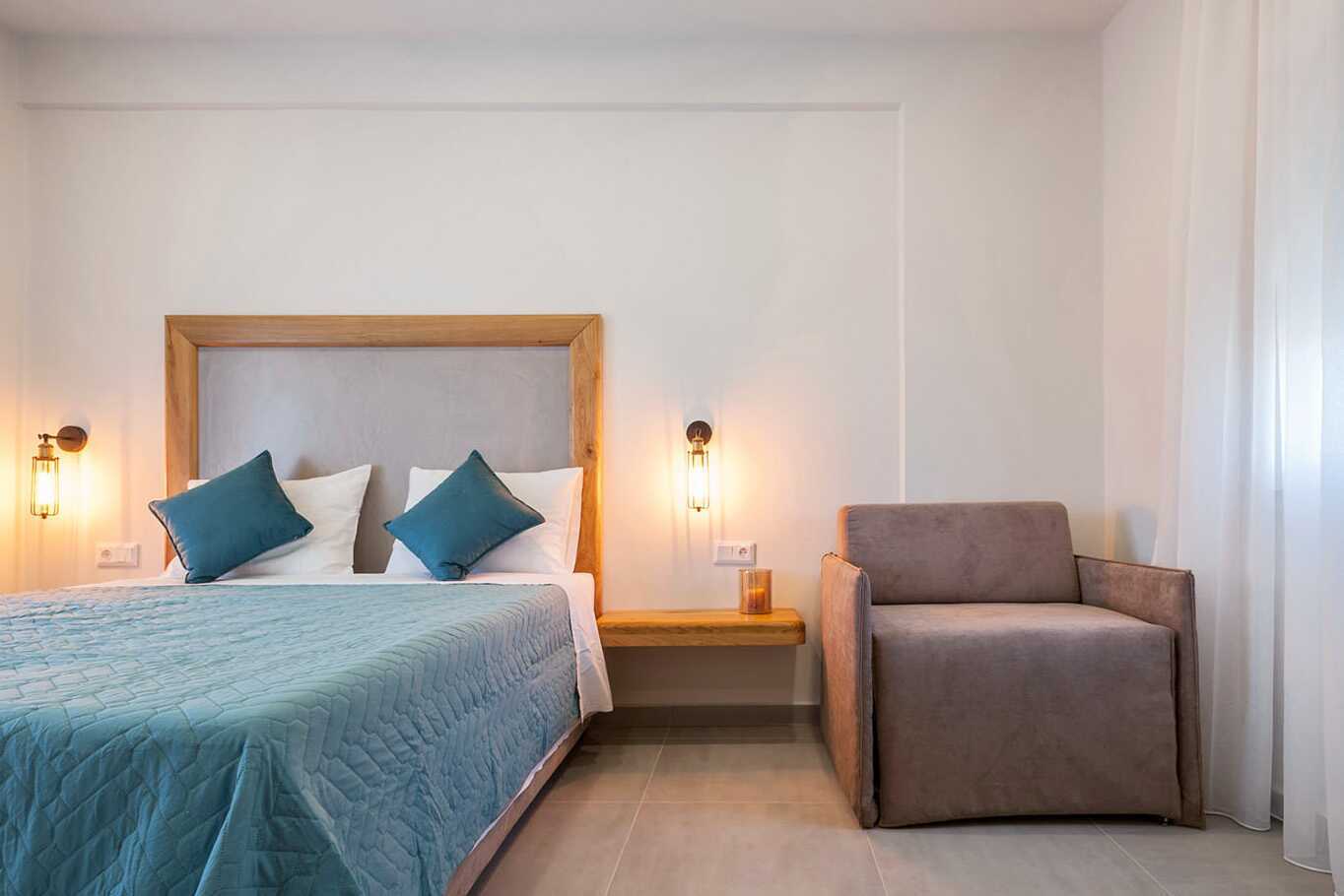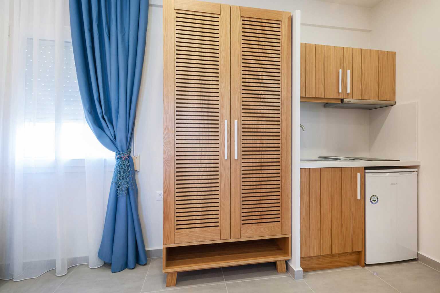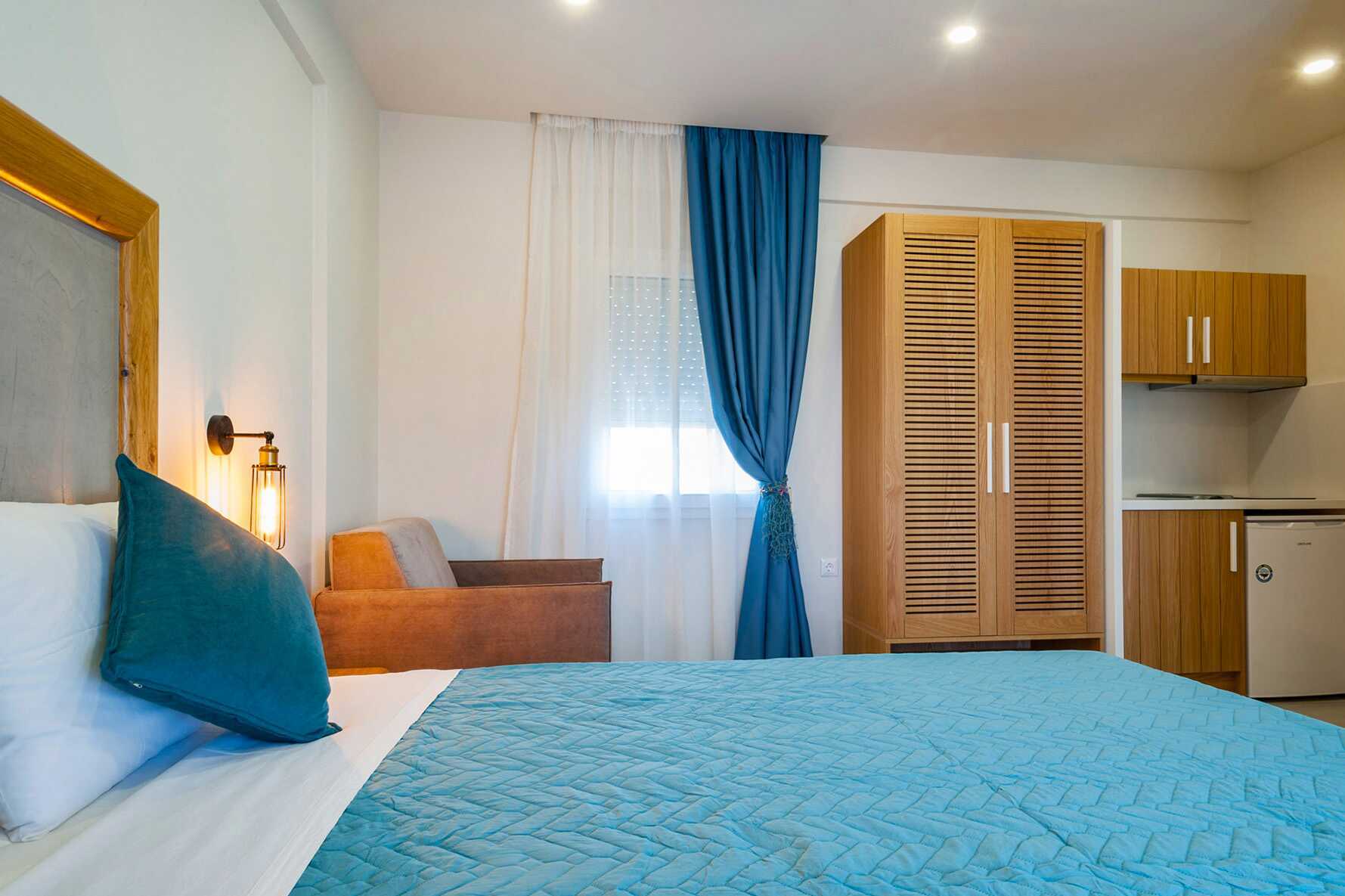 Rummelige 1-værelses lejligheder med balkon og havudsigt eller terrasse i stueplan. En dobbeltseng eller to separate senge. Minikøkken med kogeplader, køleskab og fryser samt enkelt køkkenudstyr. Tv. Gratis wifi og aircondition. Hårtørrer. Badekar/bruser og toilet. Rengøring 6 gange om ugen.