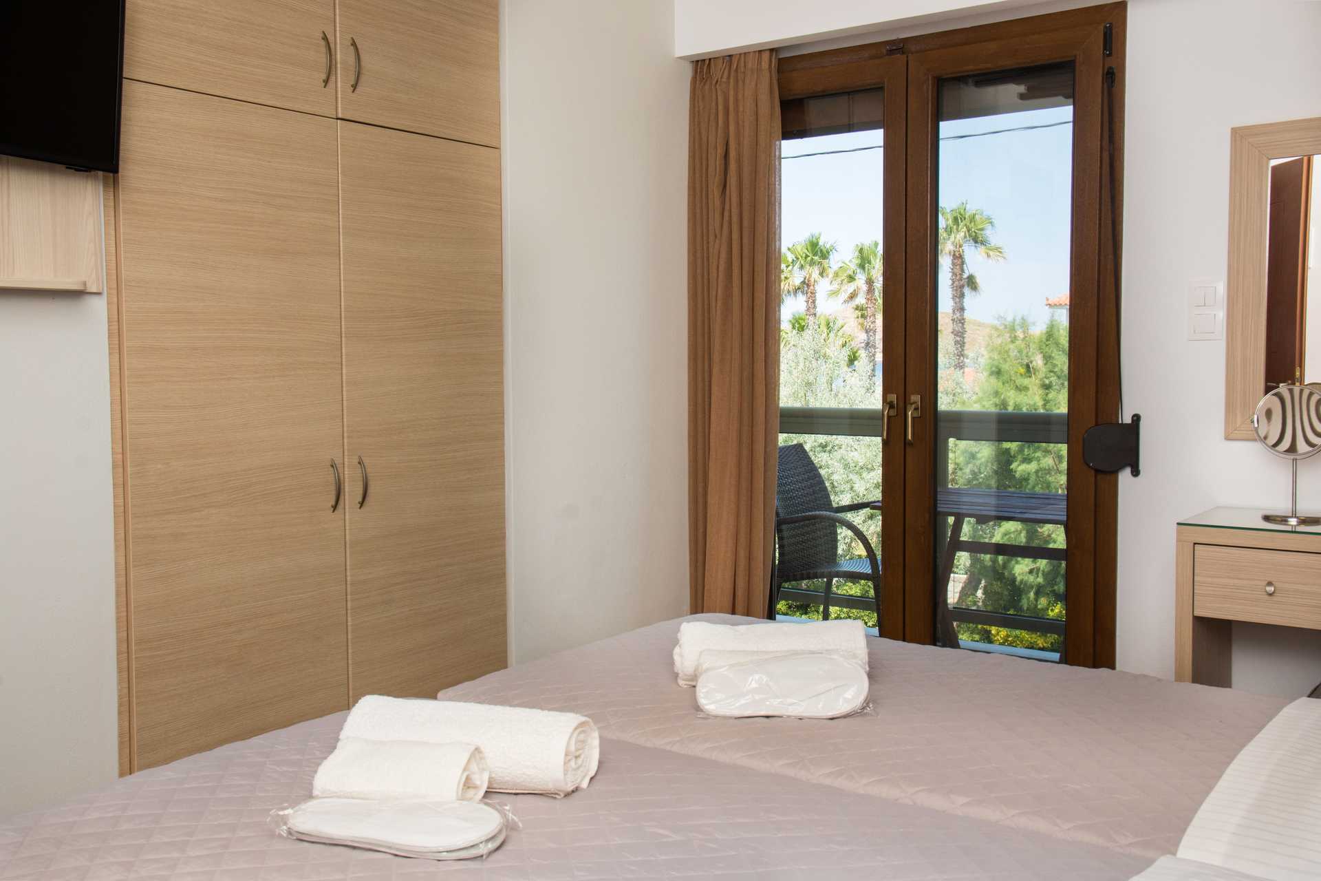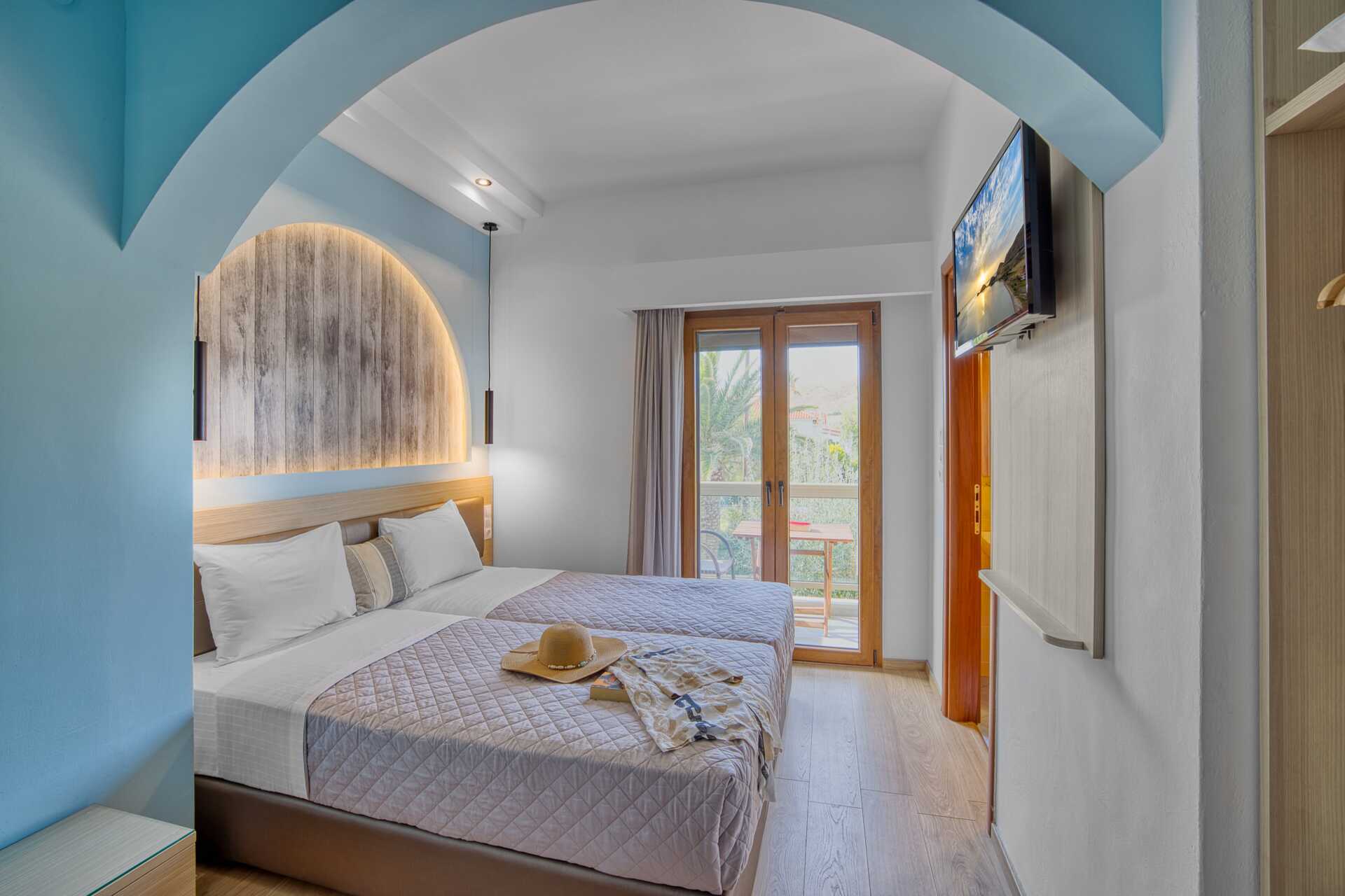 Dobbeltværelser med balkon, nogle med delvis havudsigt eller terrasse i stueplan. To enkeltsenge. Mulighed for en ekstra opredning til en tredje person i værelser med terrasse i stueplan. Gratis wifi, aircondition og deponering. Køleskab. Tv med lokale kanaler. Hårtørrer. Badeværelse med bruser og toilet. Rengøring 6 gange om ugen.