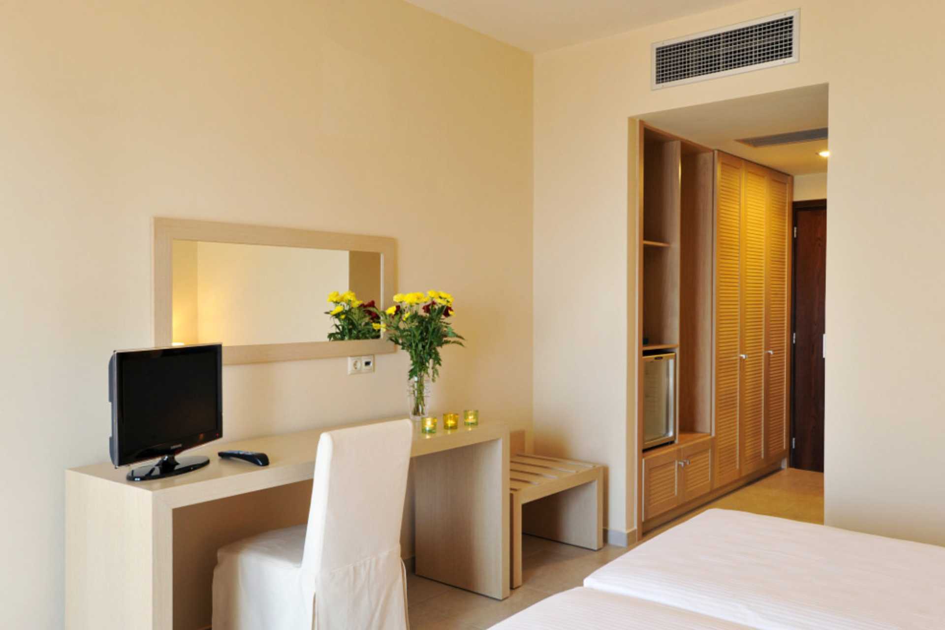 Dobbeltværelser med balkon eller terrasse. En dobbeltseng eller to enkeltsenge. Gratis wifi, aircondition og deponering. Køleskab - en flaske vand indgår ved ankomst. El-kedel og kaffe/te. Gratis wifi, aircondition og deponering. Tv med internationale kanaler. Hårtørrer. Badeværelse med badekar/bruser og toilet. Rengøring 7 gange om ugen.