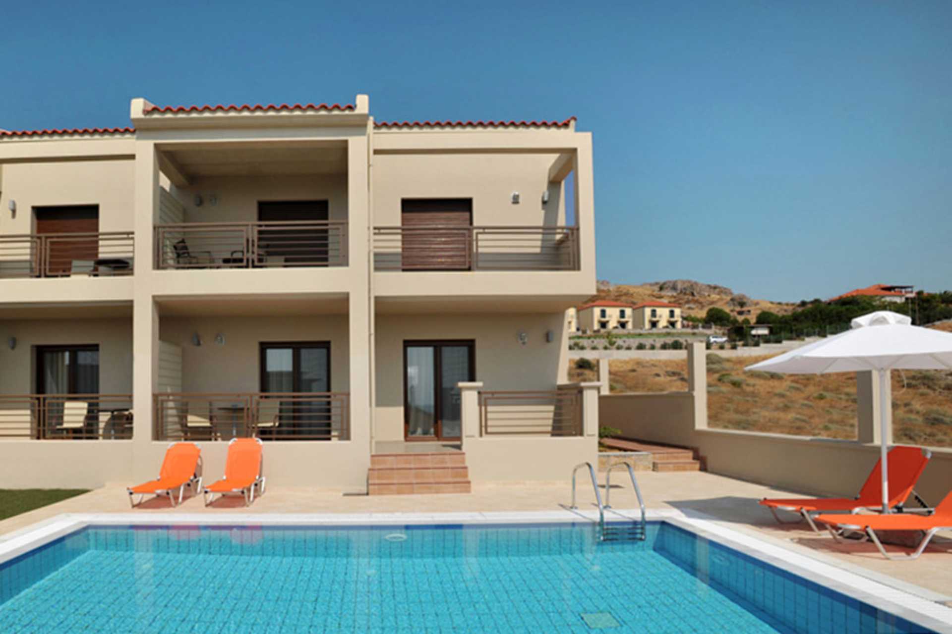 Suite med privat pool og balkon med havudsigt. Suiten består af et soveværelse og et opholdsrum. Trappe fra balkonen ned til poolområdet med pool, solstole og parasoller. En dobbeltseng. Mulighed for ekstra opredning i sovesofa. Gratis wifi, aircondition og deponering. Køleskab - en flaske vand indgår ved ankomst. Tv med internationale kanaler. Hårtørrer. Badeværelse med badekar/bruser og toilet. Rengøring 7 gange om ugen.