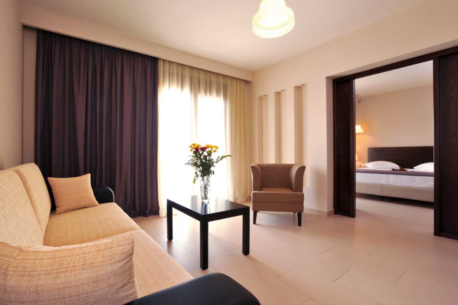 Suite med balkon og havudsigt. Suiten består af et soveværelse og et opholdsrum. En dobbeltseng. Mulighed for ekstra opredning i sovesofa. Gratis wifi, aircondition og deponering. Køleskab - en flaske vand indgår ved ankomst. El-kedel og kaffe/te. Tv med internationale kanaler. Hårtørrer. Badeværelse med badekar/bruser og toilet. Rengøring 7 gange om ugen.