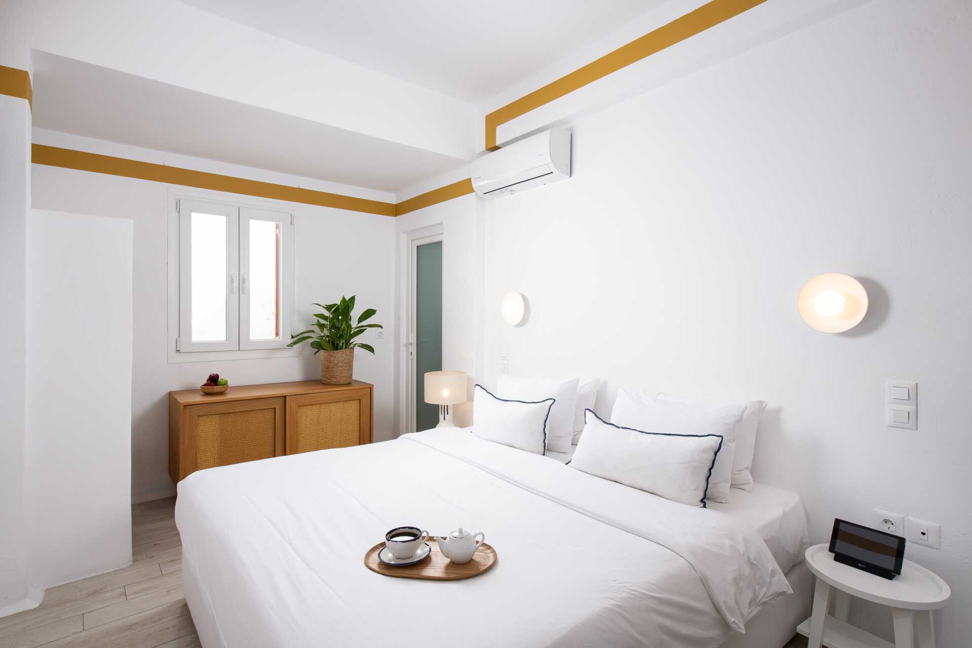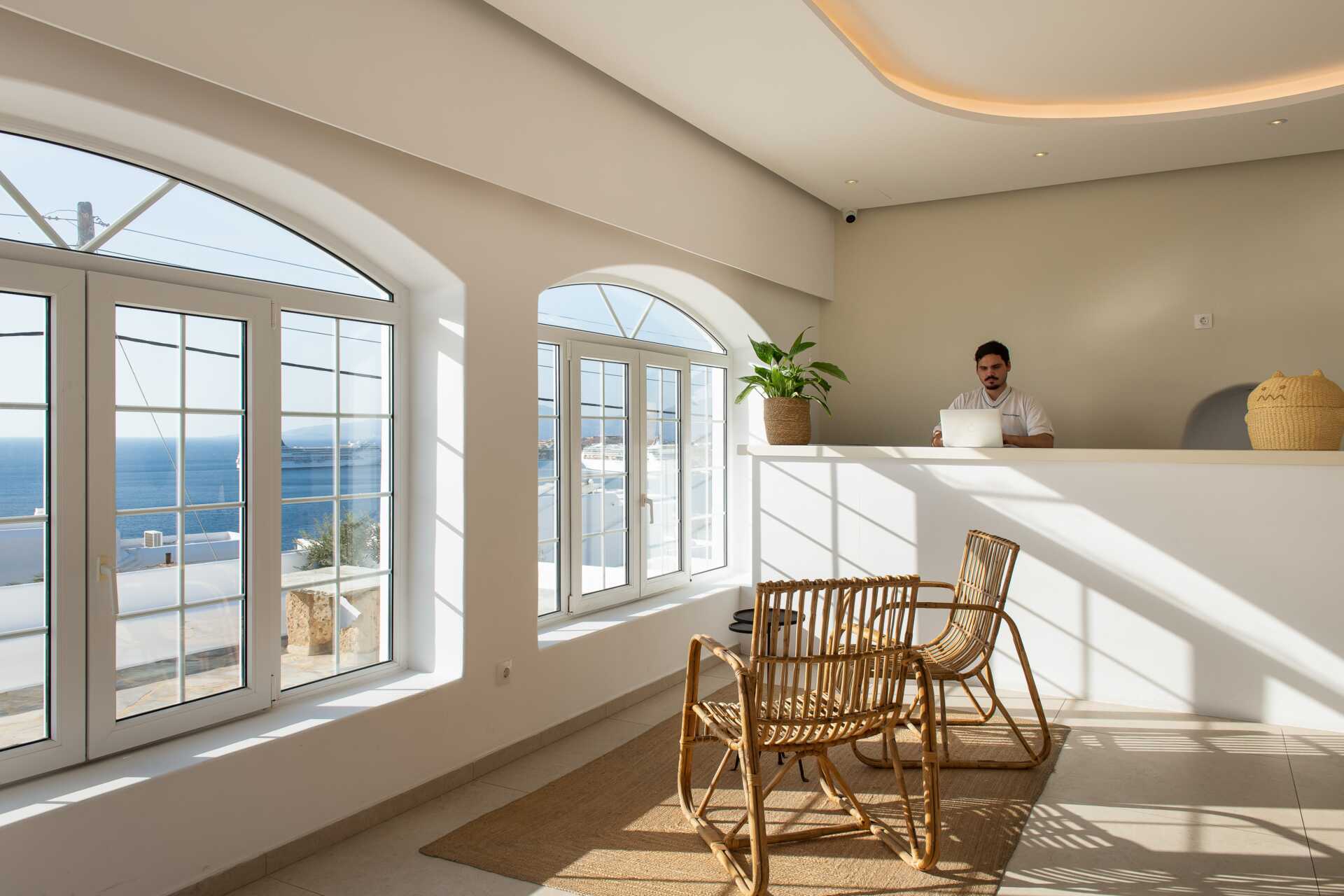 Med hvidkalkede vægge og rene, moderne interiørdetaljer har hotellet en kykladisk arkitektur, der skaber et harmonisk og afslappende miljø.