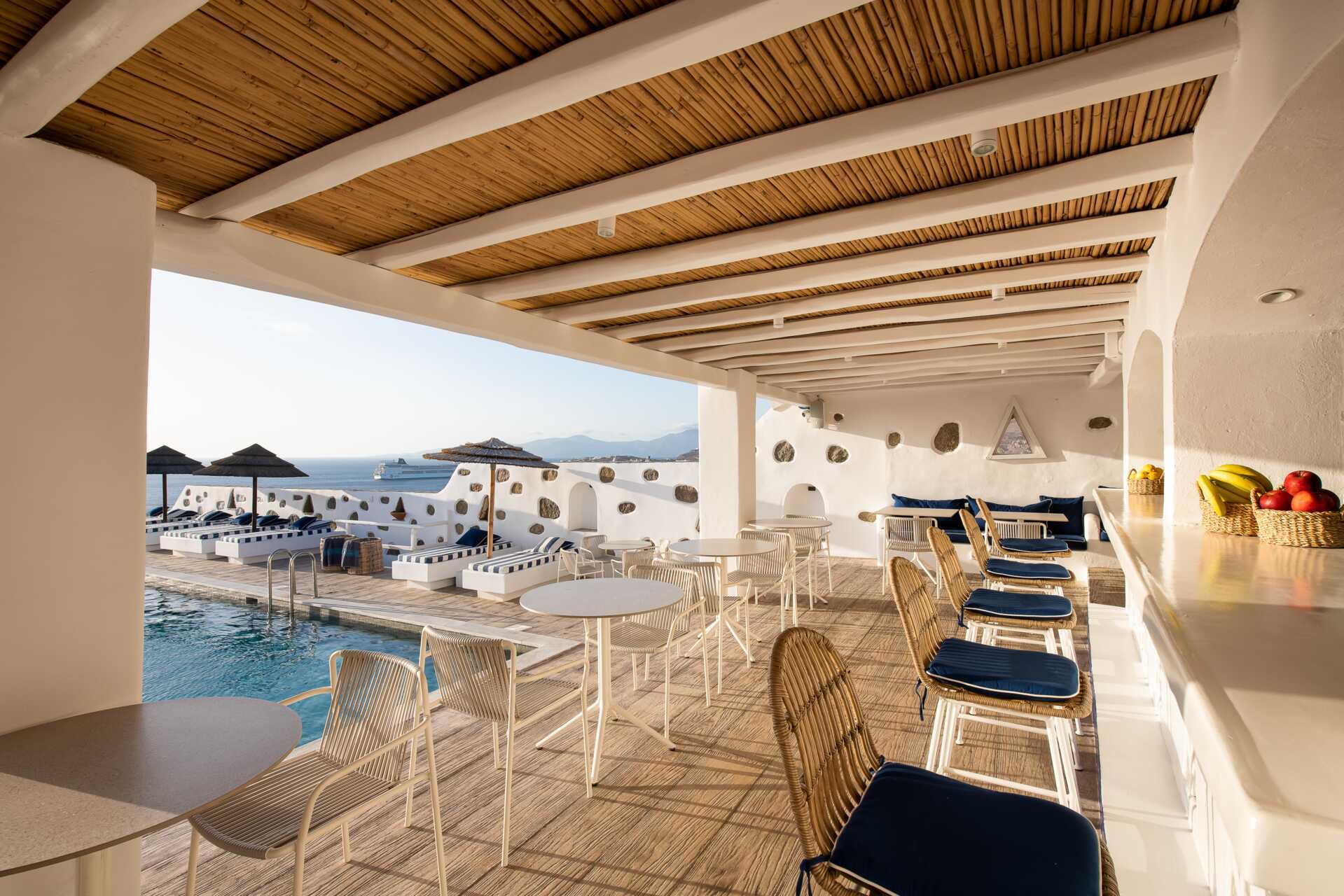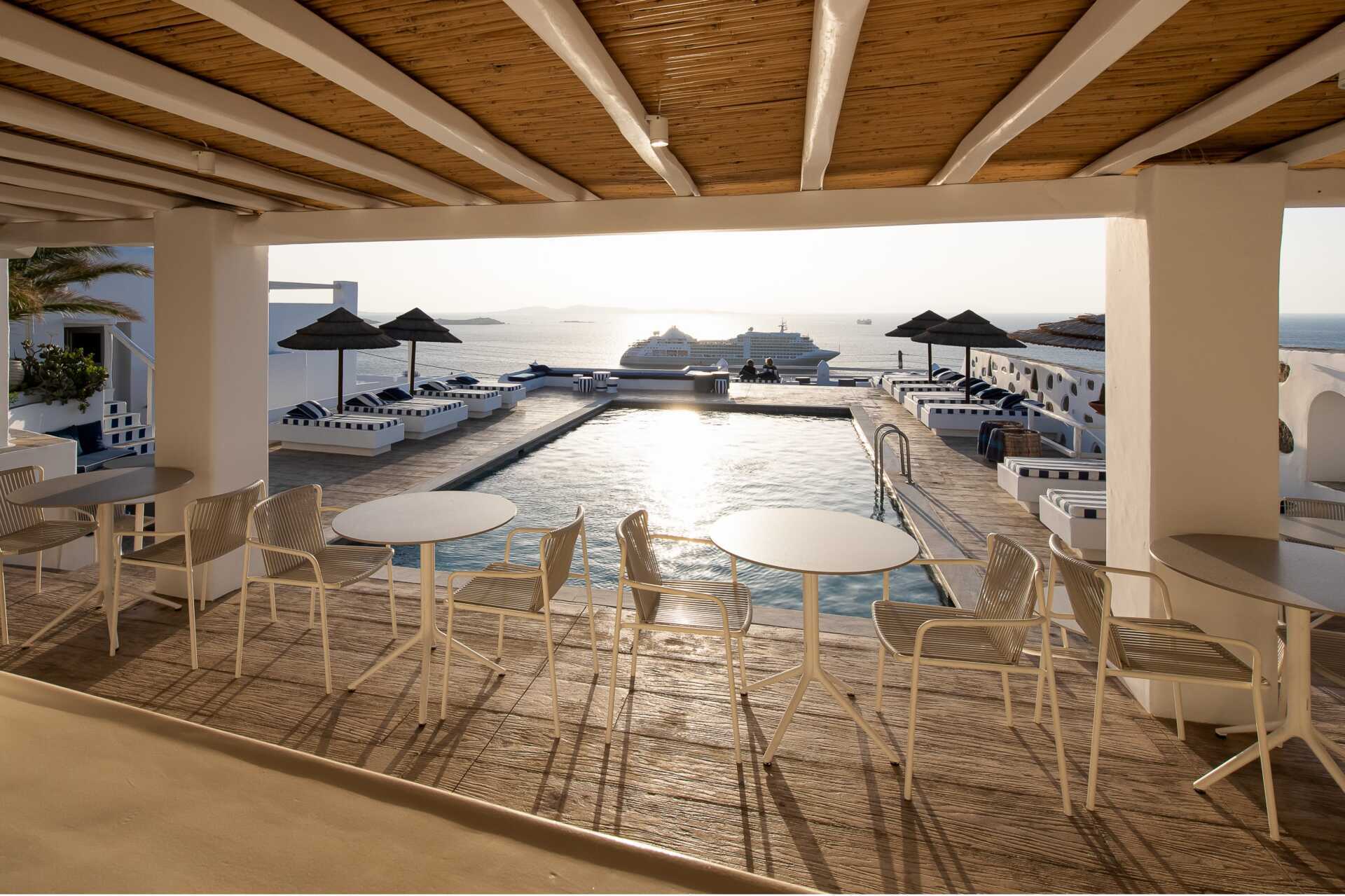 Tagoo Mykonos er et lille hotel i kykladisk stil. Fra hotellets tagterrasse venter en fantastisk udsigt over Det Ægæiske Hav og den livlige by. Hotellet henvender sig til et voksent publikum og tilstræber en rolig atmosfære. Aldersgrænsen for at bo på hotellet er 12 år.