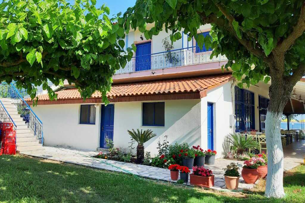 Delfinia Mytikas har enkle dobbeltværelser lige ud til havet og har en dejlig have.