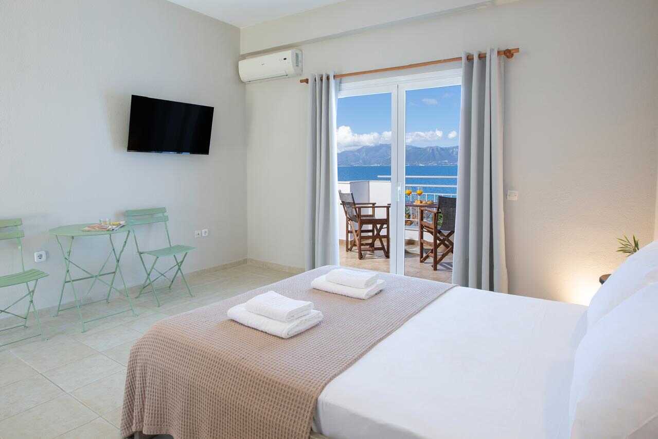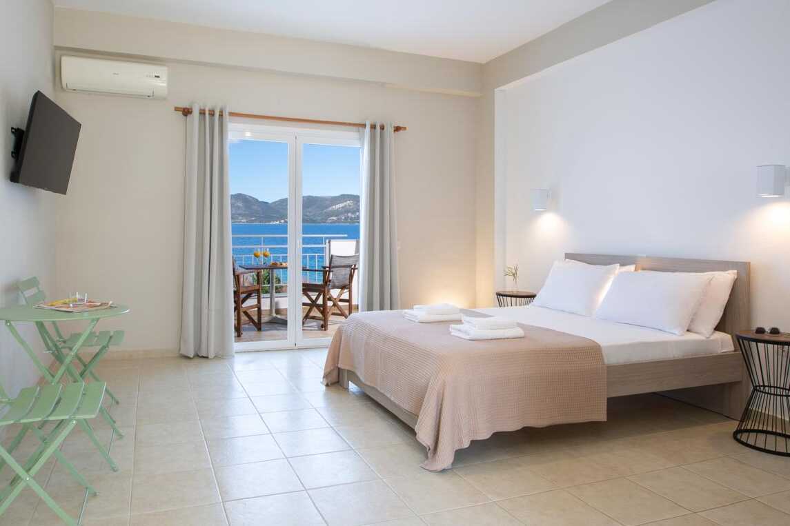Dobbeltværelse med terrasse i stueplan og delvis havudsigt eller med balkon og havudsigt. En dobbeltseng. Mulighed for ekstra opredning i enkeltseng. Gratis wifi, aircondition og deponering. Lille køleskab. El-kedel og kaffe/te. Tv med internationale kanaler. Badeværelse med bruser og toilet. Rengøring 6 gange om ugen.