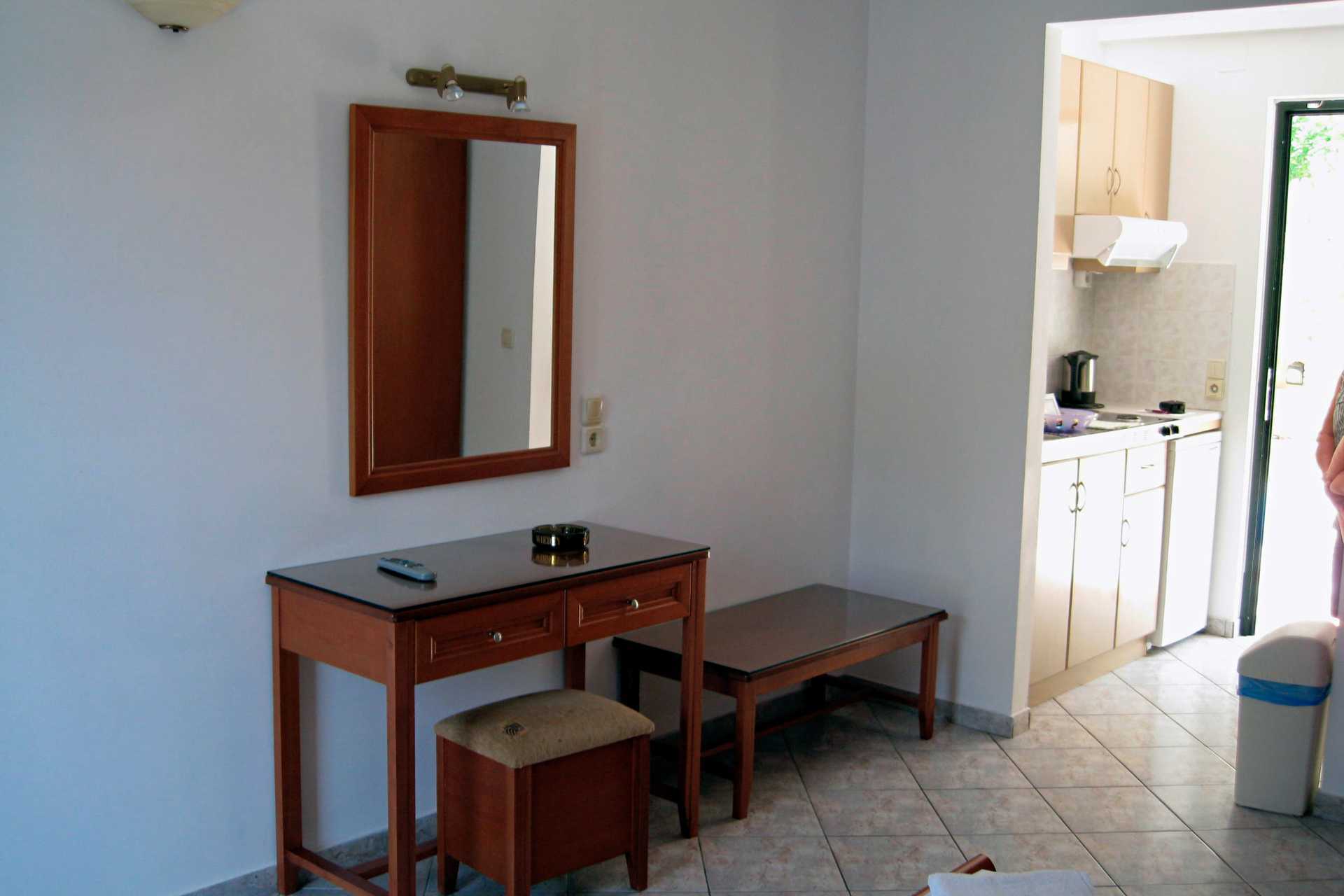 1-værelses lejlighed med balkon eller terrasse i stueplan. Soveværelse kombineret med minikøkken. Spiseplads på terrassen. To enkeltsenge. Minikøkken med køleskab, kogeplader, el-kedel og enkelt køkkenudstyr. Gratis wifi. Aircondition og deponering mod betaling. Tv med internationale kanaler. Hårtørrer. Badeværelse med bruser og toilet. Rengøring 6 gange om ugen. Børn under to år tæller med i det maksimale antal personer på værelset.