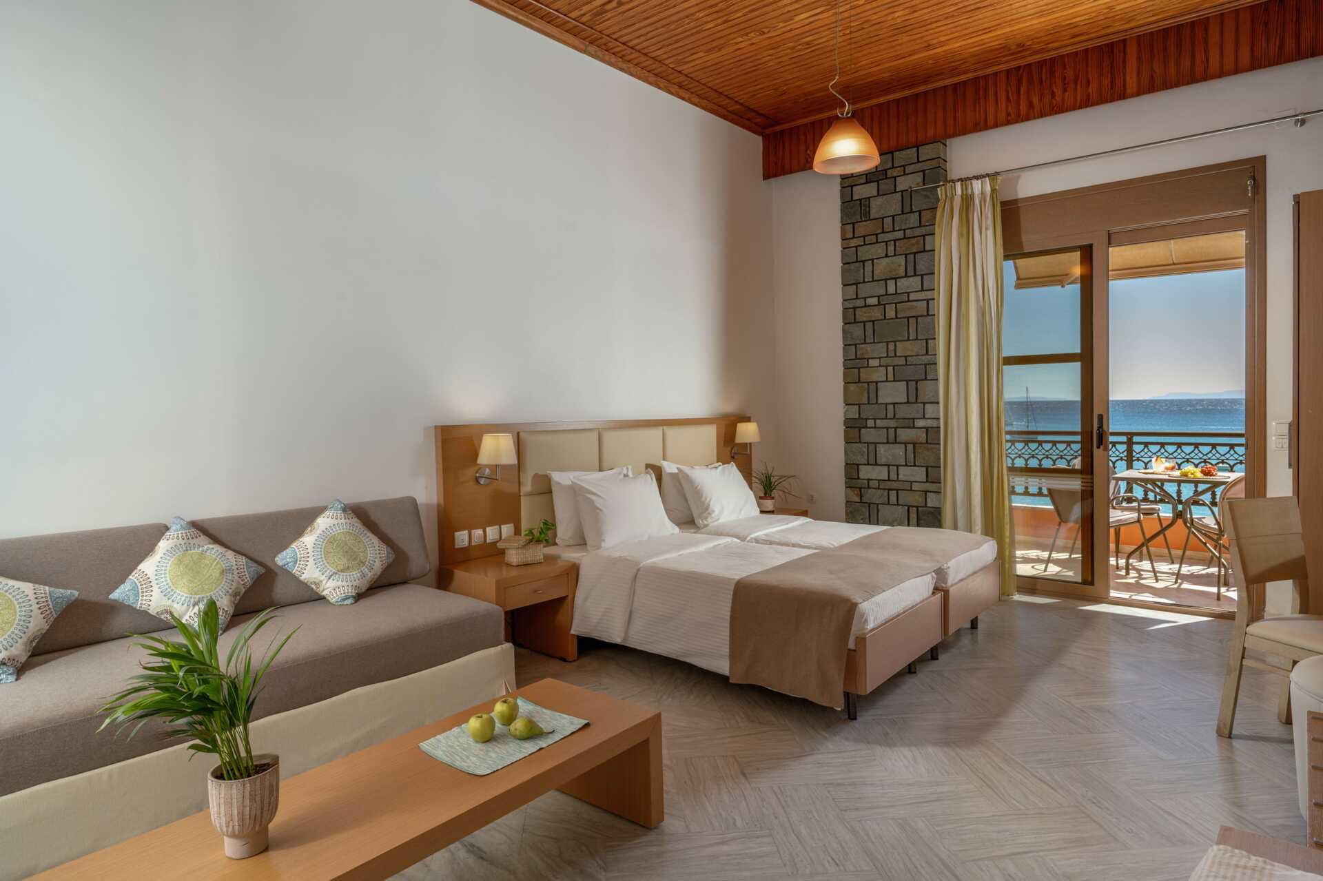 Større 1-værelses lejlighed med balkon og havudsigt. Varierende størrelse. Soveværelse med kombineret minikøkken. To enkeltsenge. Mulighed for ekstra opredninger i sovesofa. Minikøkken med kogeplader, køleskab, kaffemaskine, el-kedel, brødrister og enkelt køkkenudstyr. Gratis wifi og aircondition. Deponering mod betaling. Tv med internationale kanaler. Hårtørrer. Badeværelse med bruser og toilet. Rengøring 6 gange om ugen.