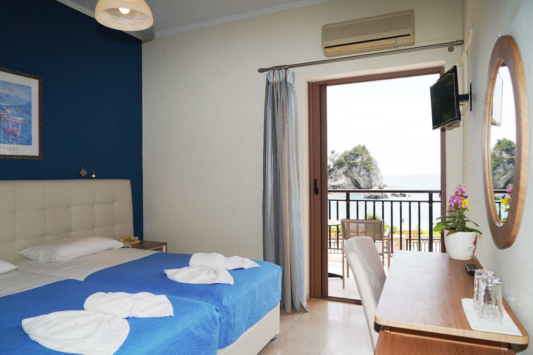 Deluxe-værelse med balkon og havudsigt. En dobbeltseng eller to enkeltsenge. Mulighed for ekstra opredning i sovesofa. Gratis wifi, aircondition og deponering. Køleskab. Tv med internationale kanaler. Hårtørrer. Badeværelse med bruser og toilet. Rengøring 7 gange om ugen.