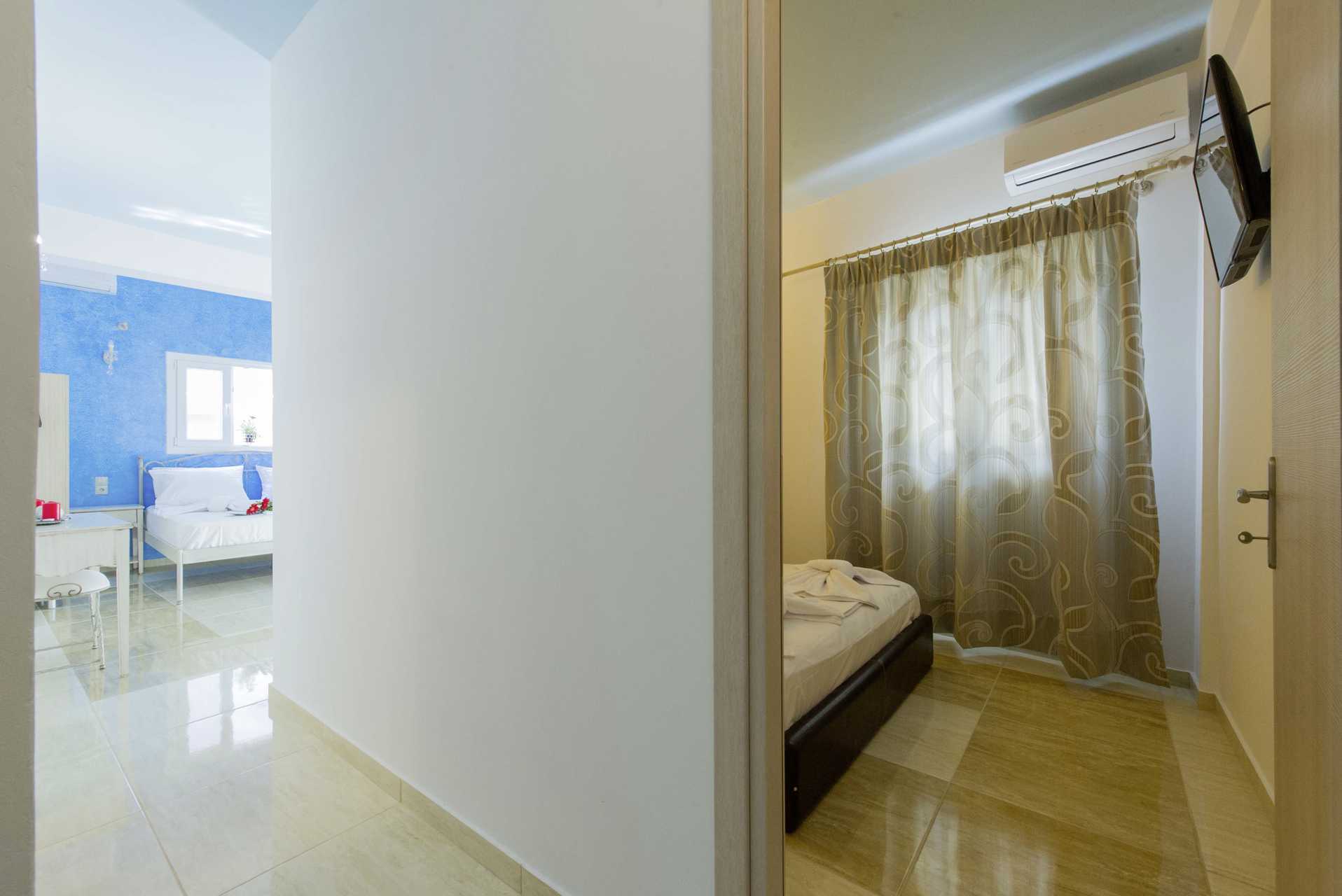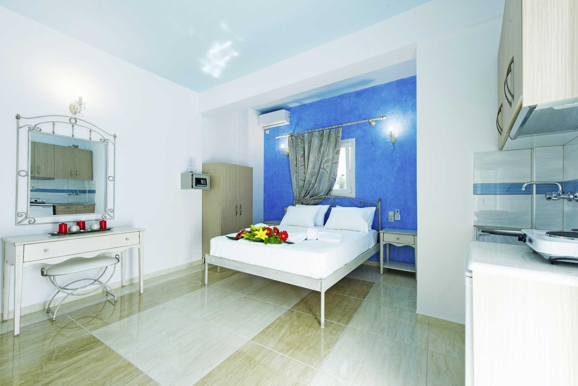 1-værelses lejlighed med balkon og pooludsigt eller med balkon i stueplan og pooludsigt. Kombineret soveværelse med minikøkken. En dobbeltseng eller to enkeltsenge. Mulighed for ekstra indkvartering i lejligheden med balkon i stueplan. Minikøkken med kogeplader, køleskab, kaffemaskine, el-kedel og enkelt køkkenudstyr. Gratis wifi. Aircondition og deponering mod betaling. Fra og med sommeren 2026 indgår aircondition og deponering. Tv med internationale kanaler. Hårtørrer. Badeværelse med bruser og toilet. Rengøring 6 gange om ugen.