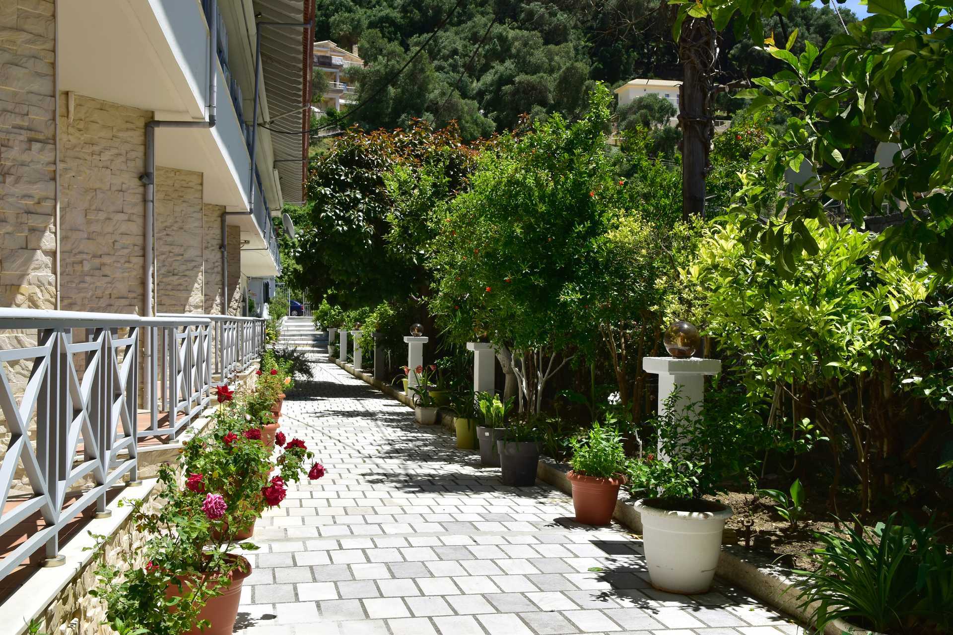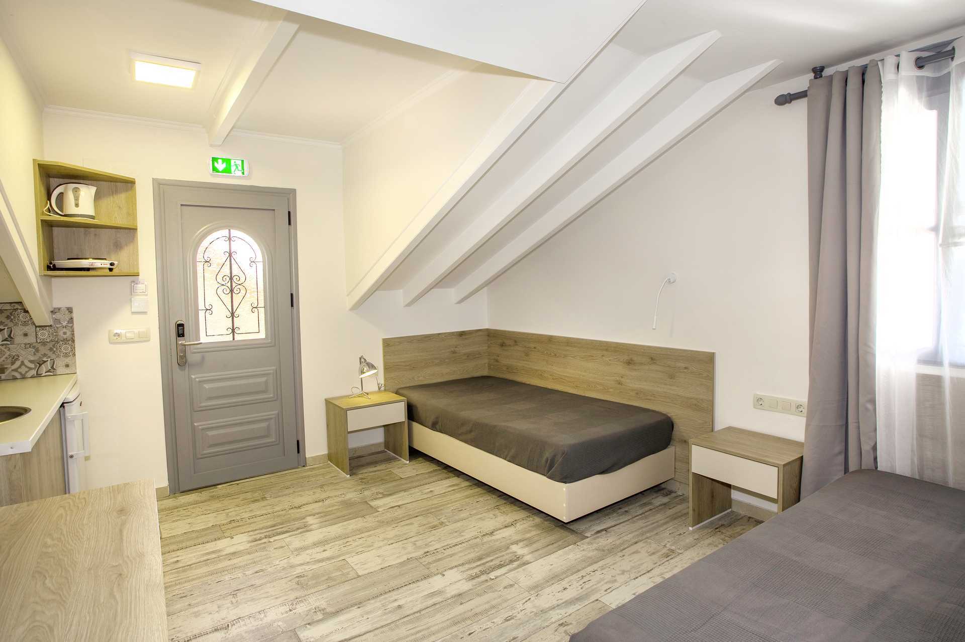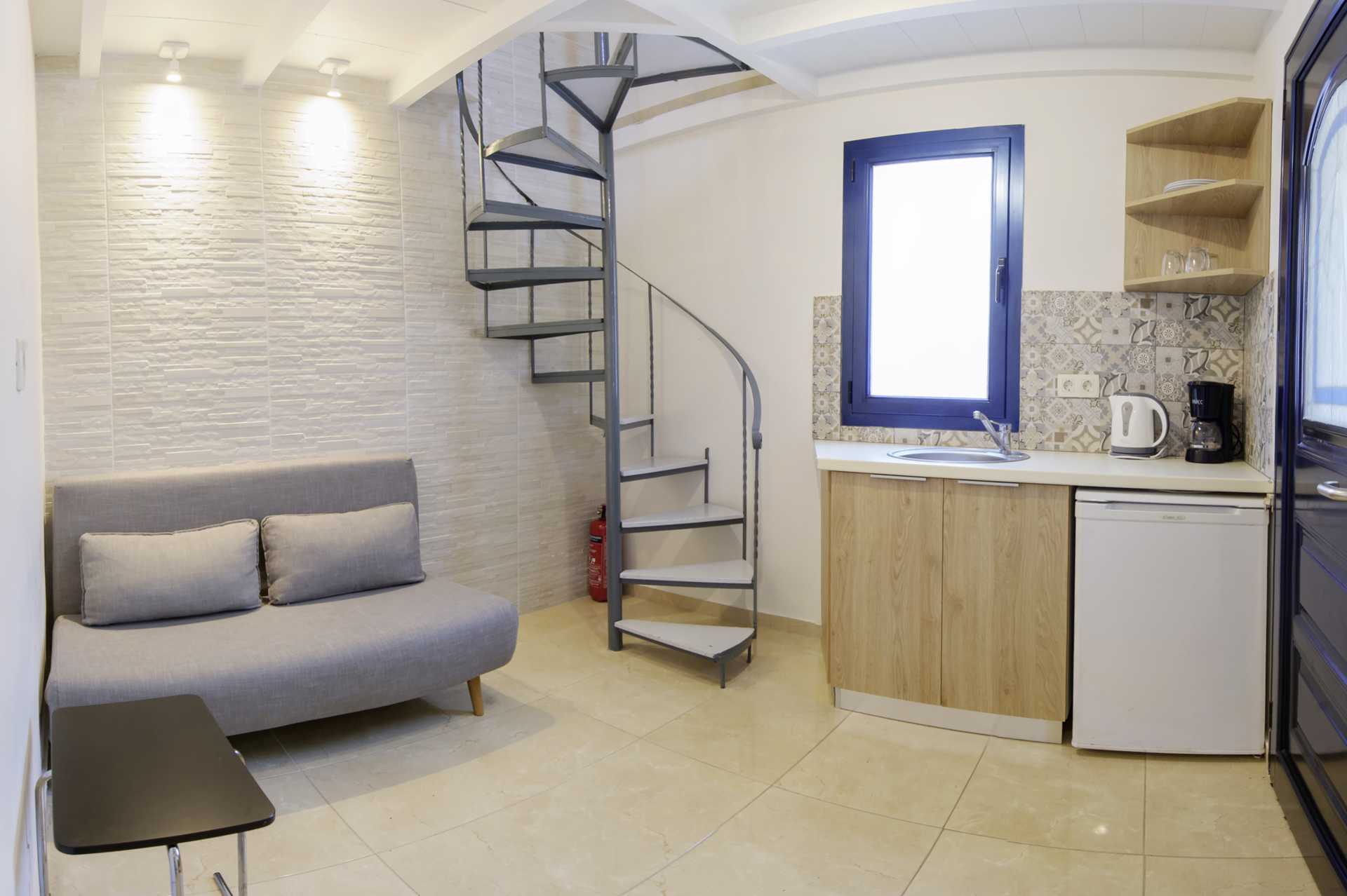 1-værelses lejlighed i etage med terrasse i stueplan eller delt udeplads. Lejlighederne ligger i hotellets sidebygning. I entréplan er der en kombineret opholdsrum med minikøkken og et badeværelse med hårtørrer, bruser og toilet. Minikøkken med køleskab, kogeplade, el-kedel og enkelt køkkenudstyr. Tv med internationale kanaler. Ovenpå er der en hems, som nås via en smal trappe. En dobbeltseng eller to enkeltsenge. Gratis wifi, aircondition og deponering. Rengøring 7 gange om ugen.